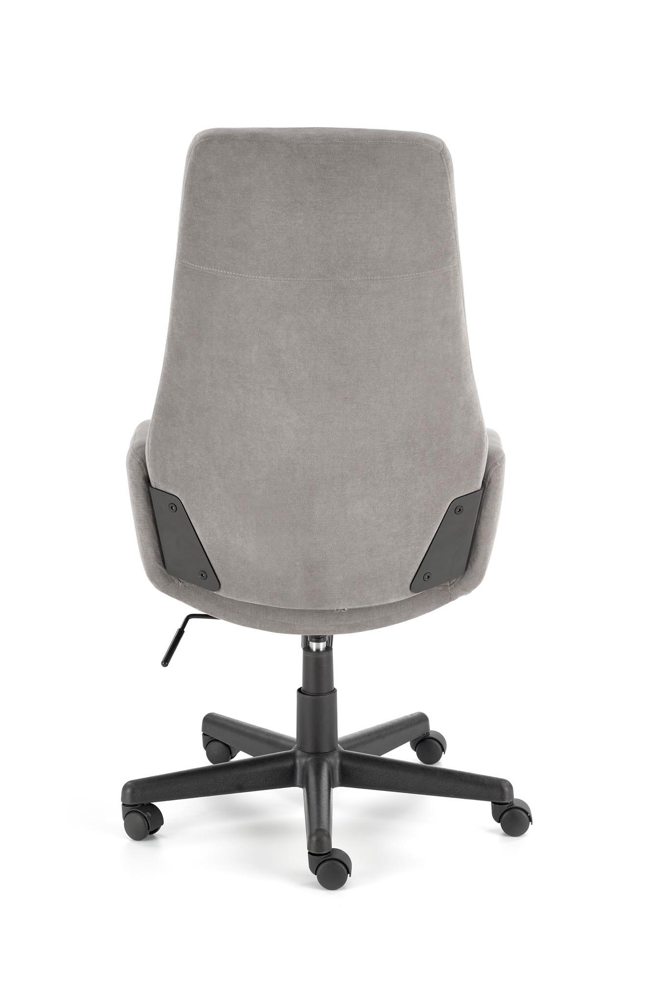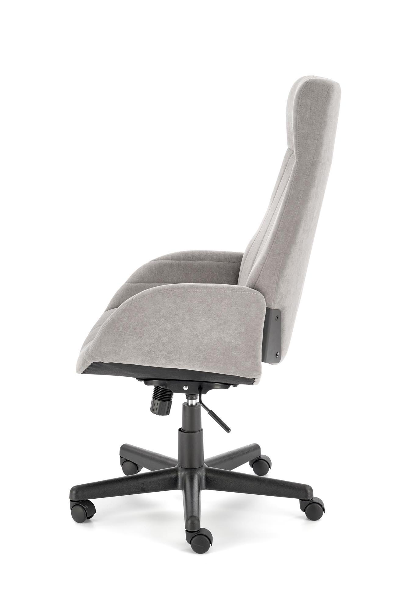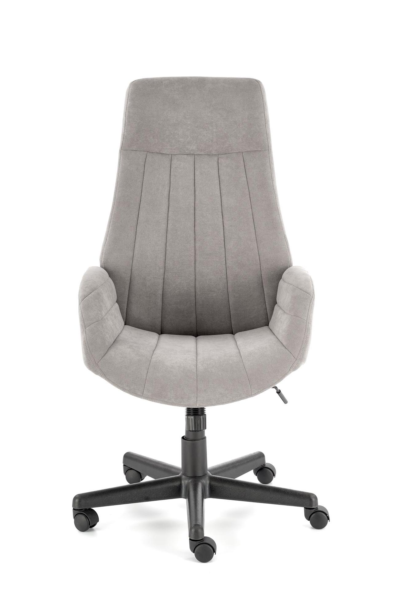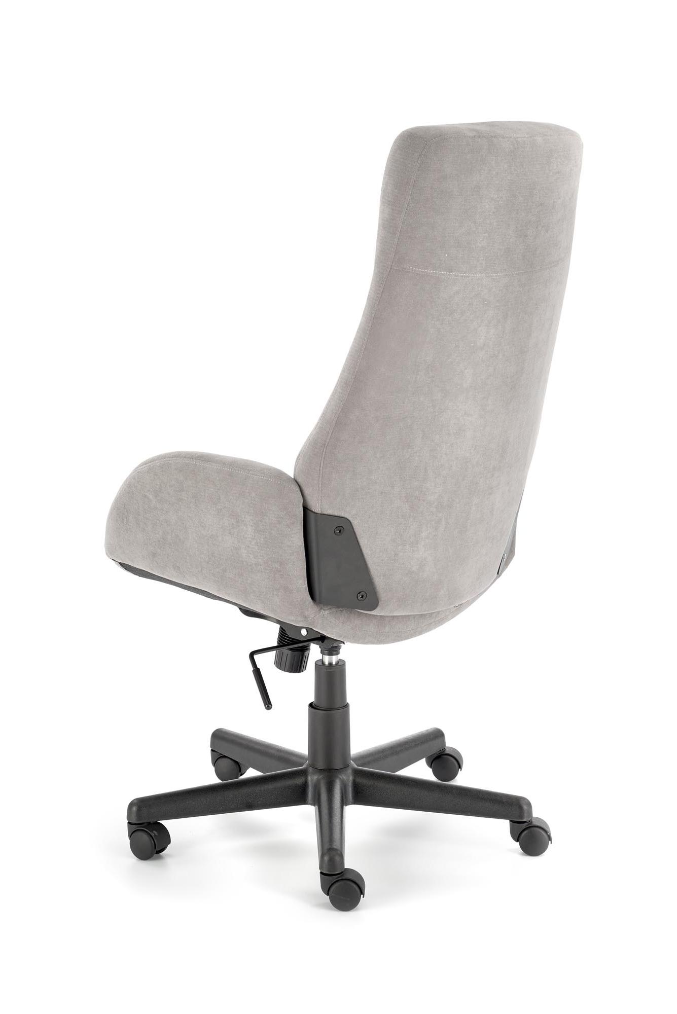 Biurowy fotel w popielatej tapicerce, kubełkowa konstrukcja