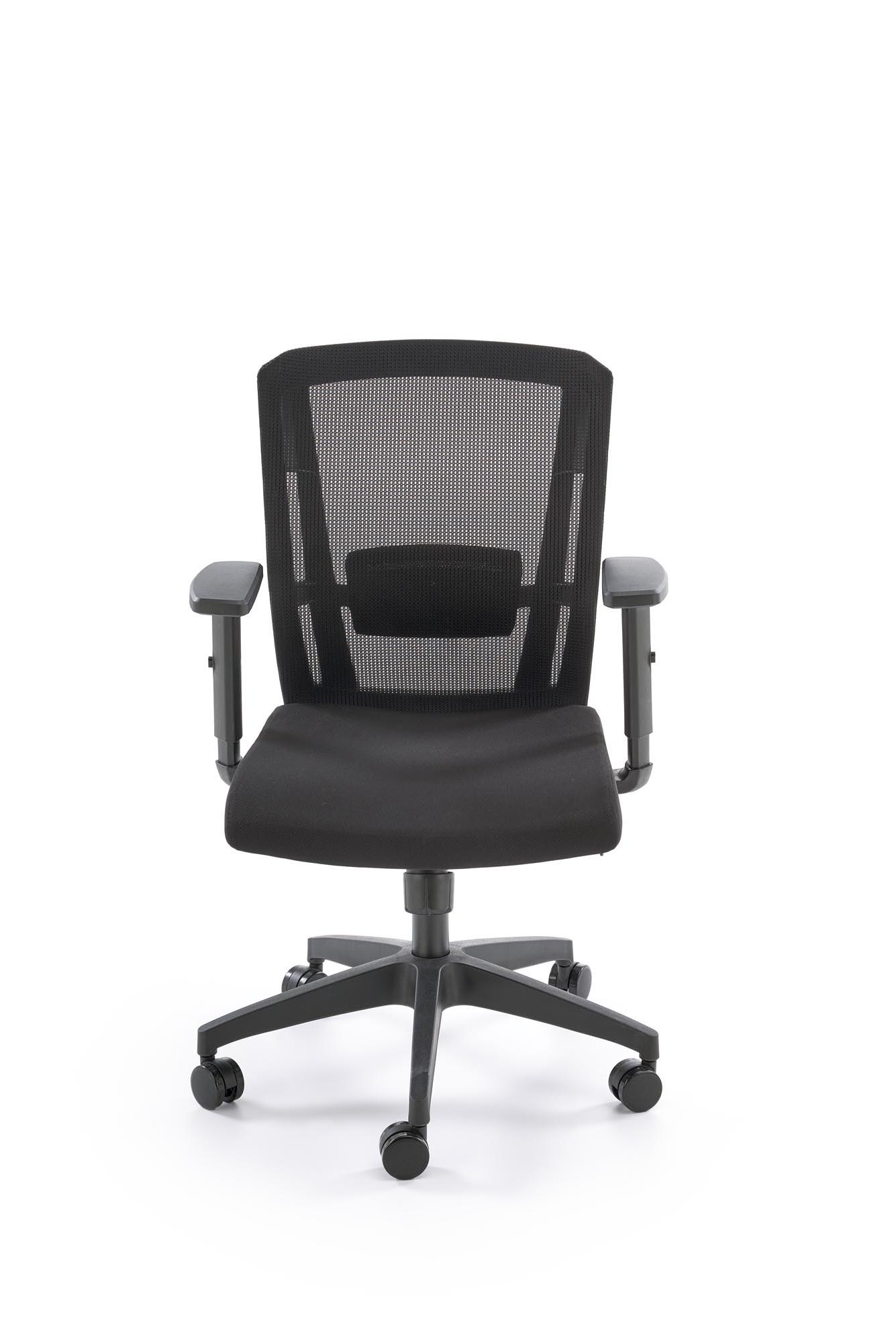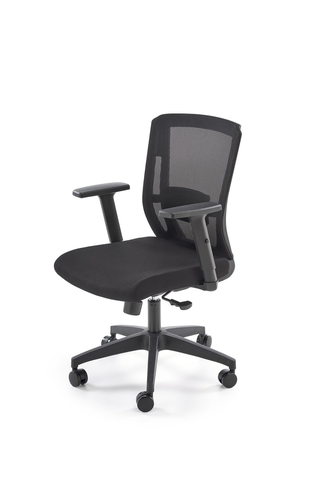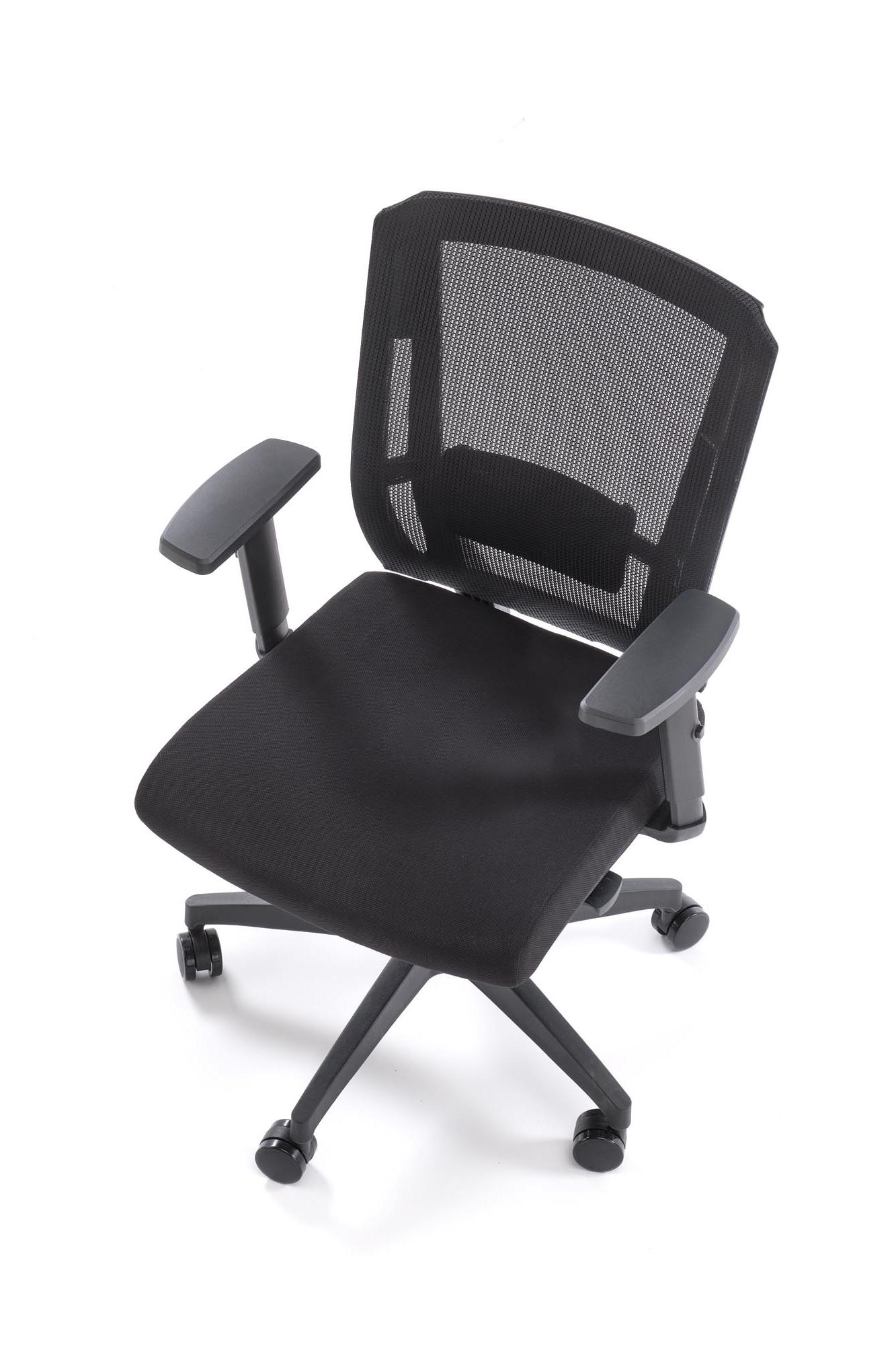 Fotel do biurka kolor czarny, oparcie siatka, czarna obrotowa podstawa, podłokietniki regulowane, kółka kauczukowe