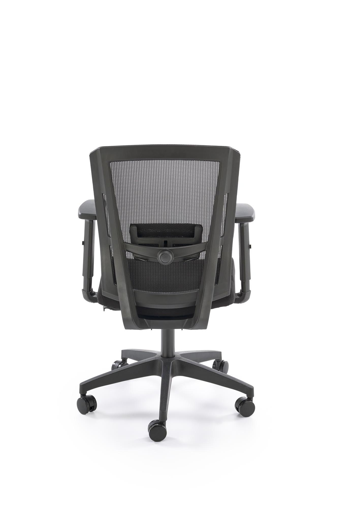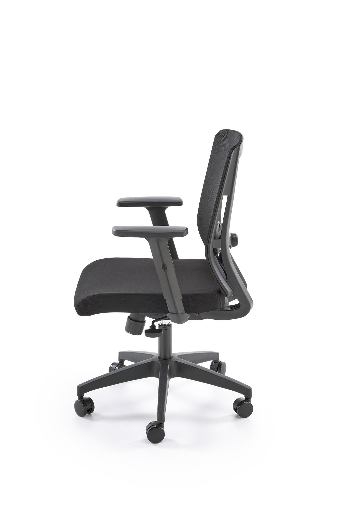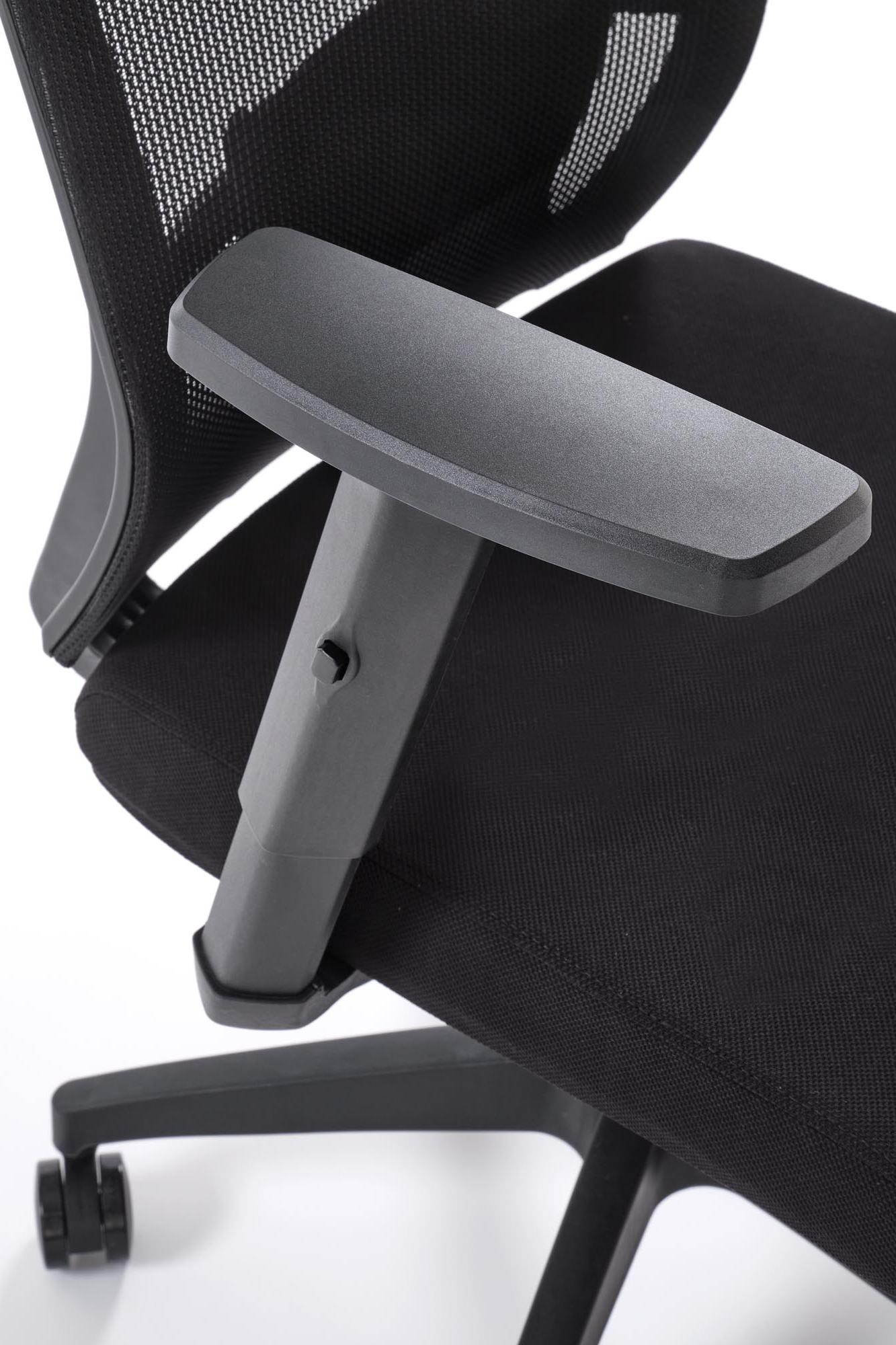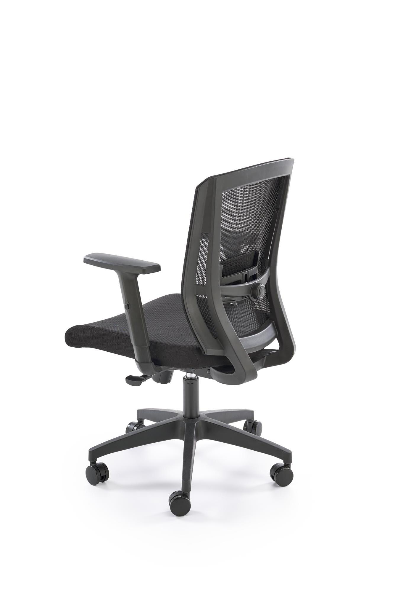 Fotel do biurka kolor czarny, oparcie siatka, czarna obrotowa podstawa, podłokietniki regulowane, kółka kauczukowe