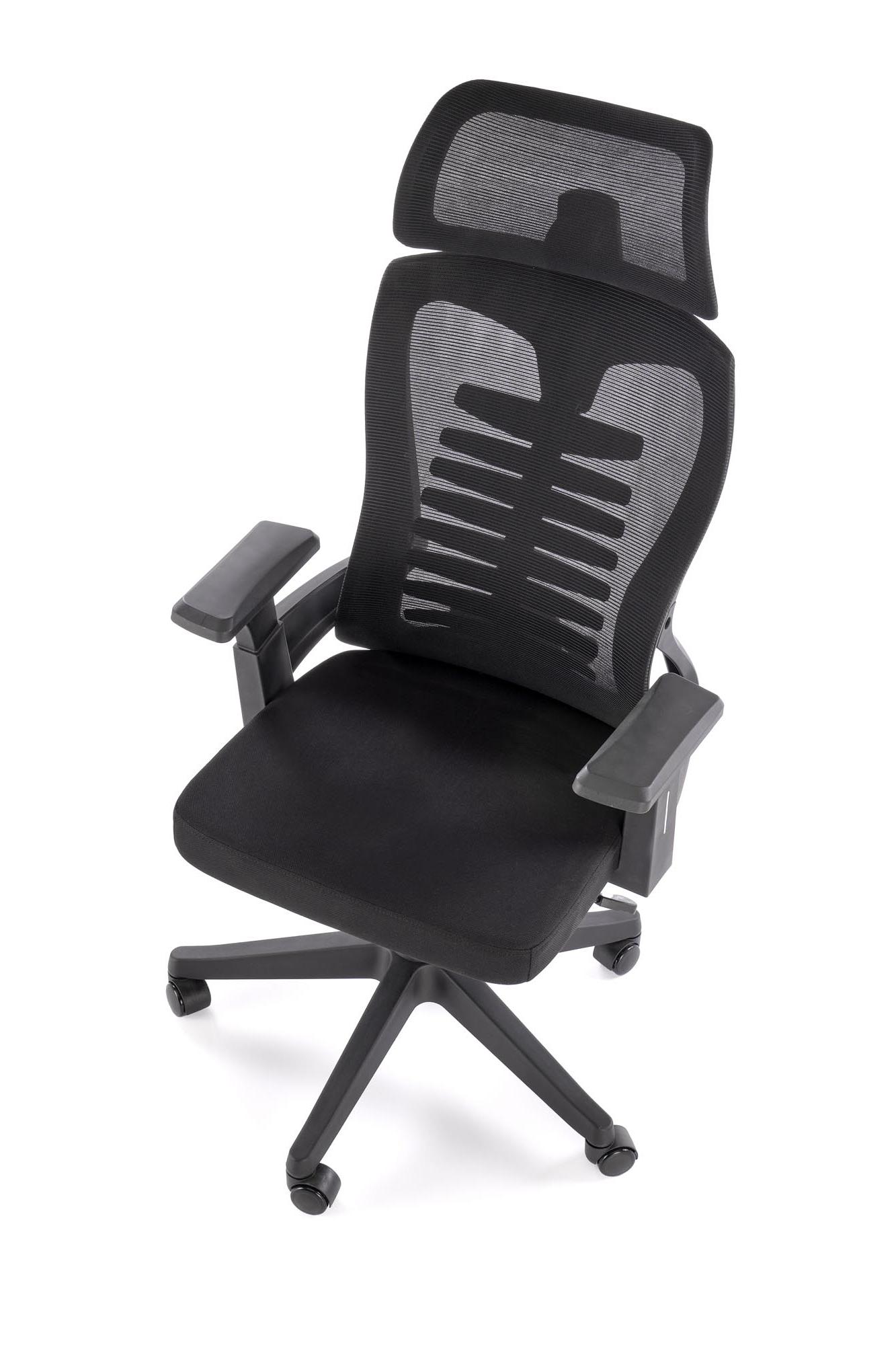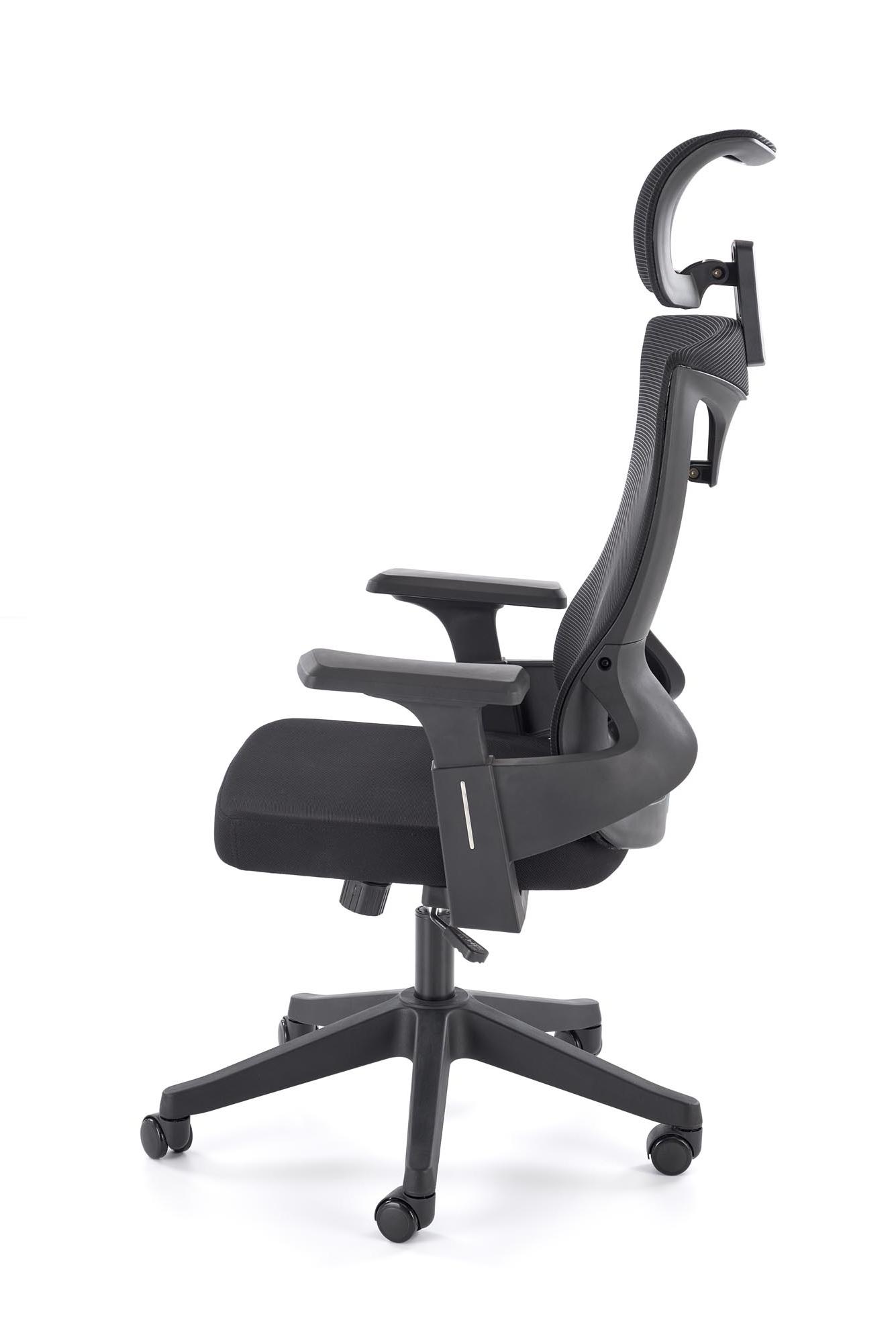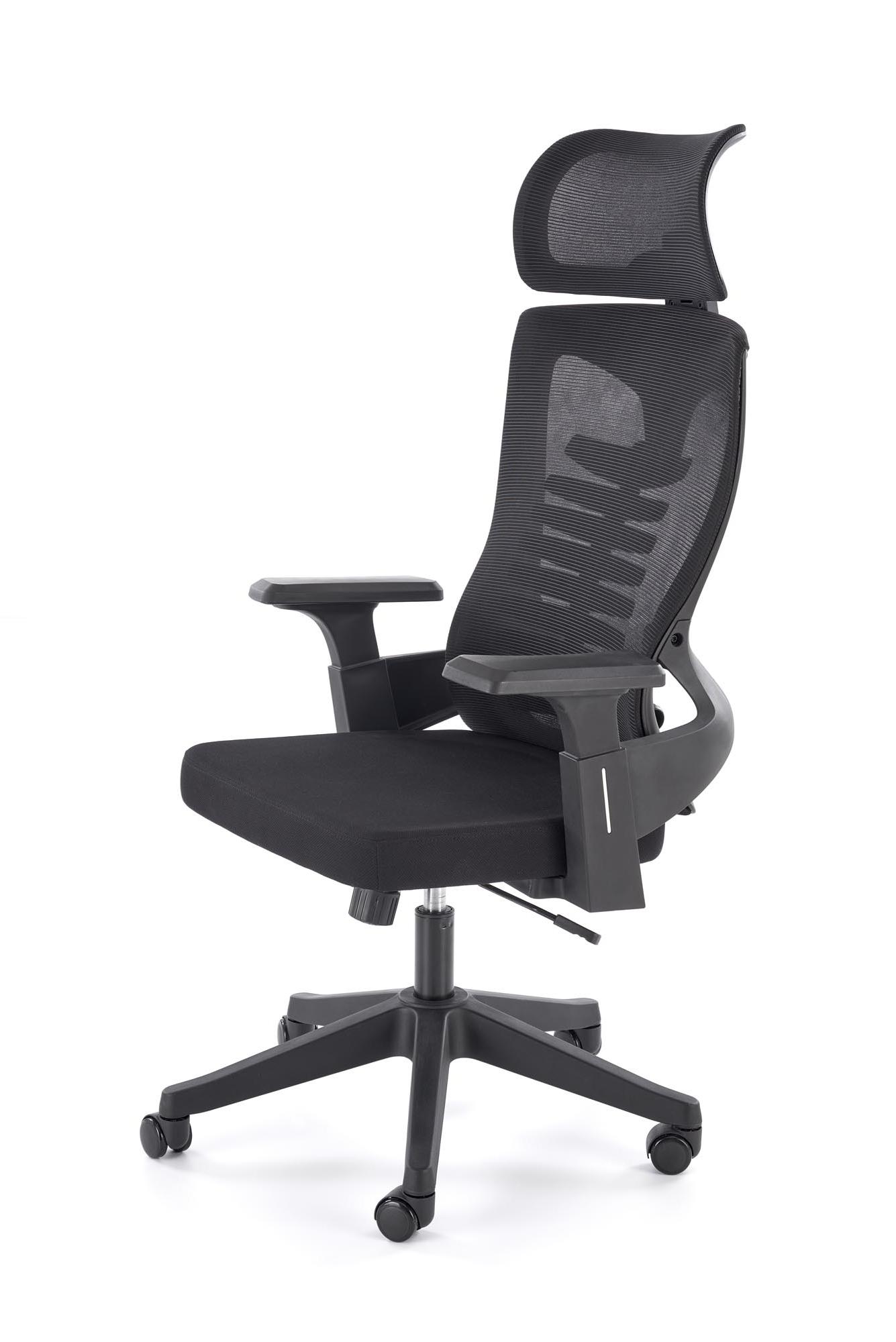Fotel do biurka nowoczesny, czarny z zagłówkiem, tkanina membranowa i siatka, kółka kauczukowe