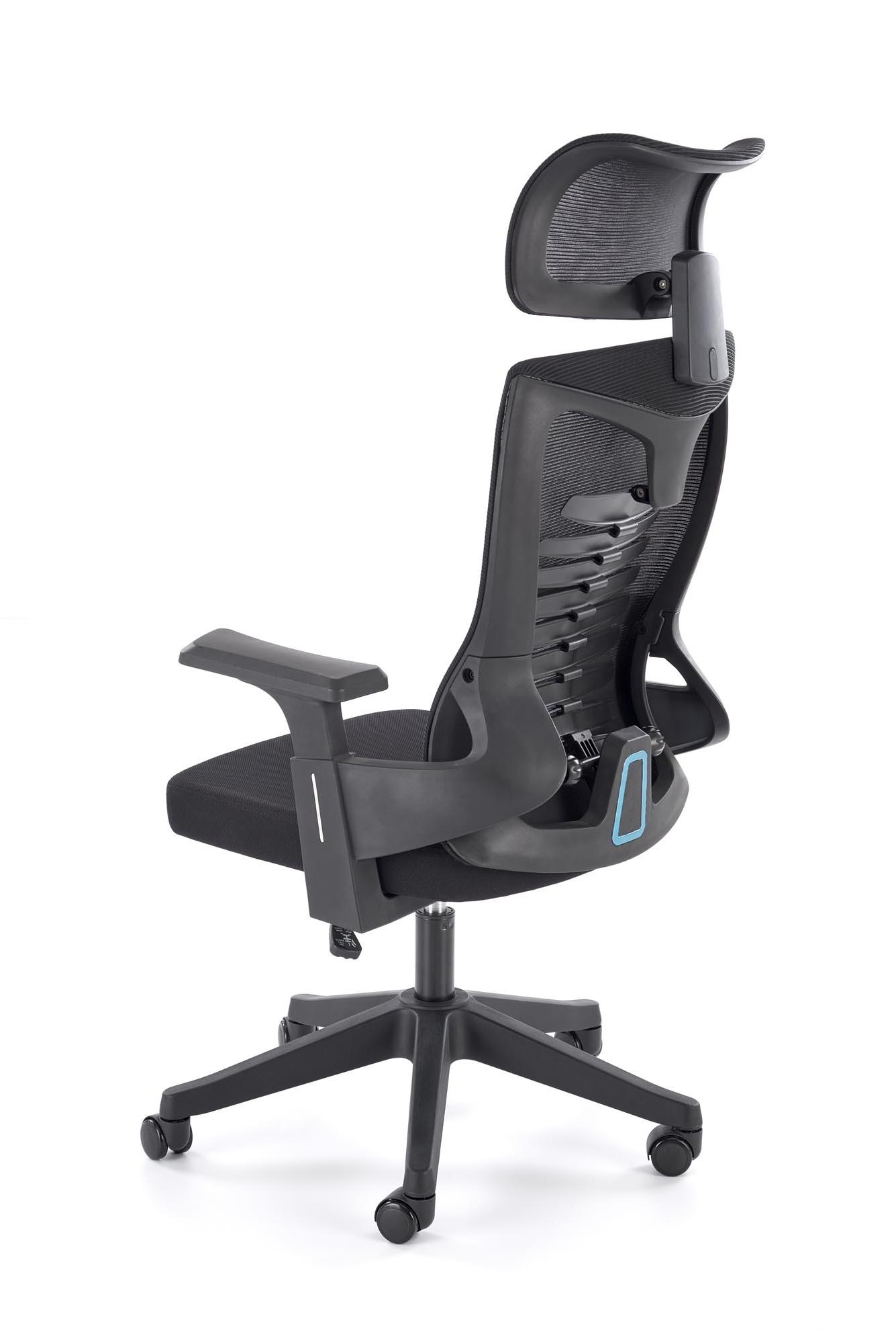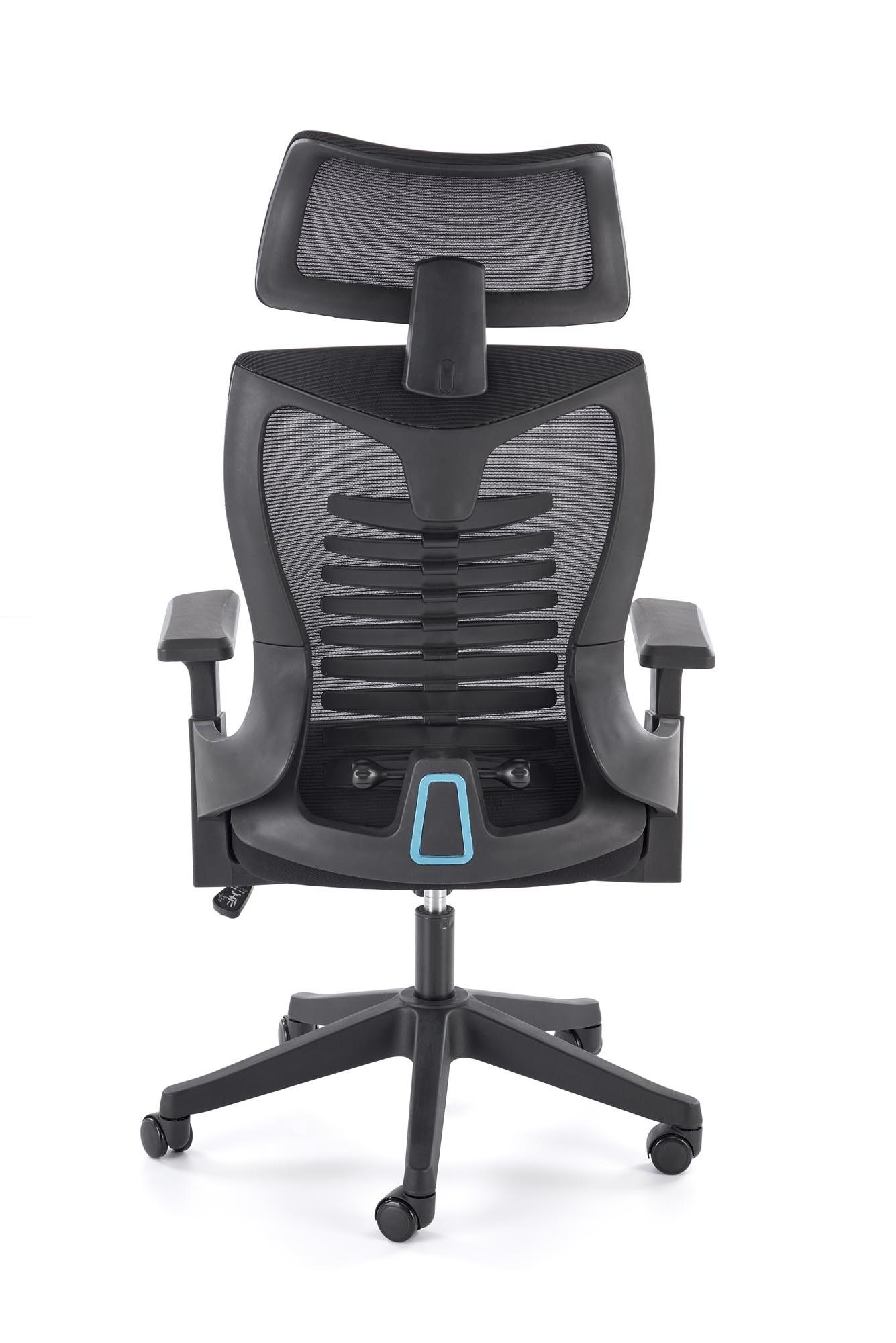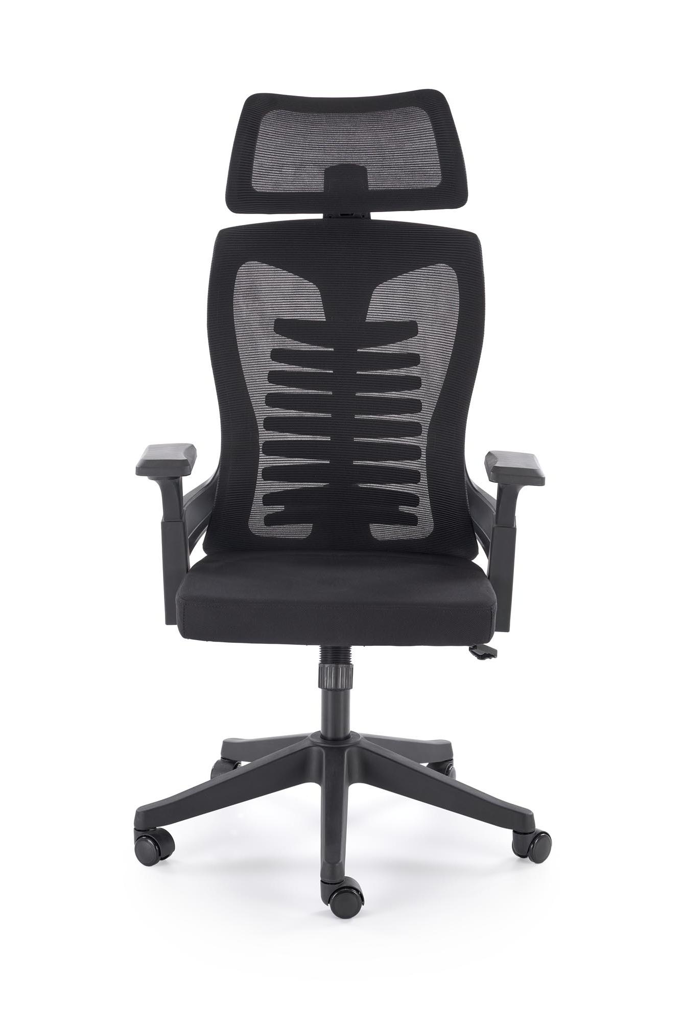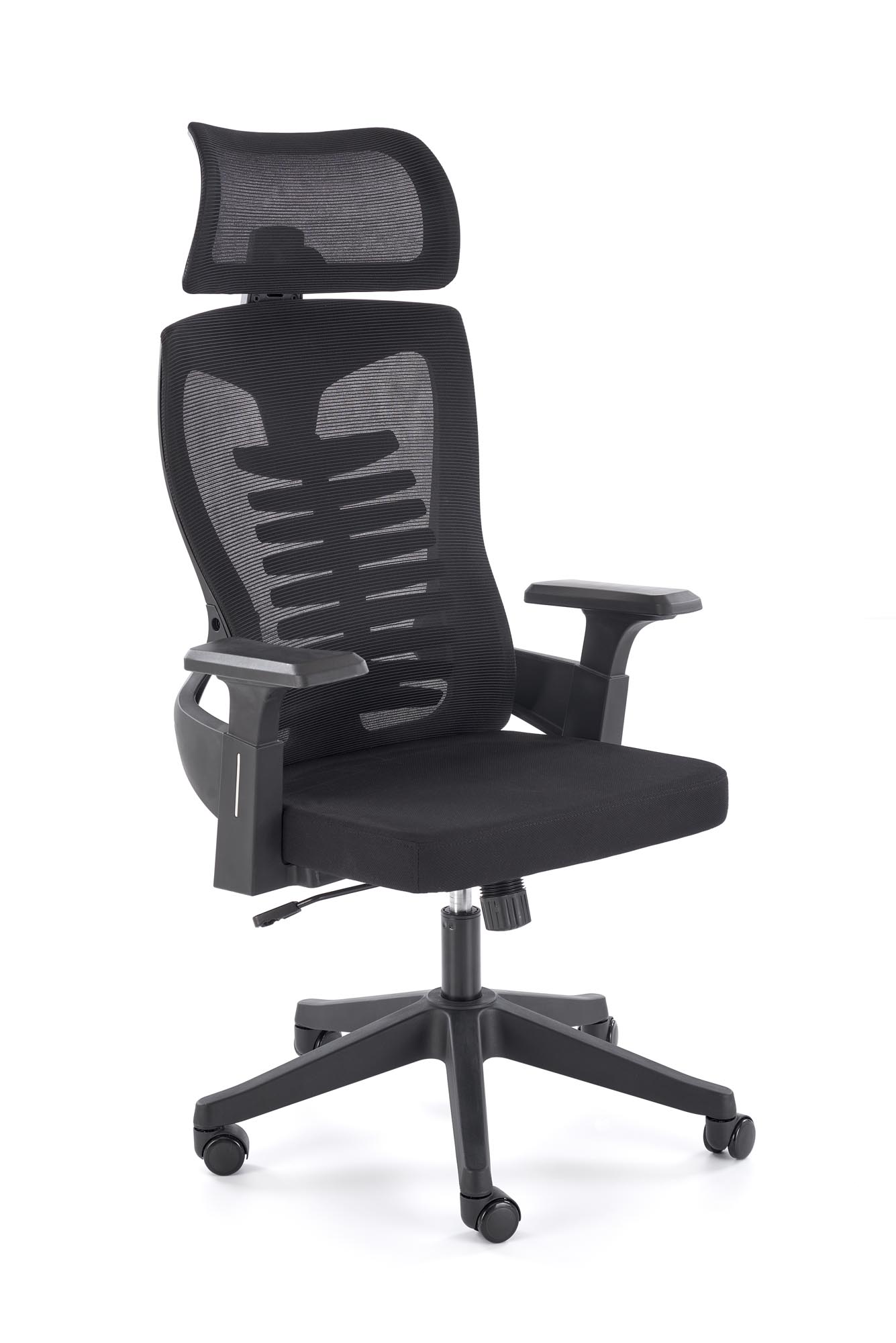 Fotel do biurka nowoczesny, czarny z zagłówkiem, tkanina membranowa i siatka, kółka kauczukowe