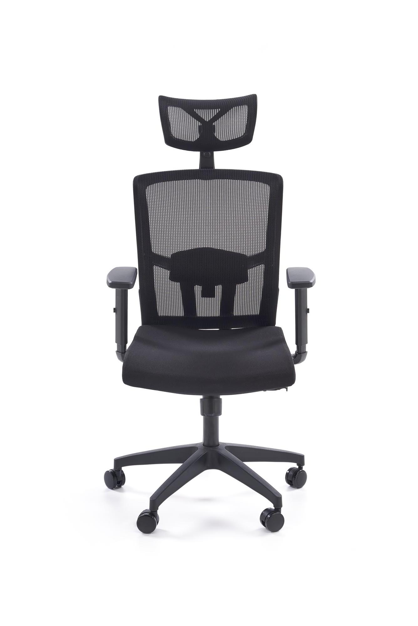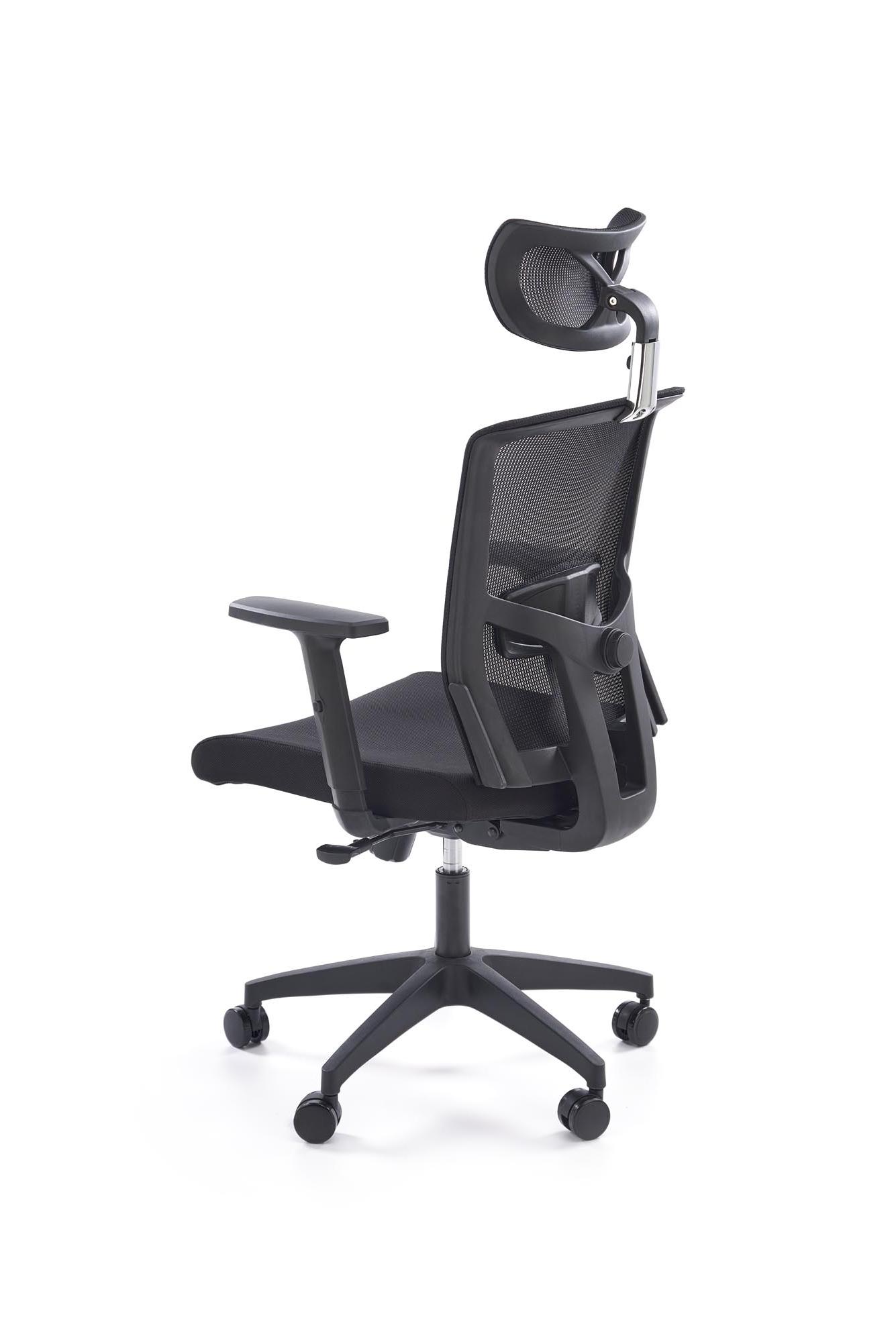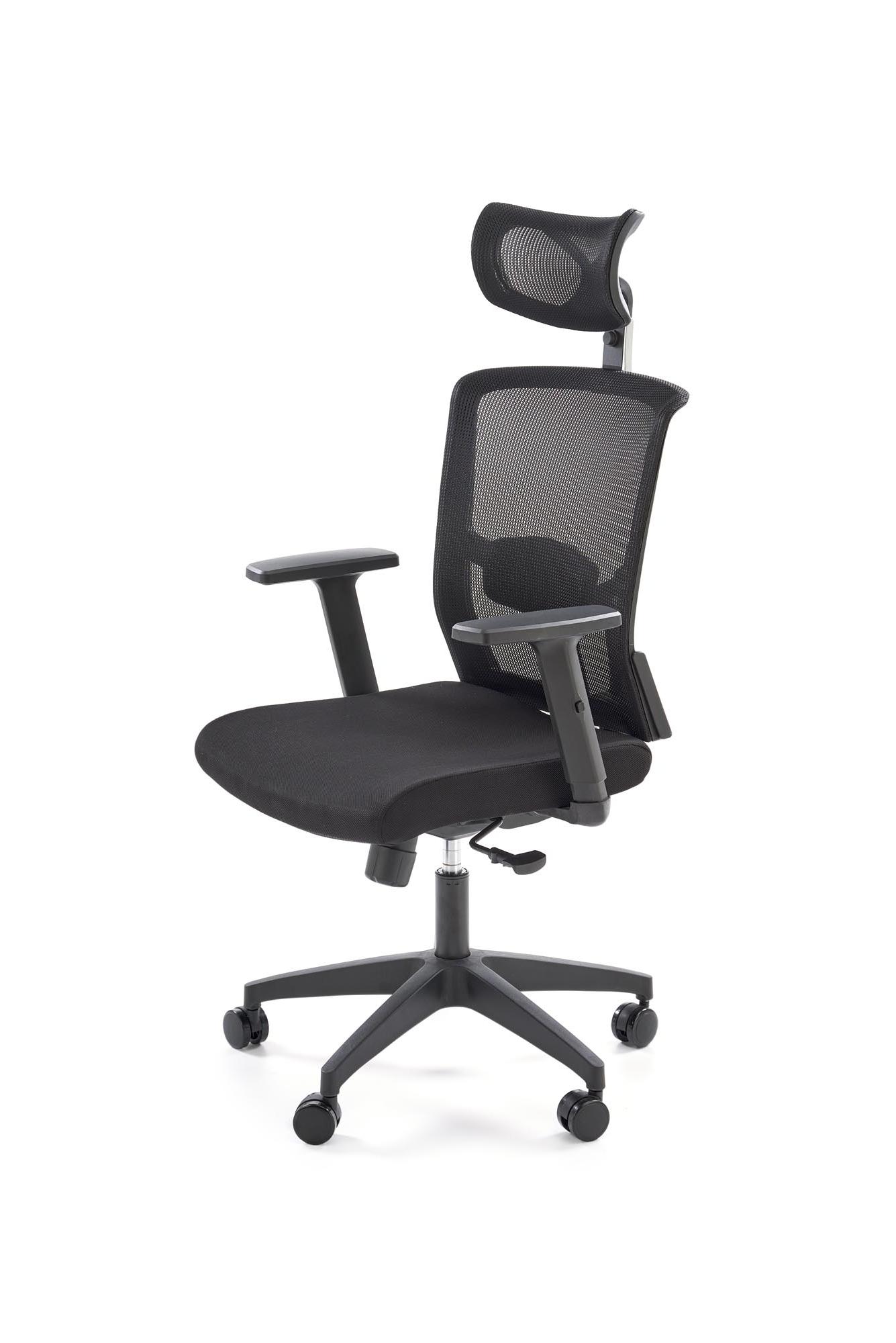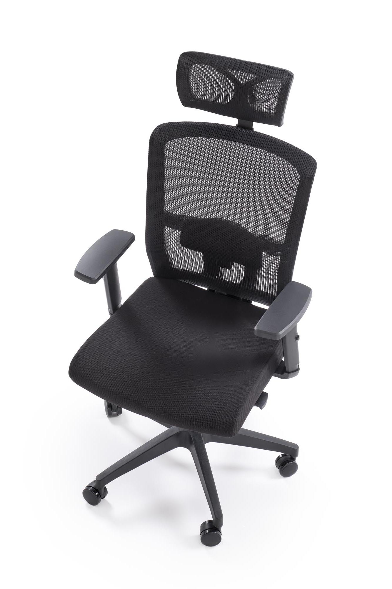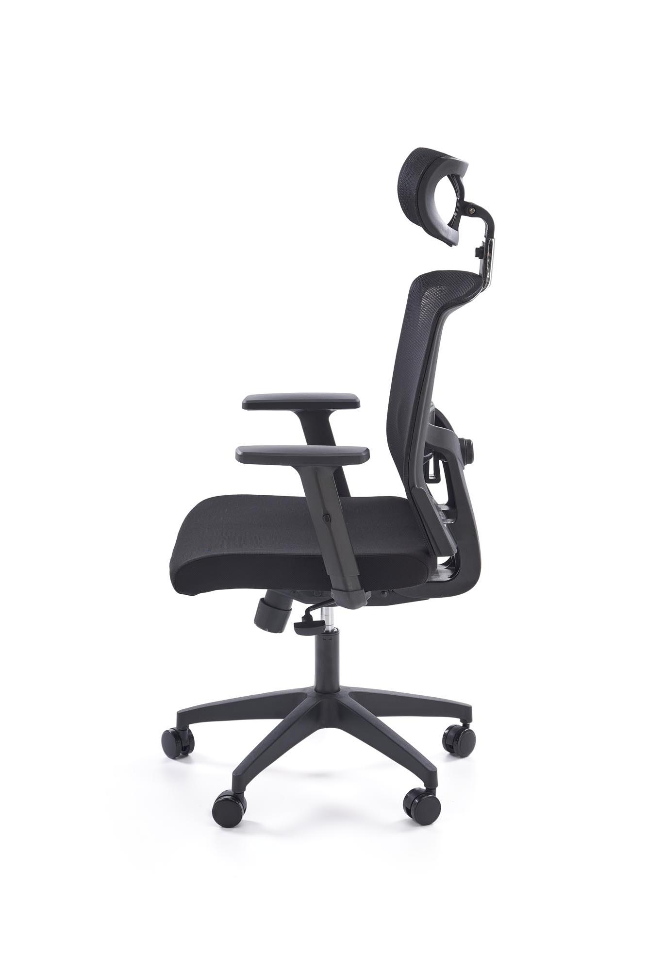 Fotel do biurka, nowoczesny, kolor czarny, kółka kauczukowe, podłokietniki i zagłówek regulowane, tkanina, siatka