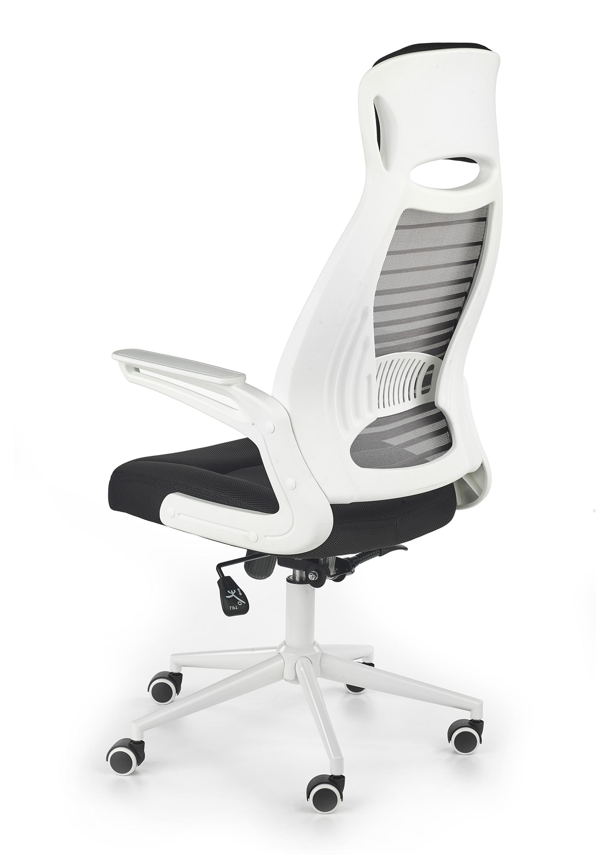 Fotel obrotowy wykonano z materiału: tkanina membranowa / siatka, kolor czarno-biało-popielaty