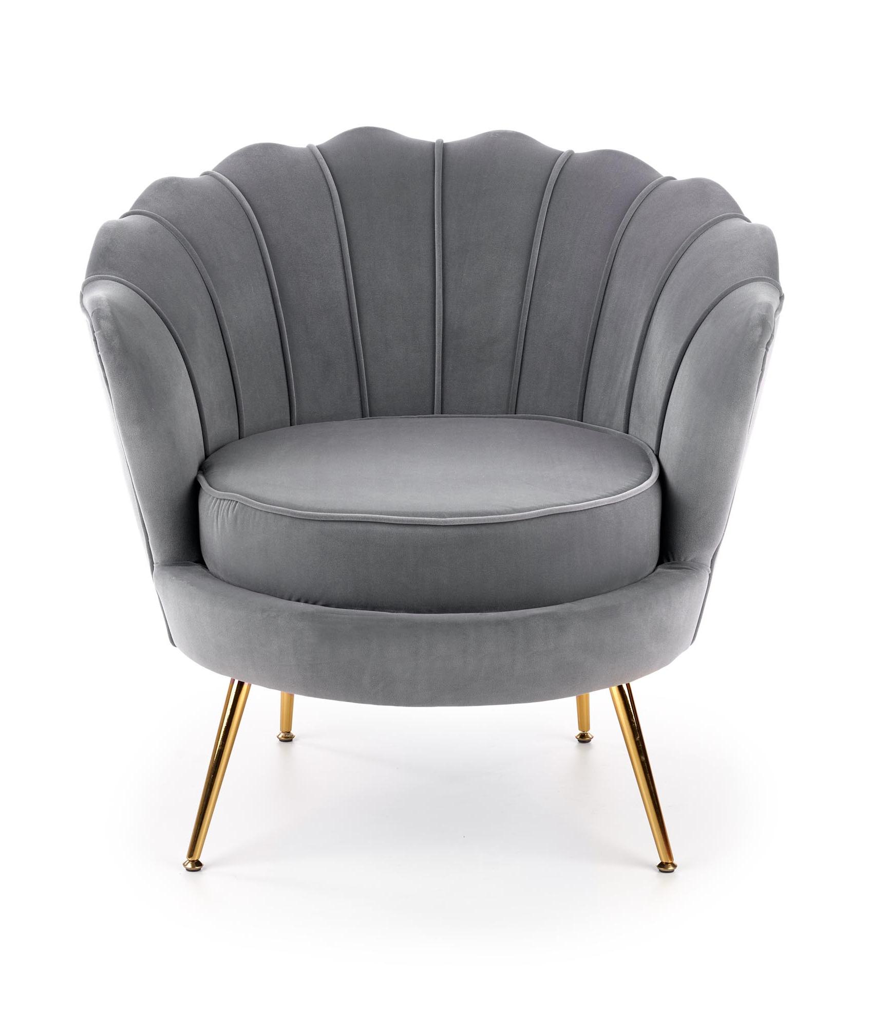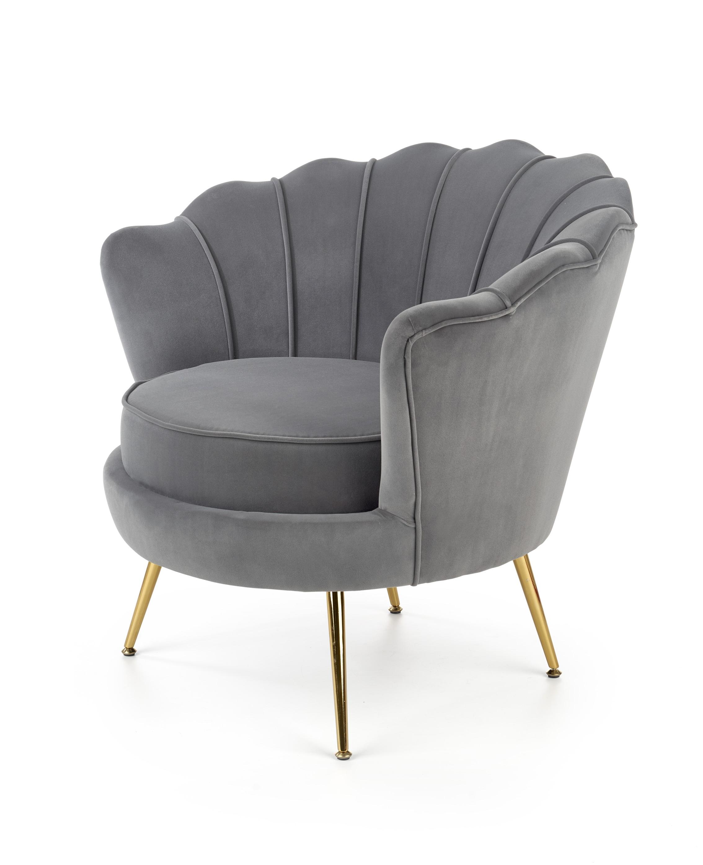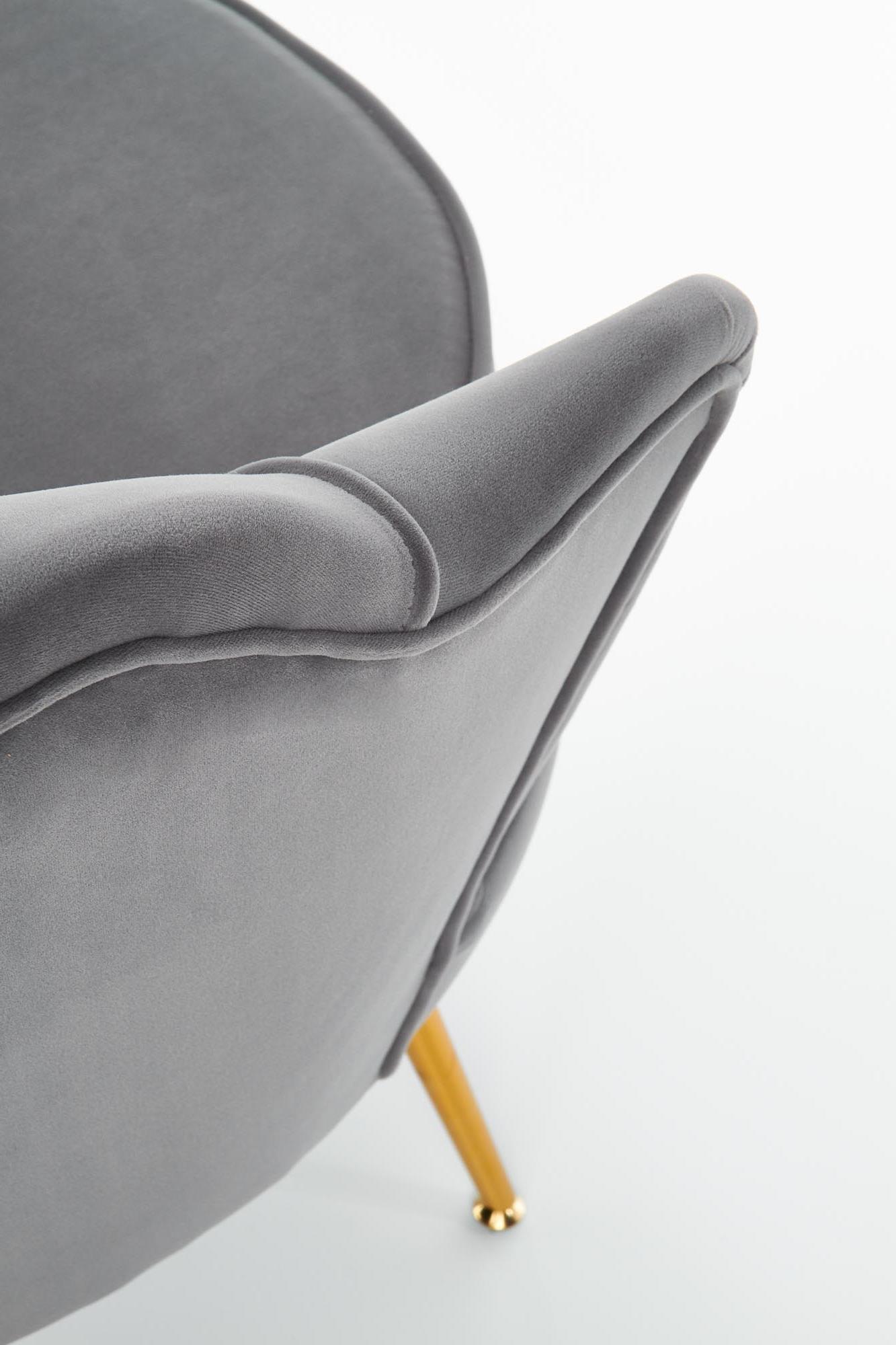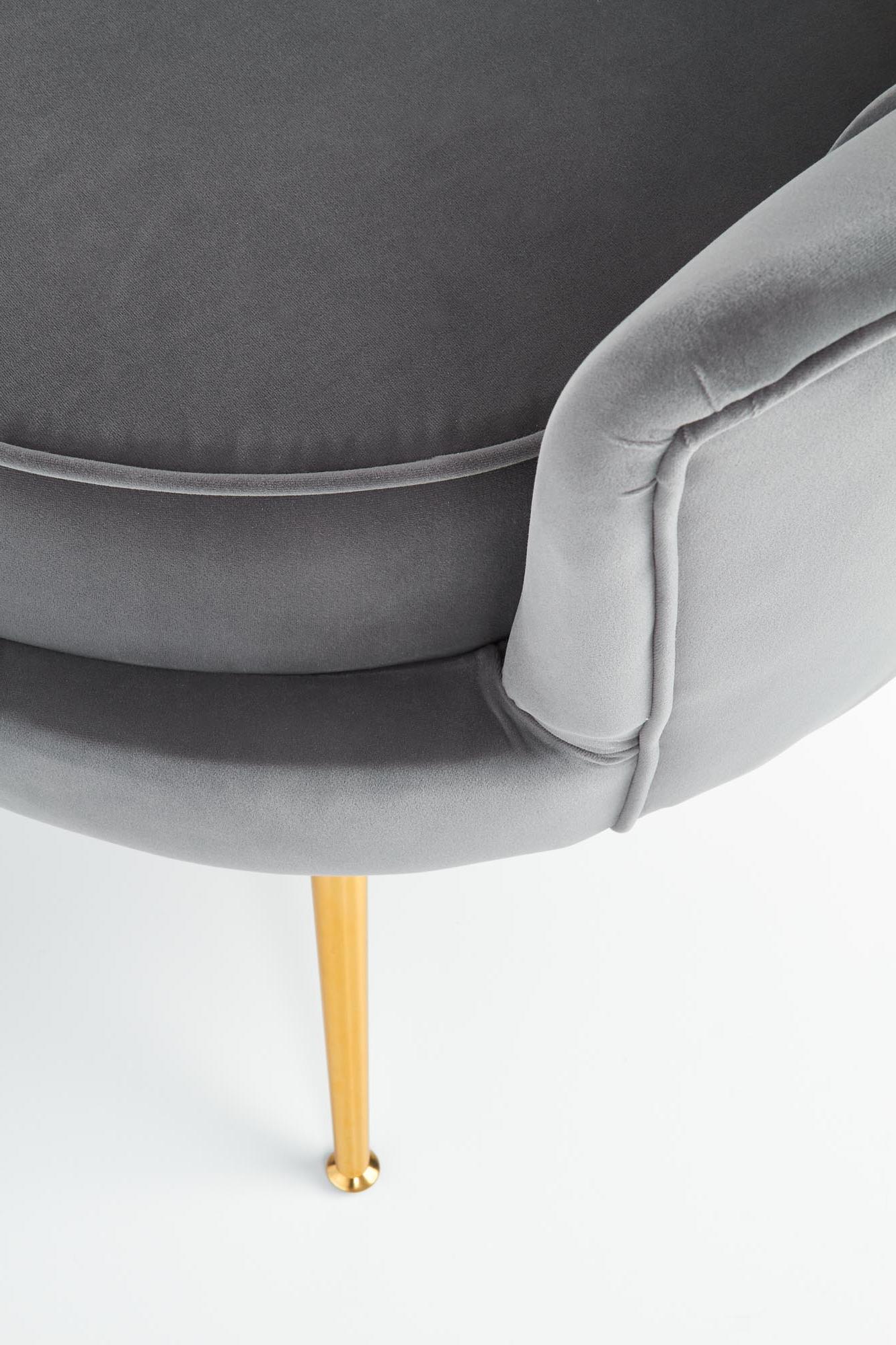 Wykonano z materiału: tkanina / stal chromowana, kolor tapicerka - popielaty, nogi - złoty