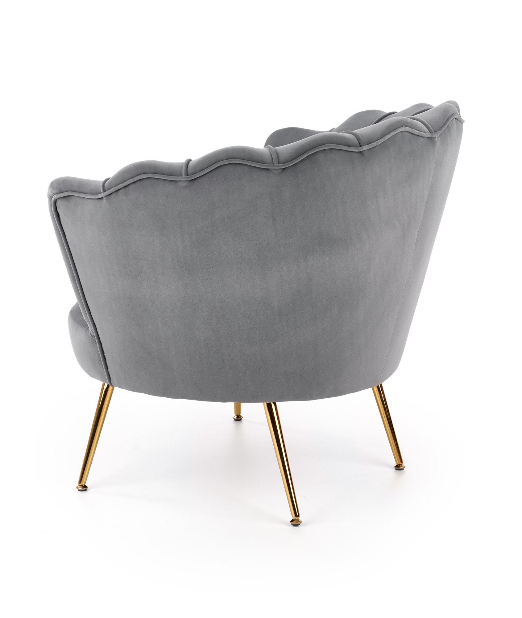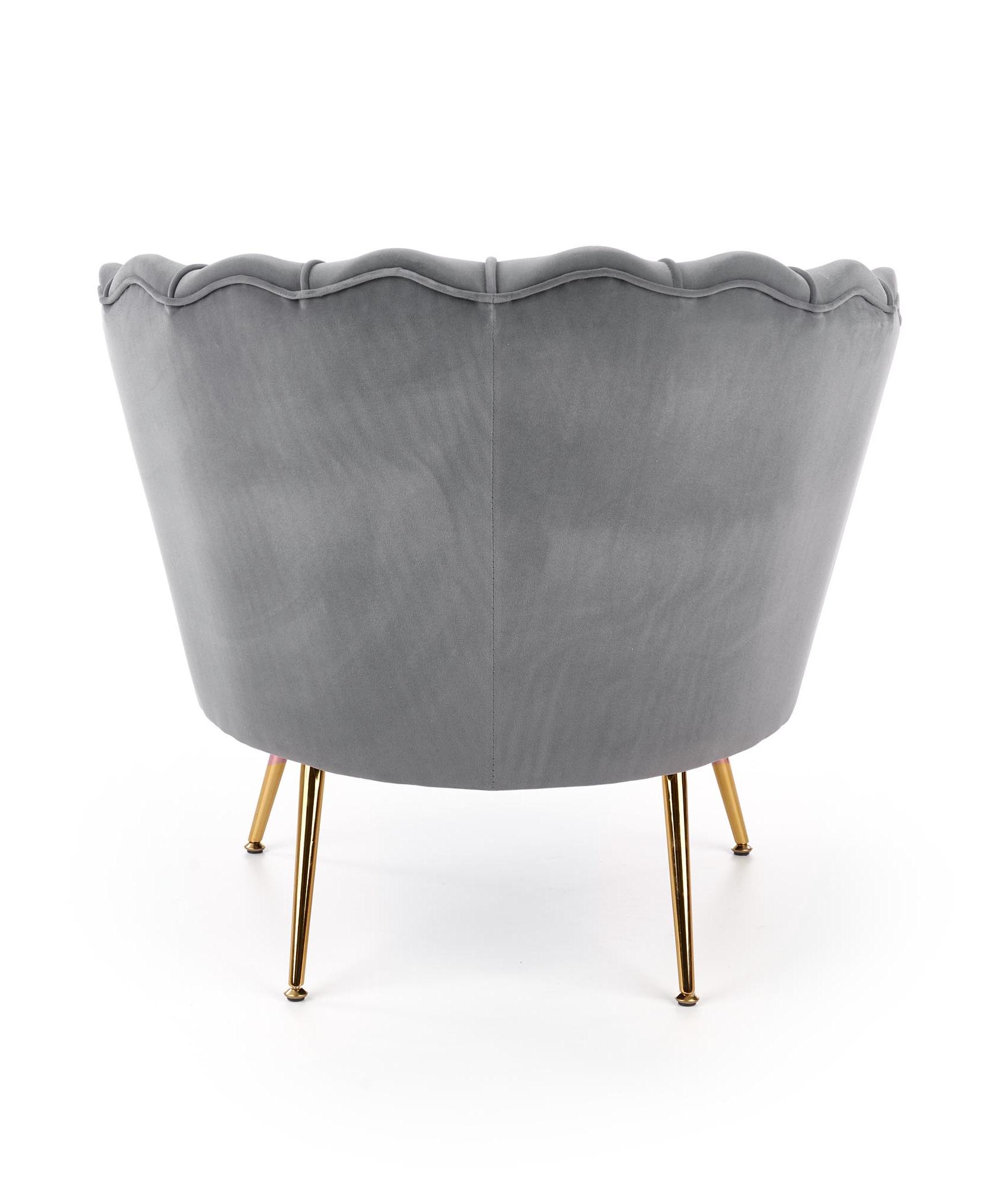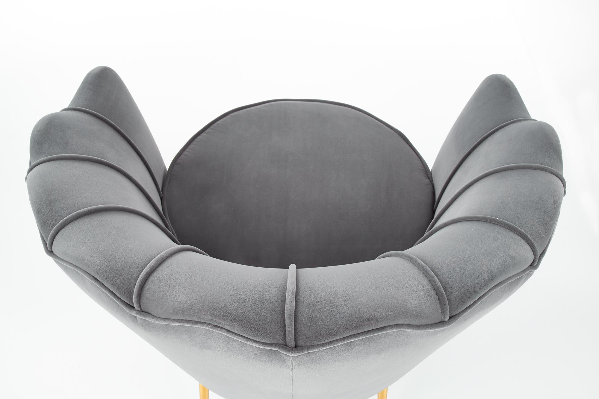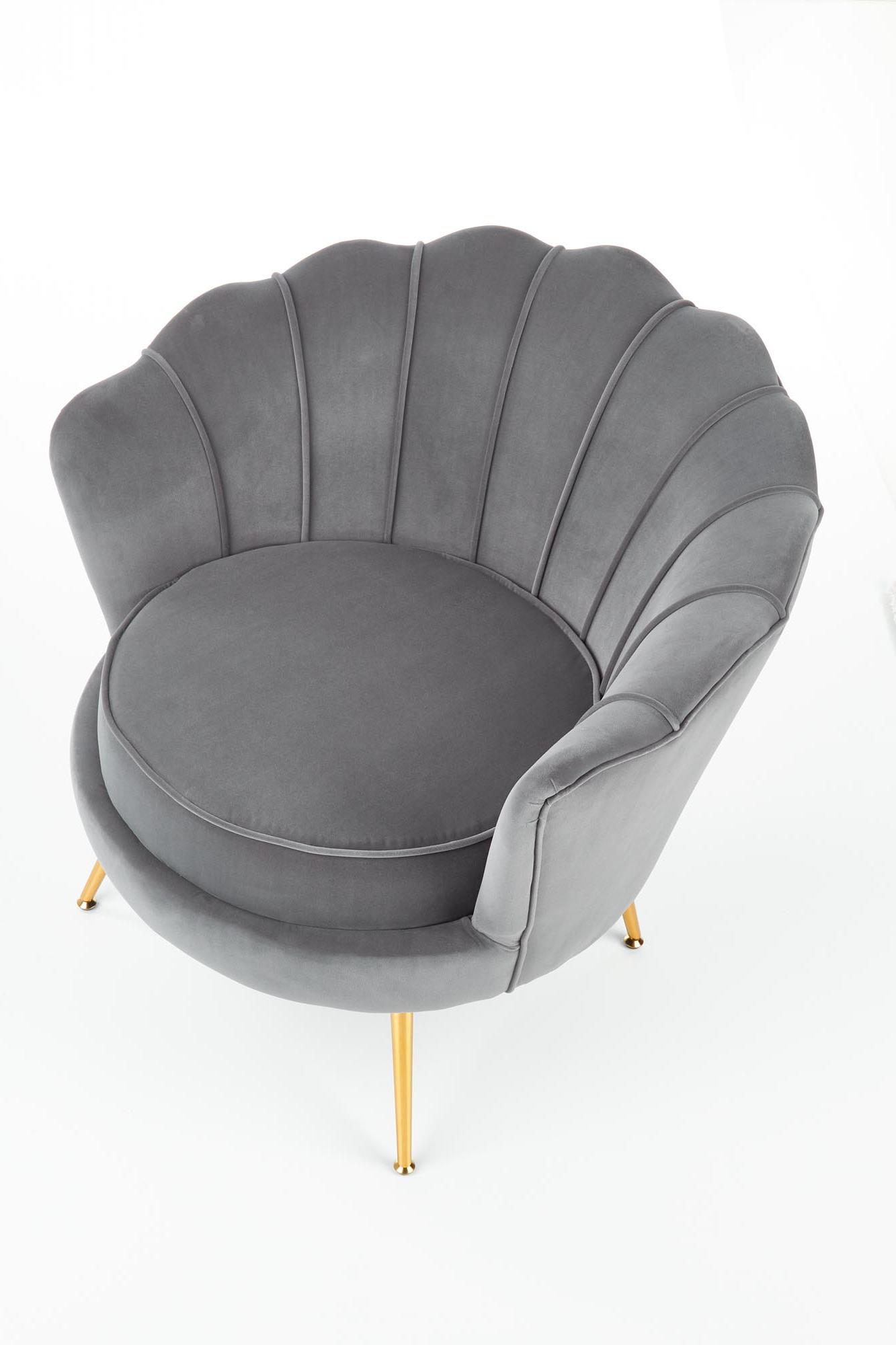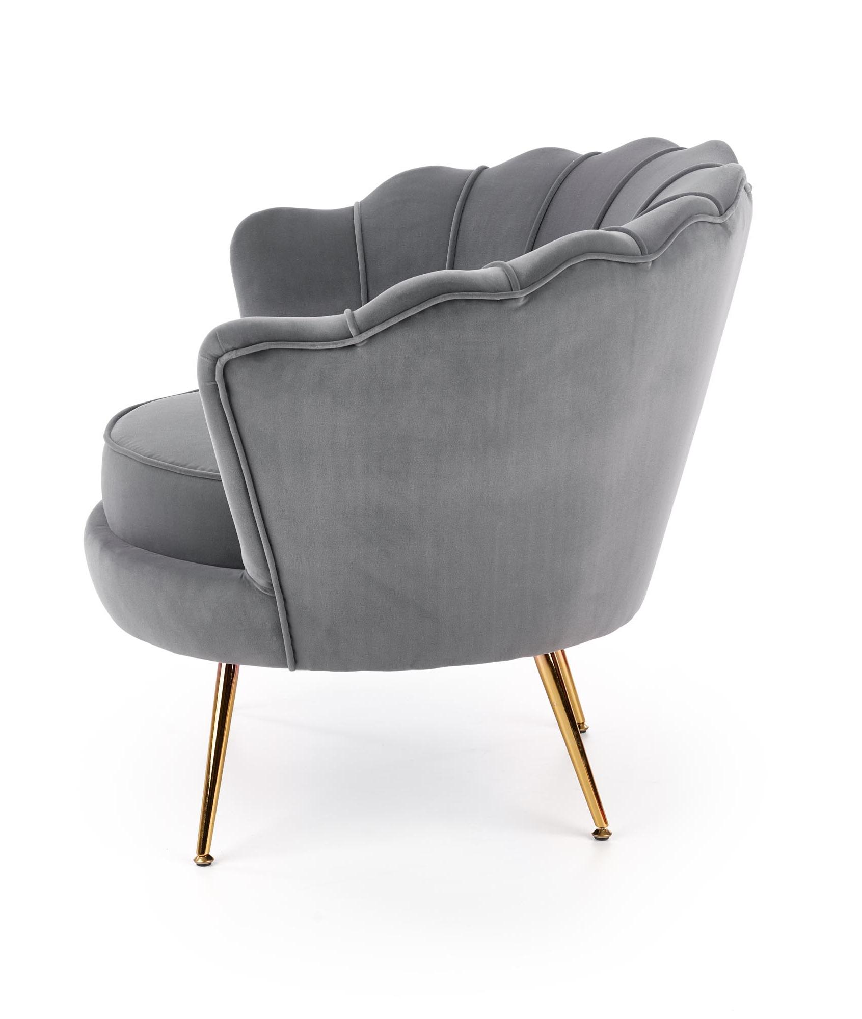 Wykonano z materiału: tkanina / stal chromowana, kolor tapicerka - popielaty, nogi - złoty