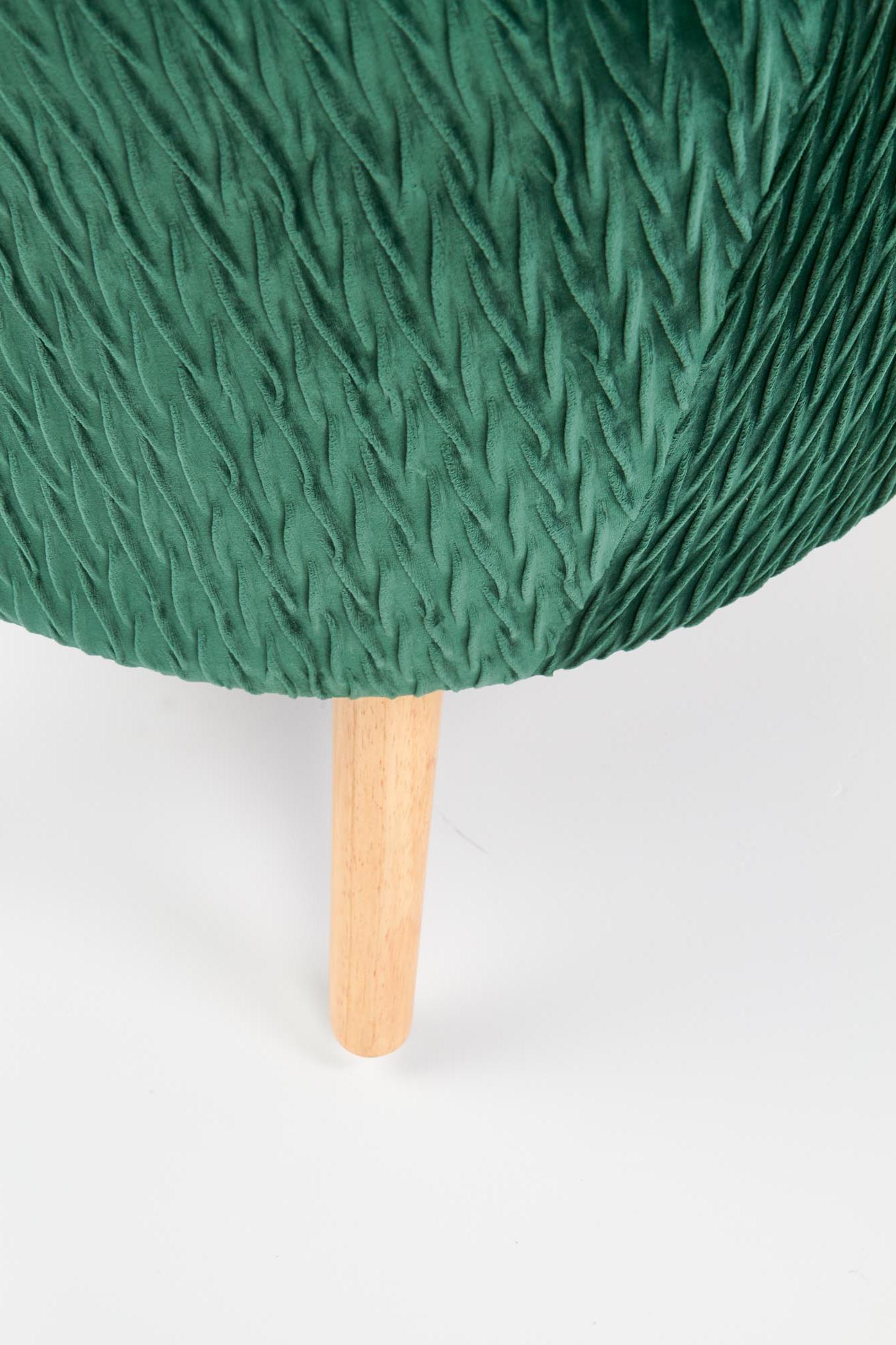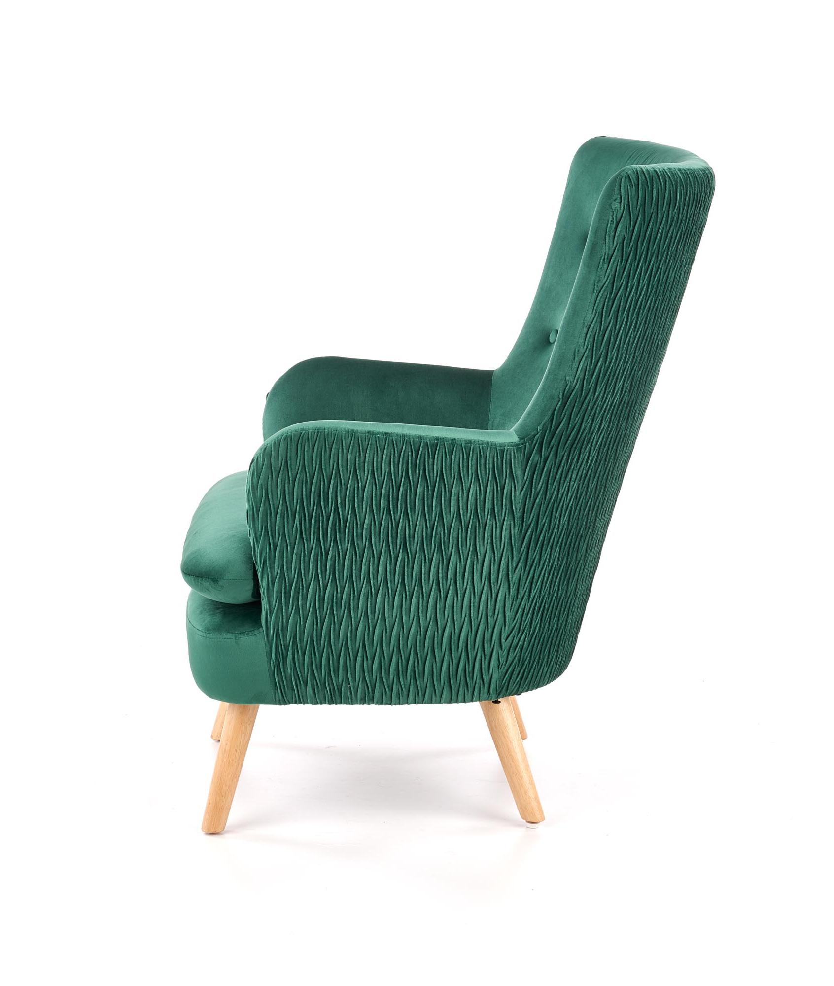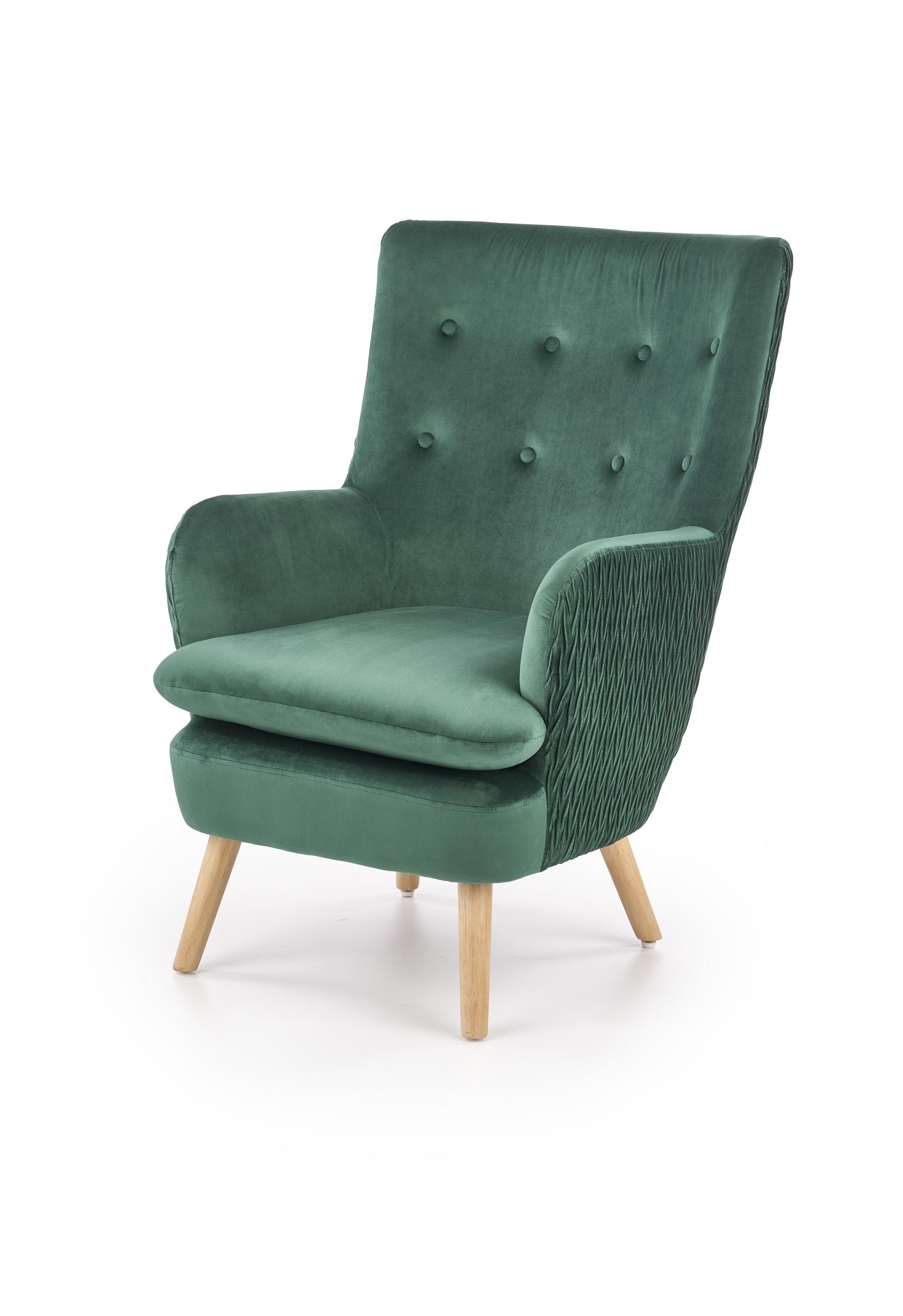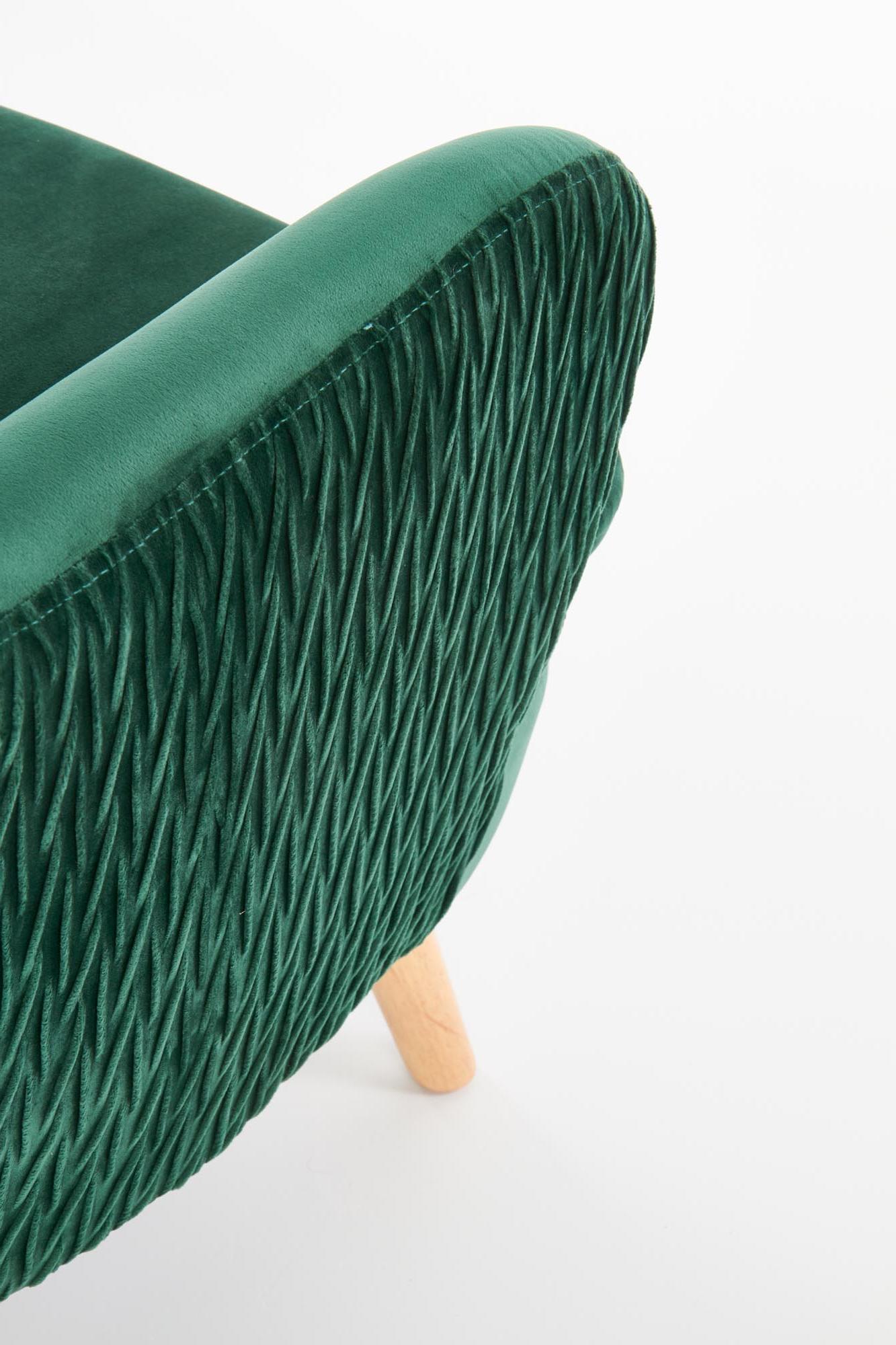 Wykonano z materiału: tkanina / drewno lite, kolor tapicerka - ciemny zielony HLR 57, nogi - naturalny
