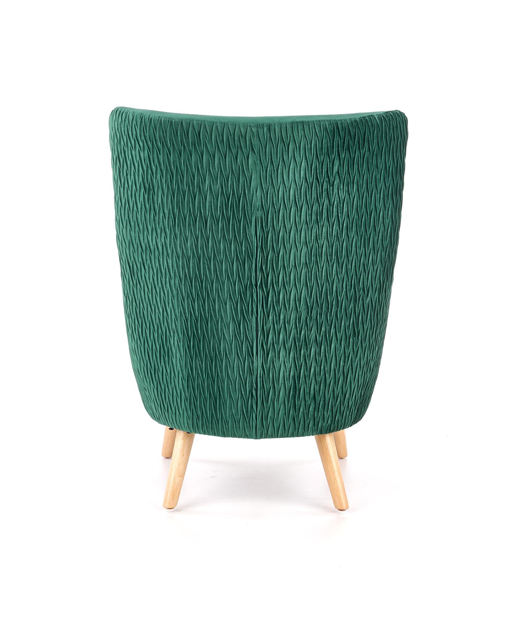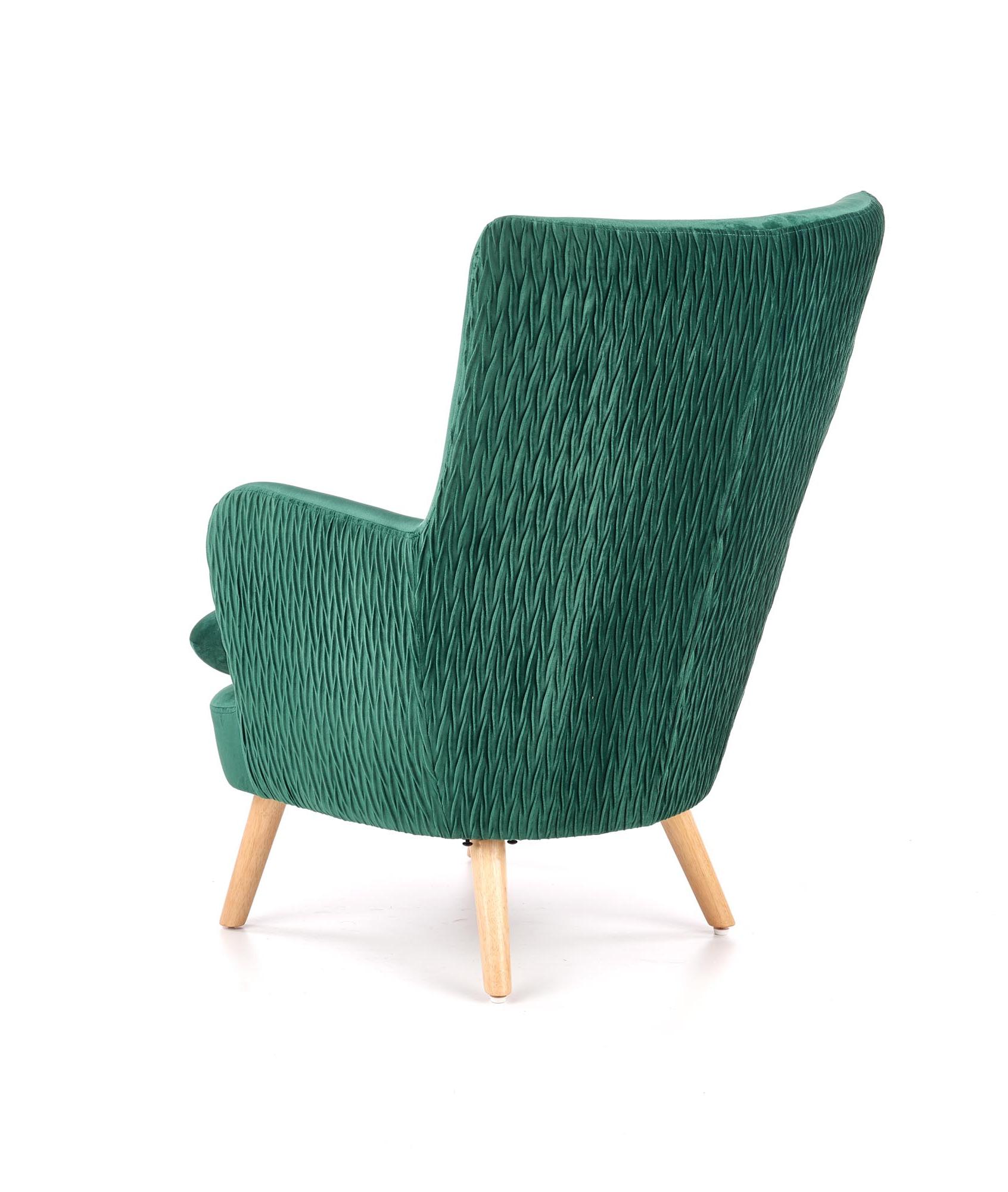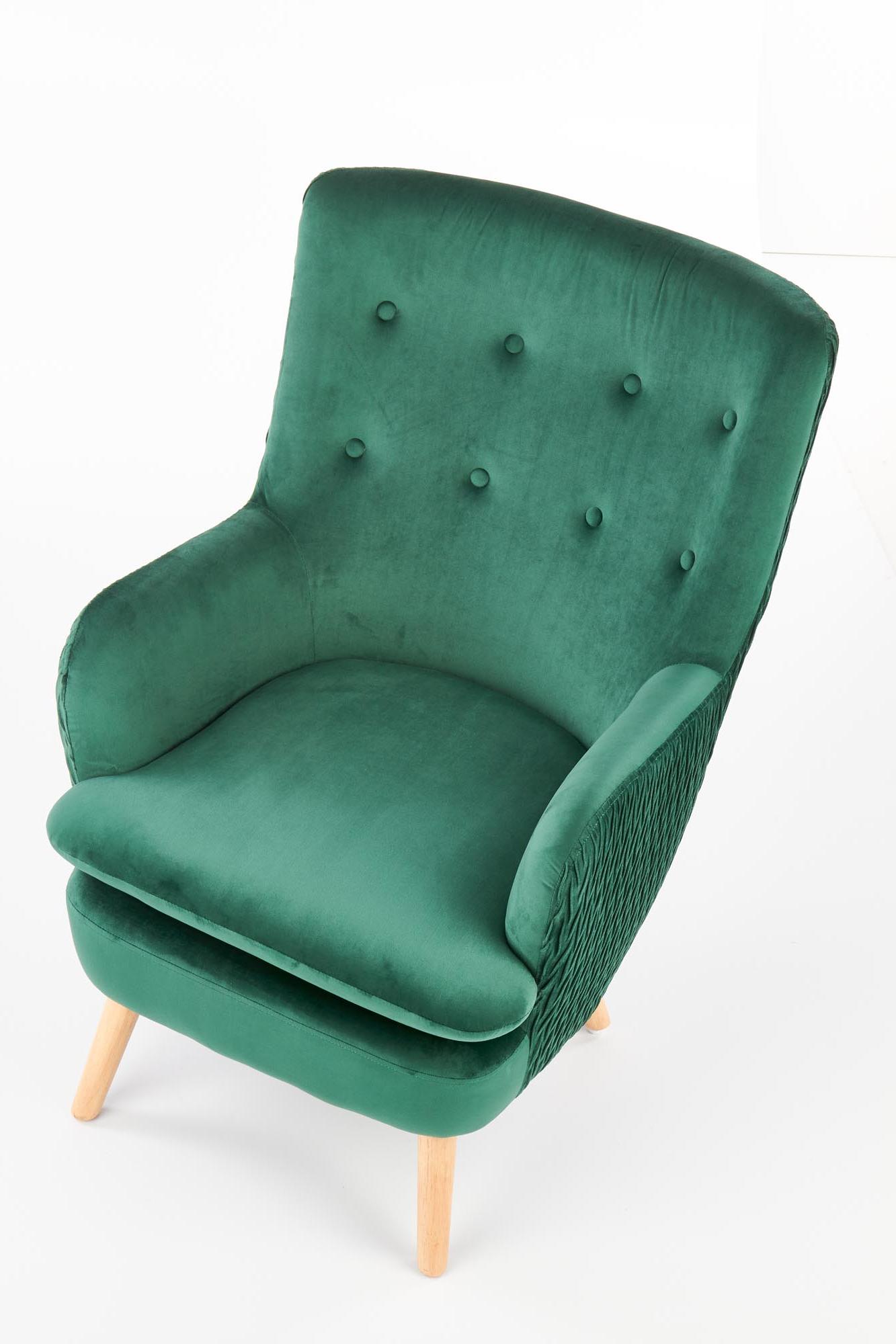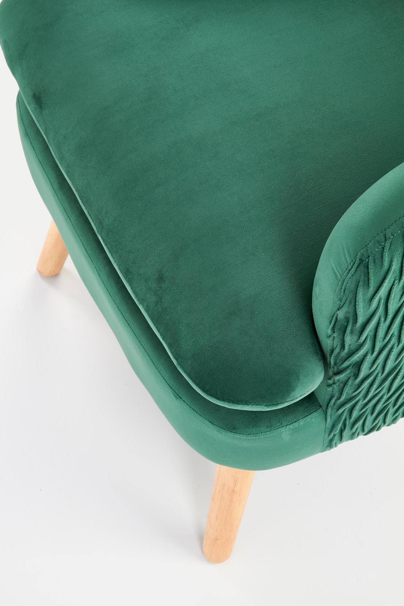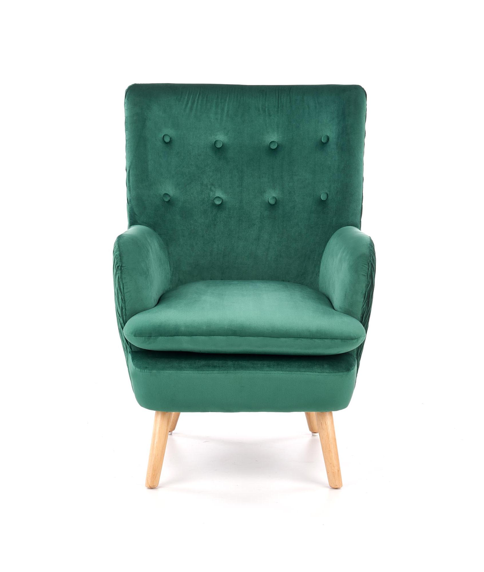Wykonano z materiału: tkanina / drewno lite, kolor tapicerka - ciemny zielony HLR 57, nogi - naturalny