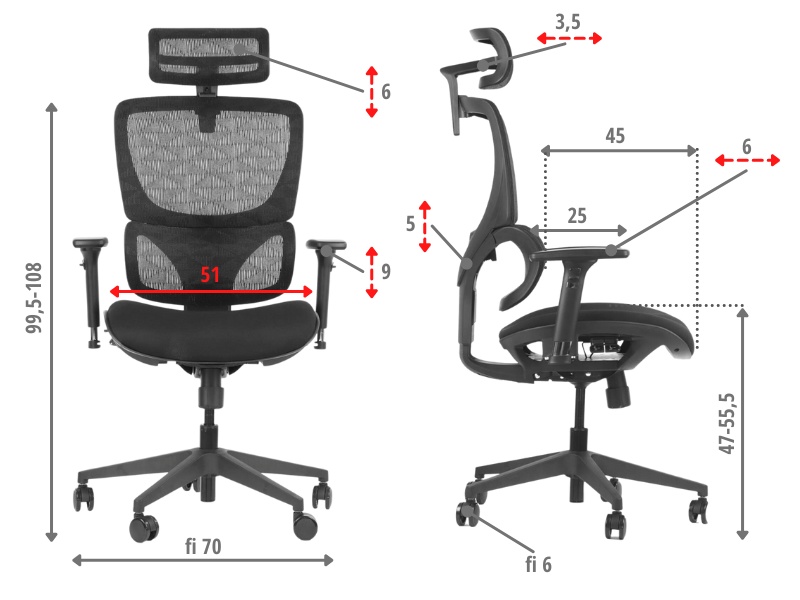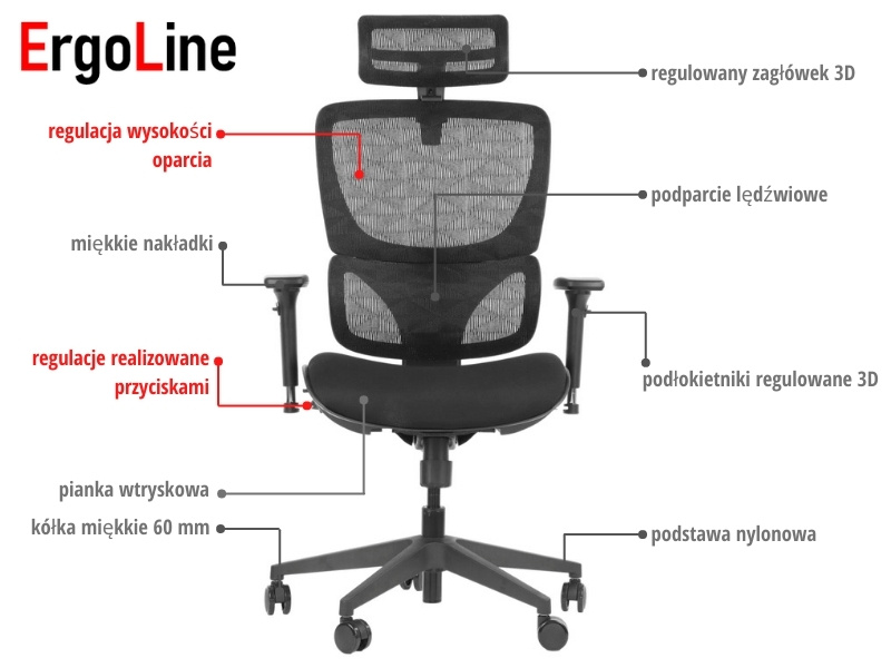 • oparcie regulowane na wysokość - tapicerowane tkaniną siatkową