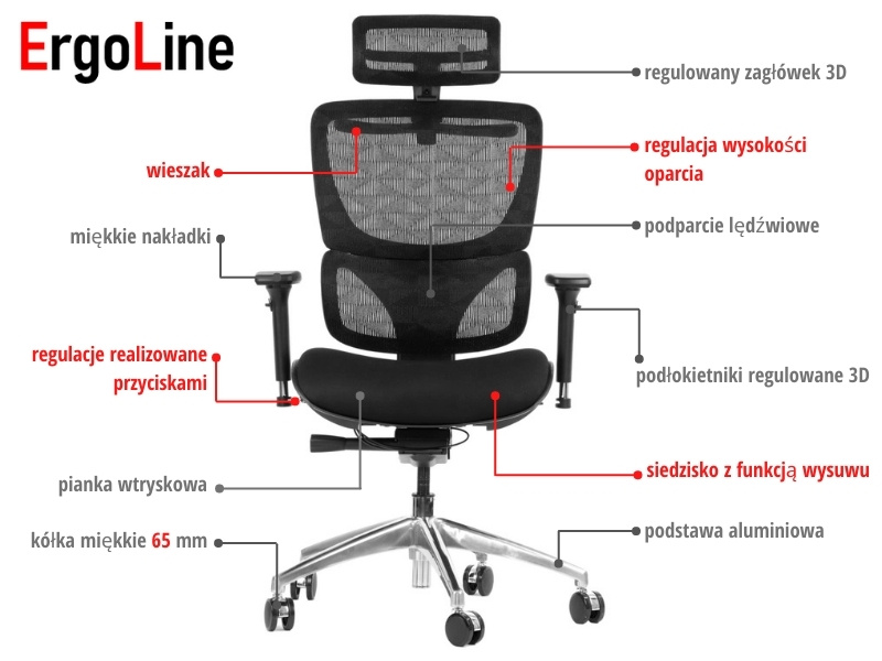 • regulacja wysokości, odchyłu i wysuwu realizowana za pomocą przycisków przy siedzisku