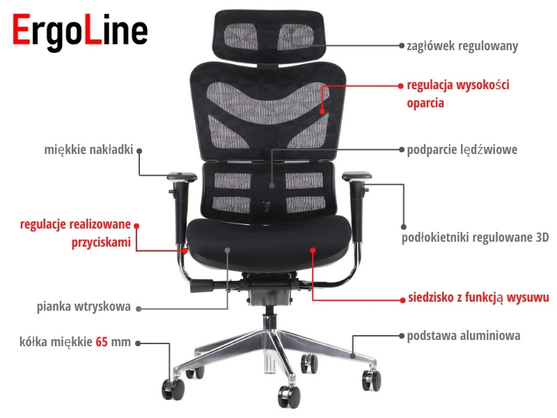 • regulacja wysokości, odchyłu i wysuwu realizowana za pomocą przycisków przy siedzisku