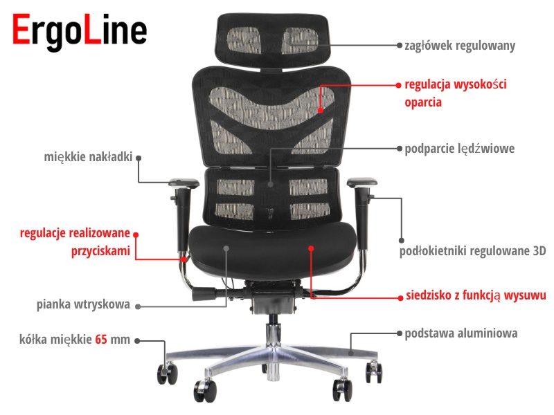 • regulacja wysokości, odchyłu i wysuwu realizowana za pomocą przycisków przy siedzisku