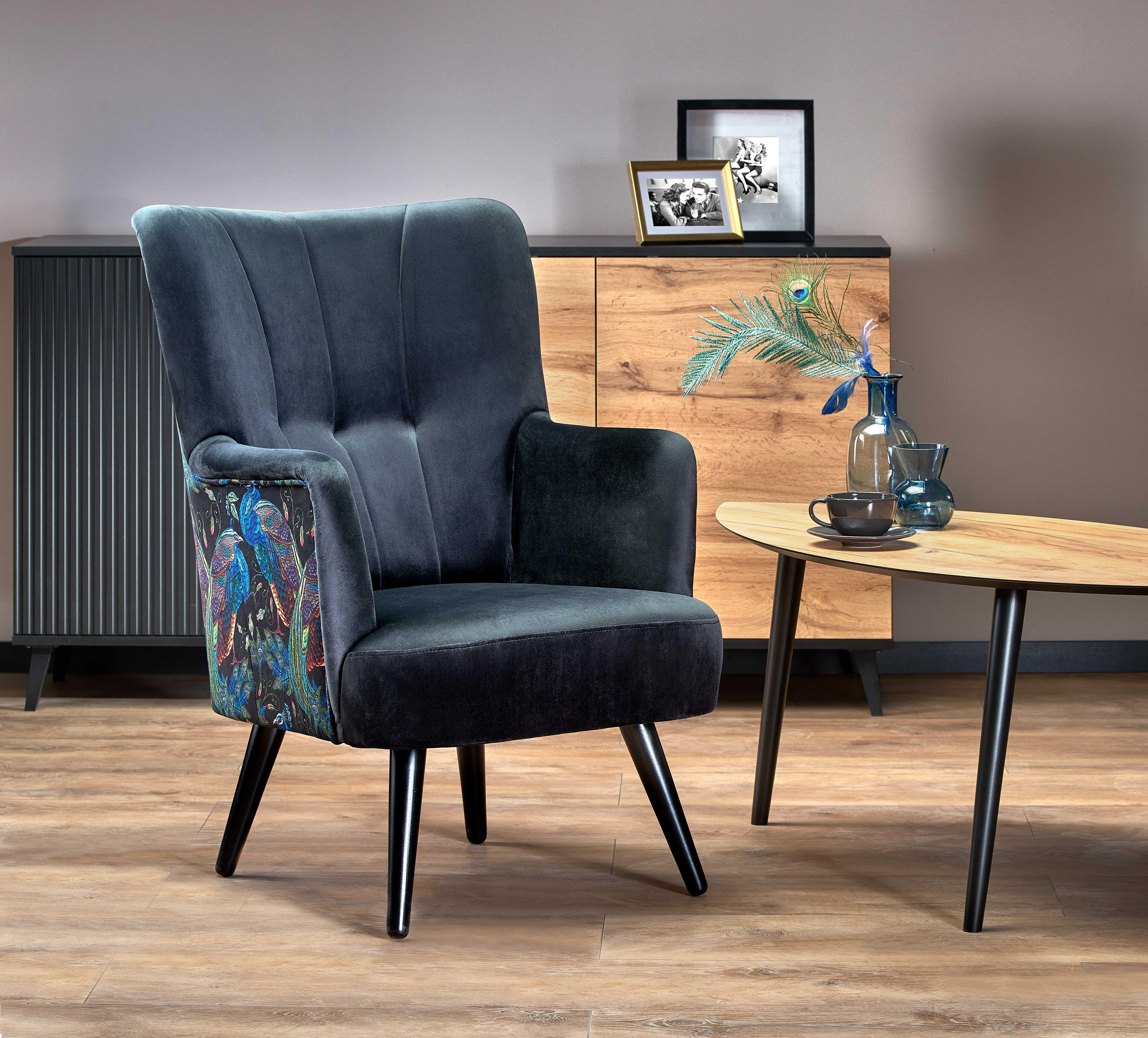 Wykonano z materiału: tkanina - velvet / drewno lite, kolory tapicerka - czarny - BLUVEL 19, nogi - czarny