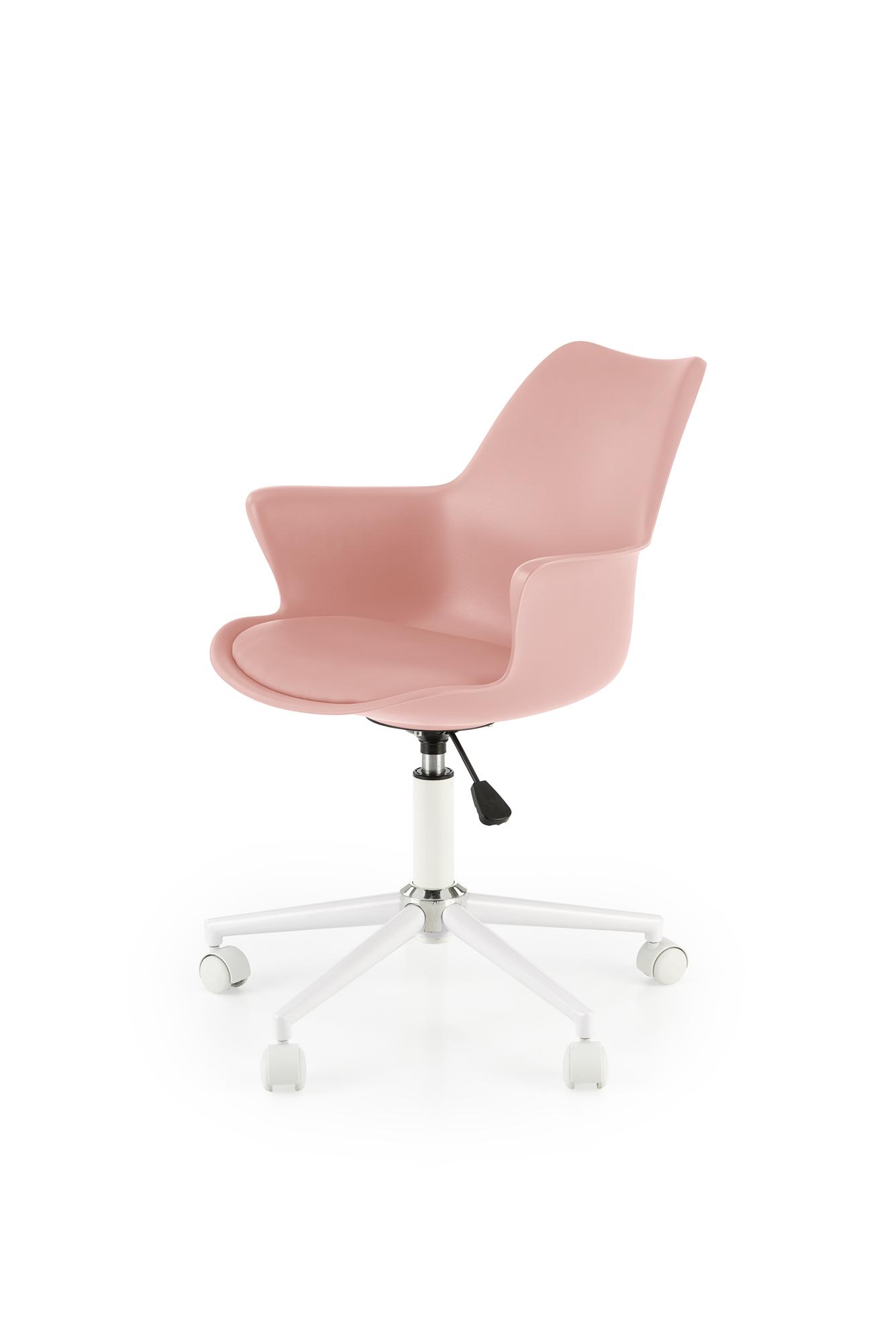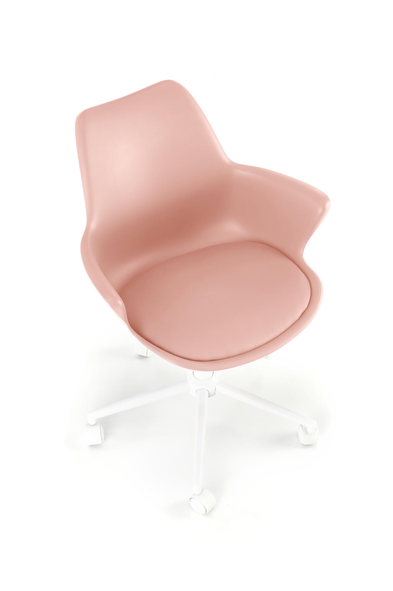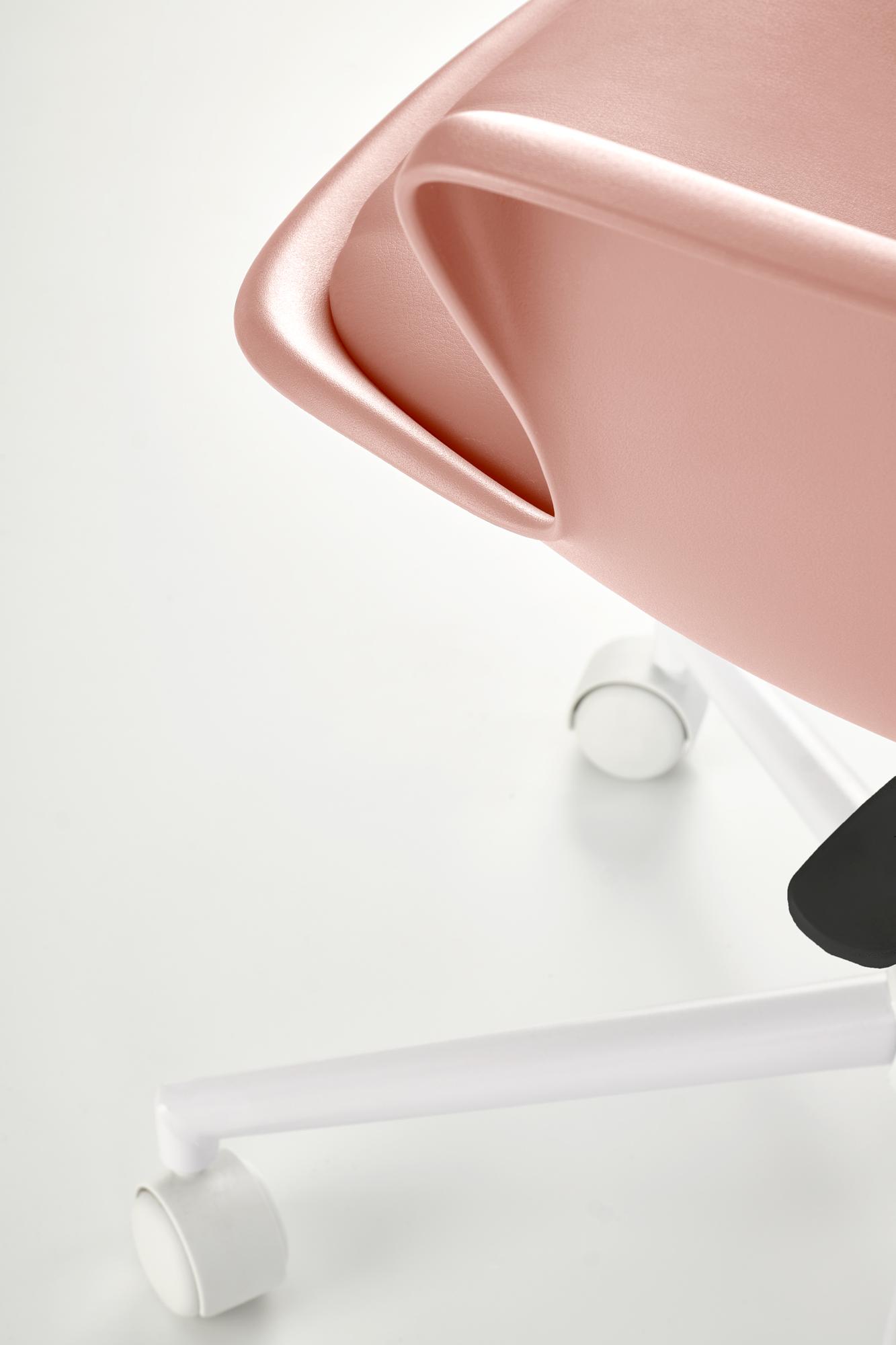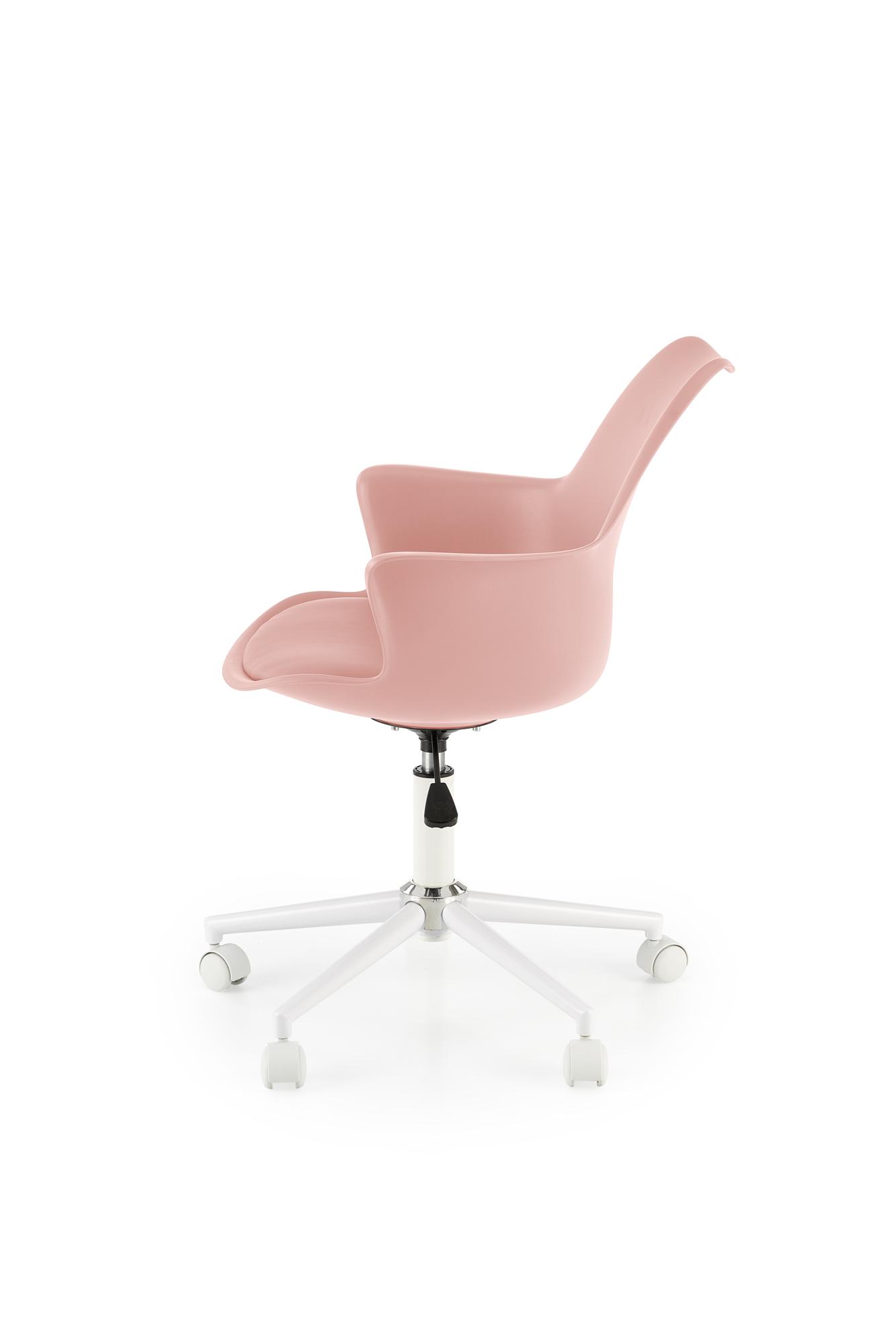 Fotel młodzieżowy w stylu skandynawskim i różowym kolorze na białej obrotowej podstawie, eko skóra