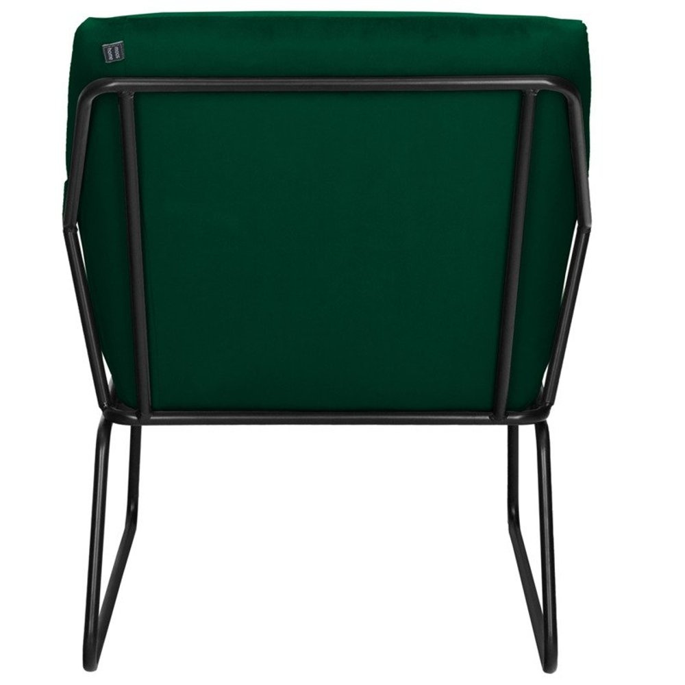 Fotel charakteryzuje się otwartą, ażurową konstrukcją stelaża, która kontrastuje z miękkim i obfitym tapicerowaniem. Całość tworzy wrażenie lekkości, a jednocześnie zaprasza do odpoczynku. Kolorystyka – głęboka zieleń weluru w połączeniu z czarnym stelażem – nadaje mu luksusowy i wyrafinowany charakter.