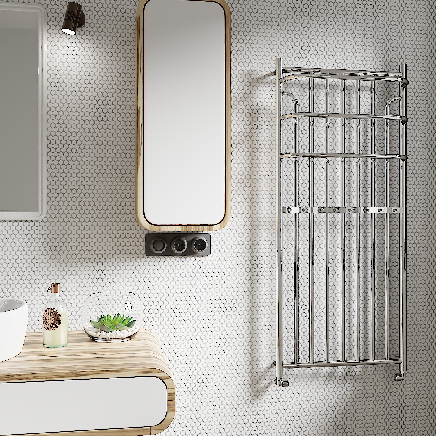 Minas 2 Chrom 430x1000 mm, 368 W – trzy łukowe dipole i rząd wieszaków. Idealny do nowoczesnych łazienek. Współpracuje z grzałką (prawa strona). Wykończenie: chrom błyszczący/satyna. Moc galwanizowanych niższa o ok. 25%.