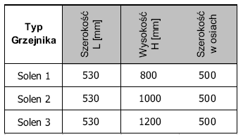 Klasyczna forma, 530×1200 mm, 455 W. Współpracuje z grzałką (prawa strona). Moc galwanizowanych niższa o ok. 25%.