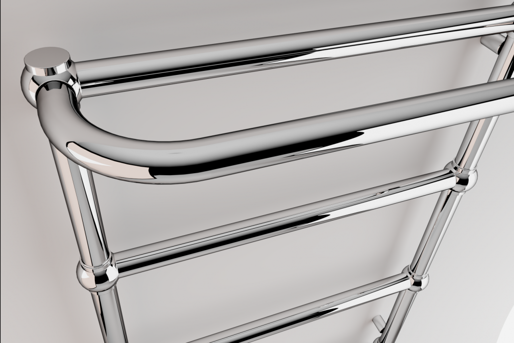 Grzejnik retro Syntia. Ozdobne kule w połączeniu z relingiem nadają wyjątkowego charakteru. Teraz Twoje ręczniki będą zawsze suche oraz ciepłe. Standardowe pokrycie to chrom, stary mosiądz, oraz pokrycia RAL.