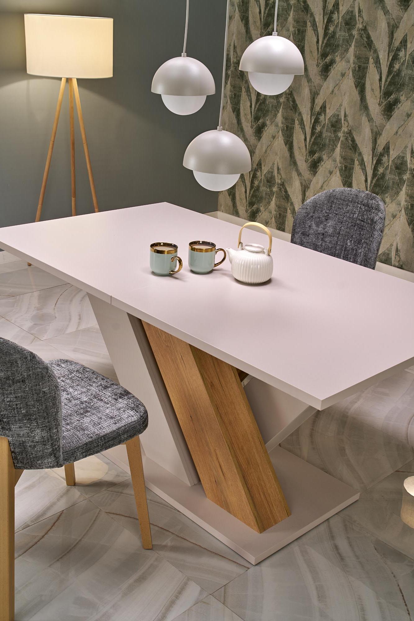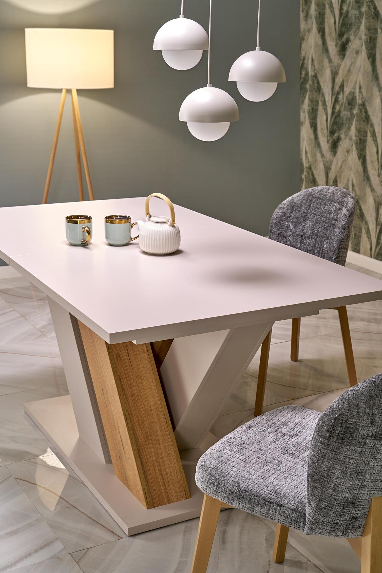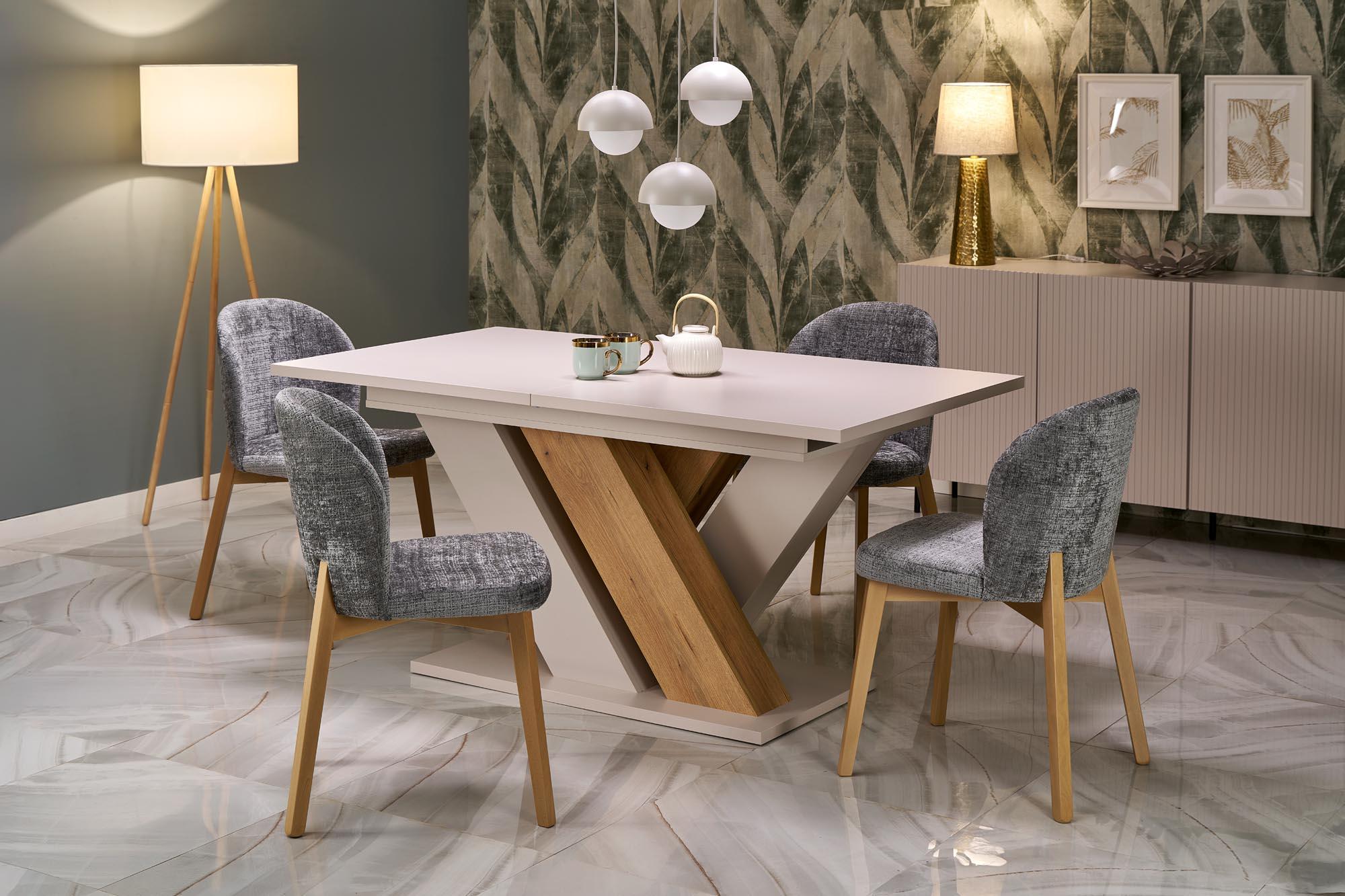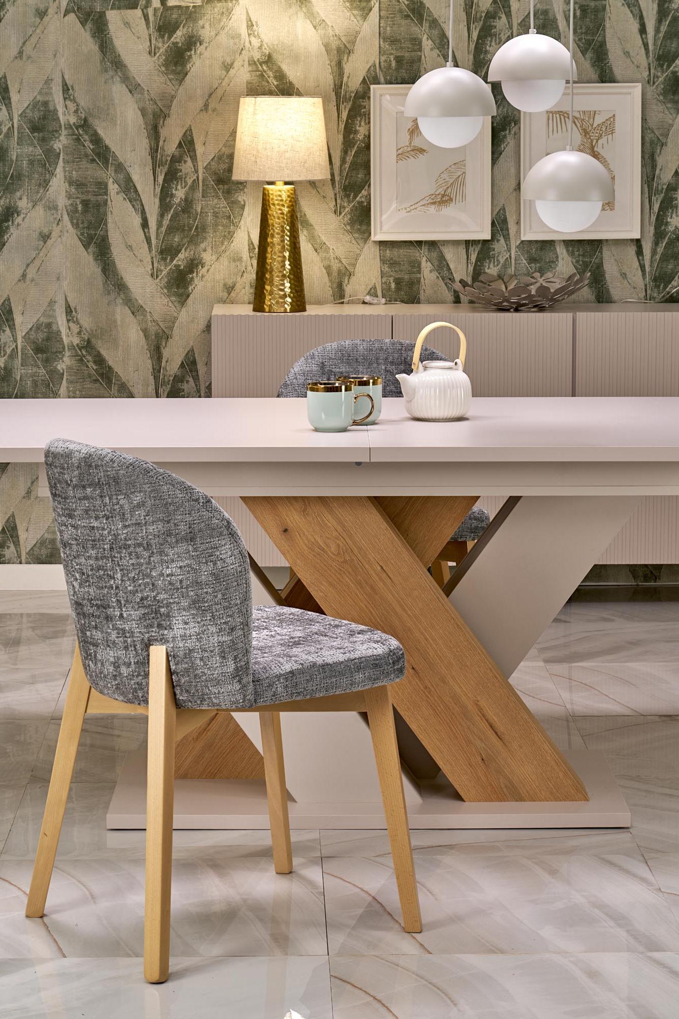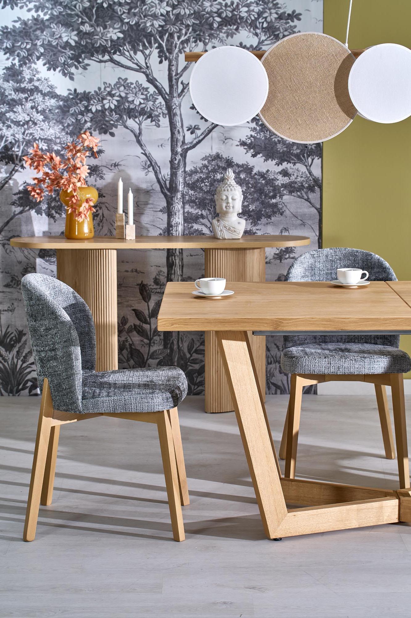 Krzesło wykonano z materiału: tkanina - CREMONA / drewno lite - bukowe, kolory noga - dąb naturalny, tapicerka - popielaty #96