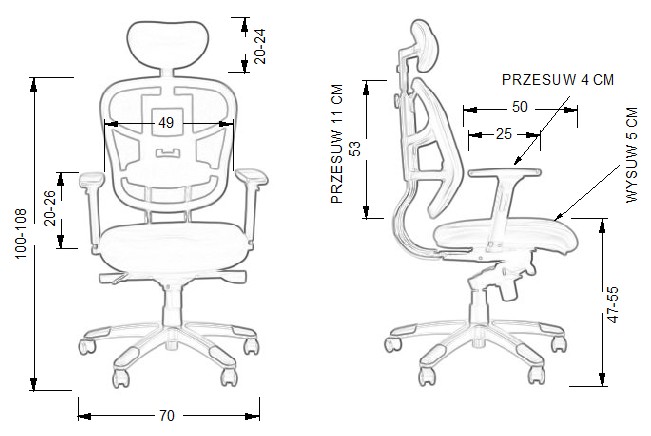 • podłokietniki regulowane (góra-dół, przód-tył, na boki) z miękkimi (poliuretanowymi) nakładkami