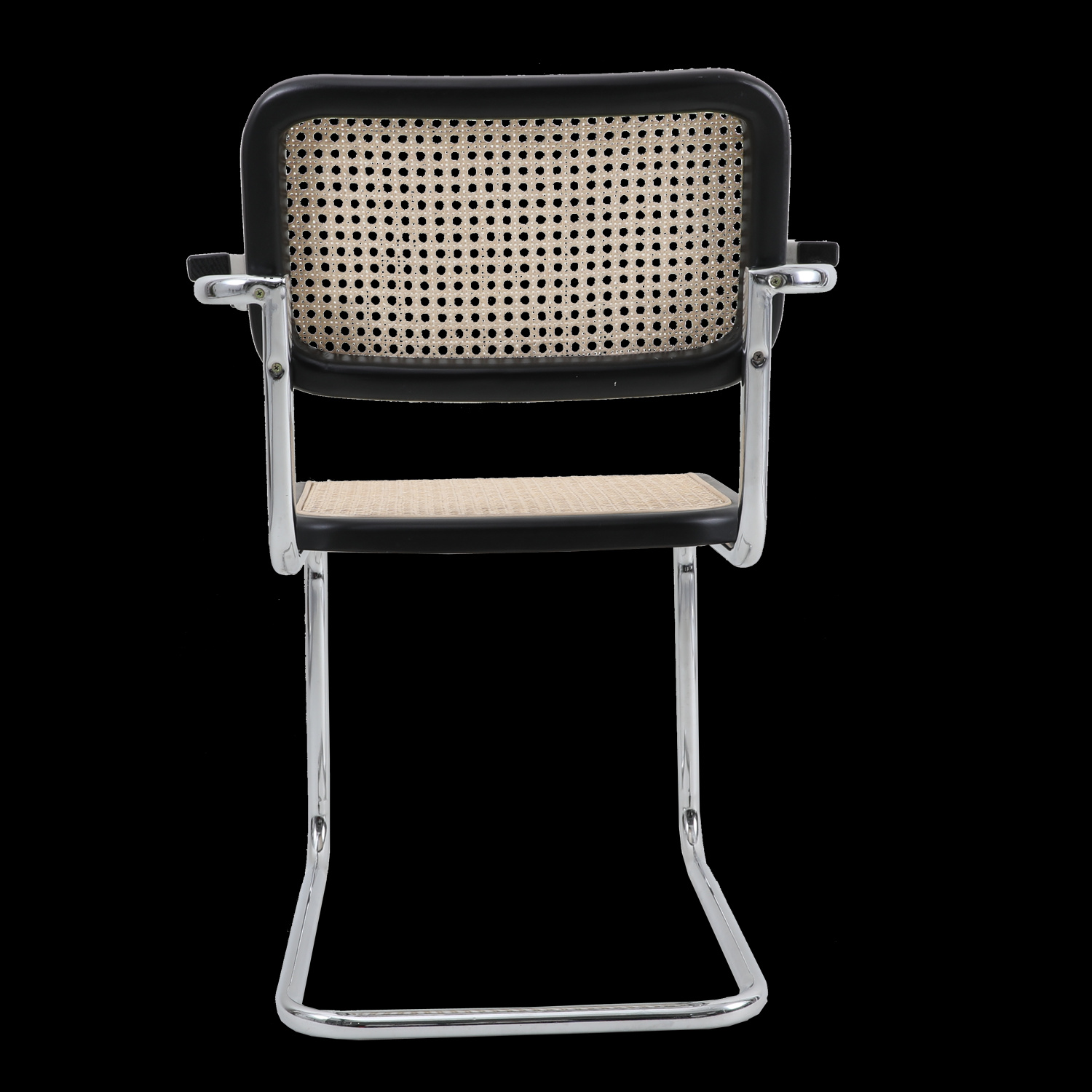 Czarny, matowy stelaż kontrastuje z jasną rattanową siatką, tworząc mebel, który przyciąga wzrok i pasuje do różnych aranżacji.