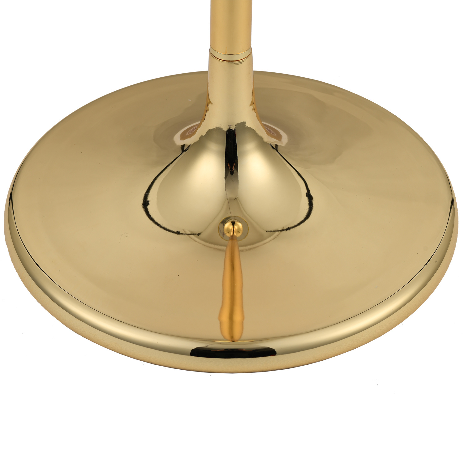 Podstawa lampy QUEEN wykonana została z aluminium w kolorze złotym lustrzanym, a abażur z tworzywa sztucznego w kolorze złotym.