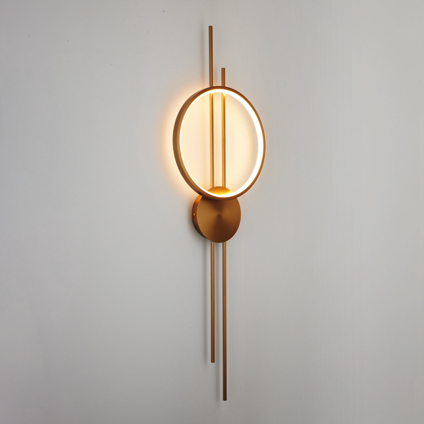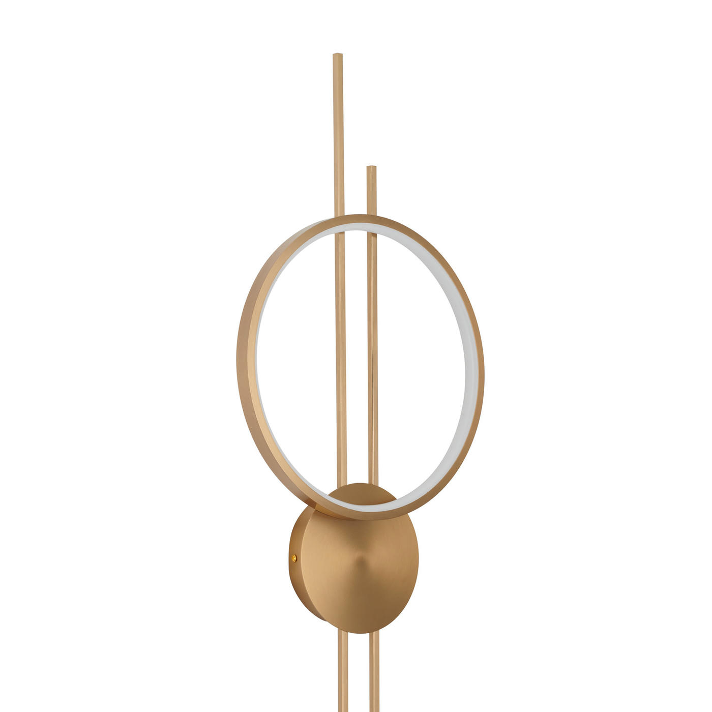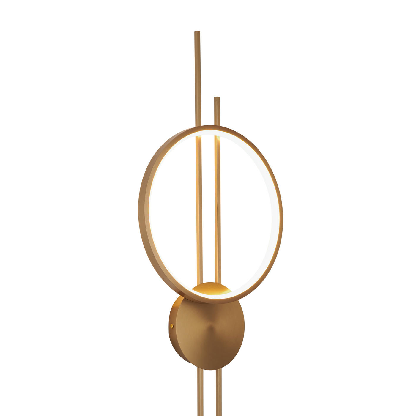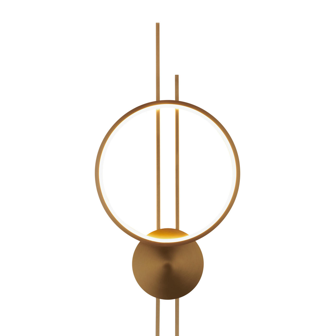 Centralnym elementem jest duży, okrągły pierścień LED, również w złotym wykończeniu, który przecina dwa górne pręty.