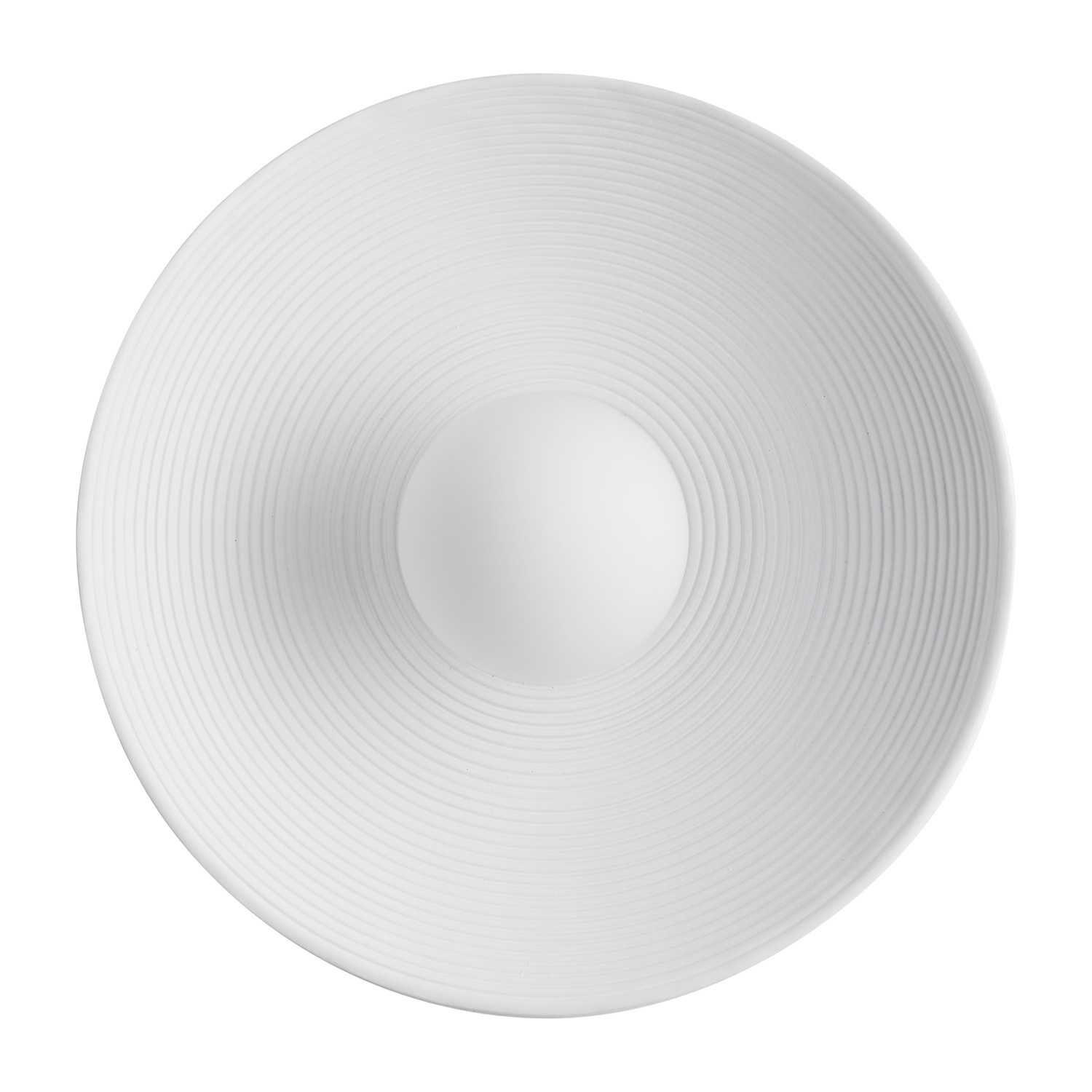 Półokrągły kształt misy oraz biały kolor korpusu, ozdobiony dekoracyjnym ryflowaniem, tworzy ciekawą kompozycję, która wprowadza do wnętrza spokojną atmosferę.