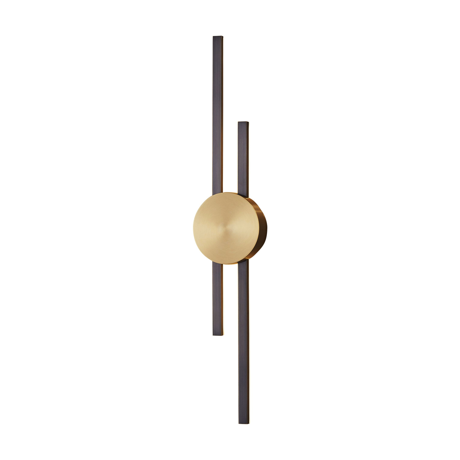 Minimalistyczny kinkiet CENTRO LED składa się z dwóch smukłych czarnych rurek, połączonych w centralnym punkcie eleganckim, złotym kółkiem pełniącym rolę mocowania do ściany. Prosta forma w połączeniu z kontrastującym akcentem sprawia, że lampa prezentuje się nowocześnie i stylowo.