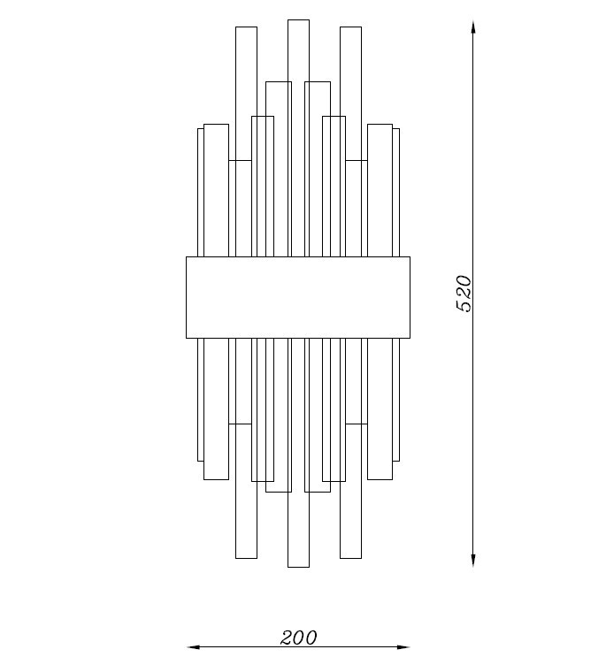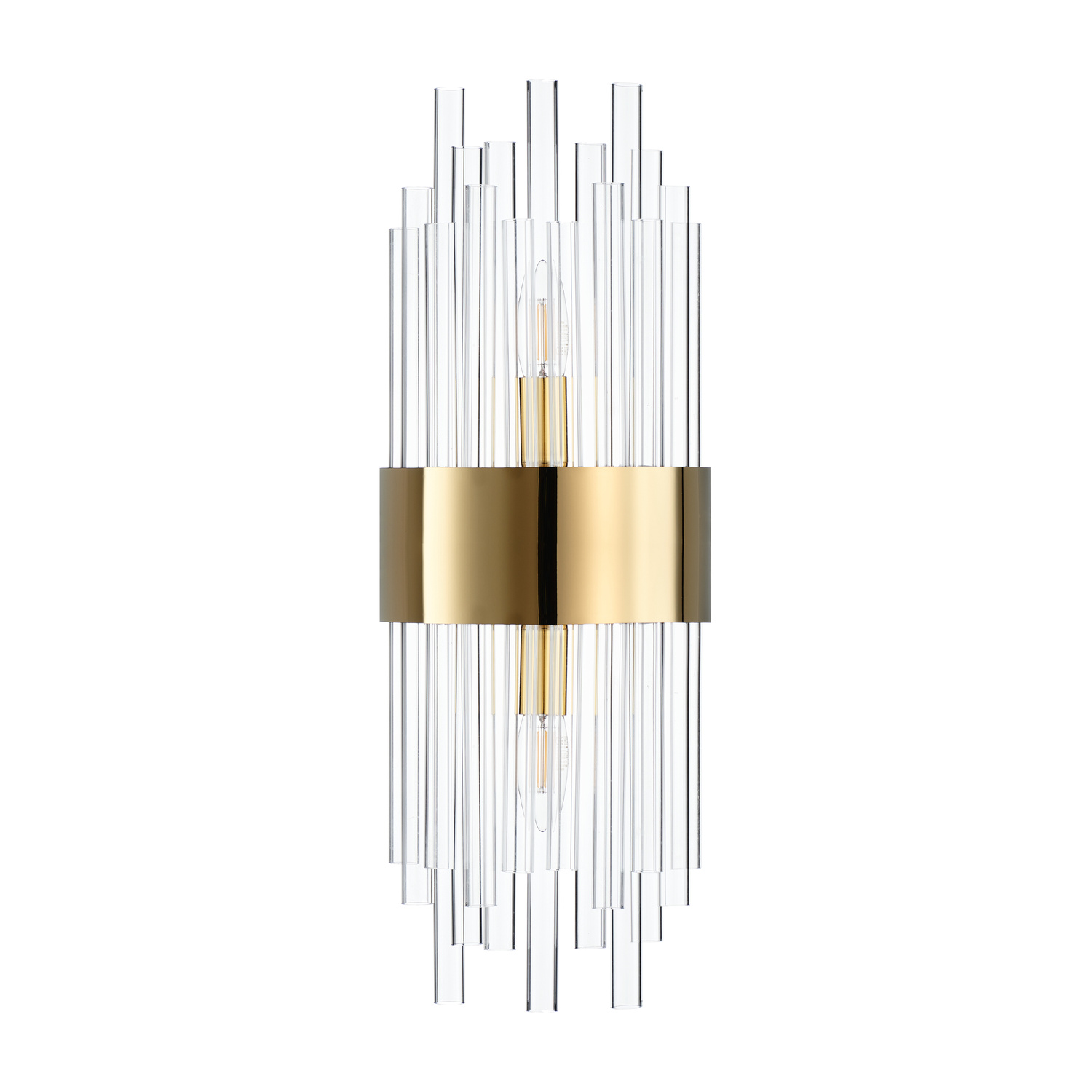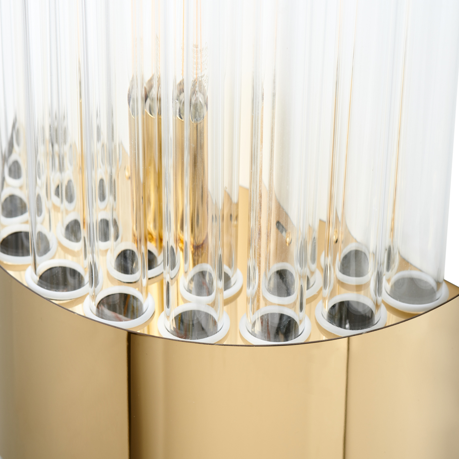 Kinkiet ma bardzo interesujący kształt. Składa się z wielu cienkich, szklanych rurek, które są ułożone pionowo i są przepasanych złotą opaską tworzą efektowną kompozycję