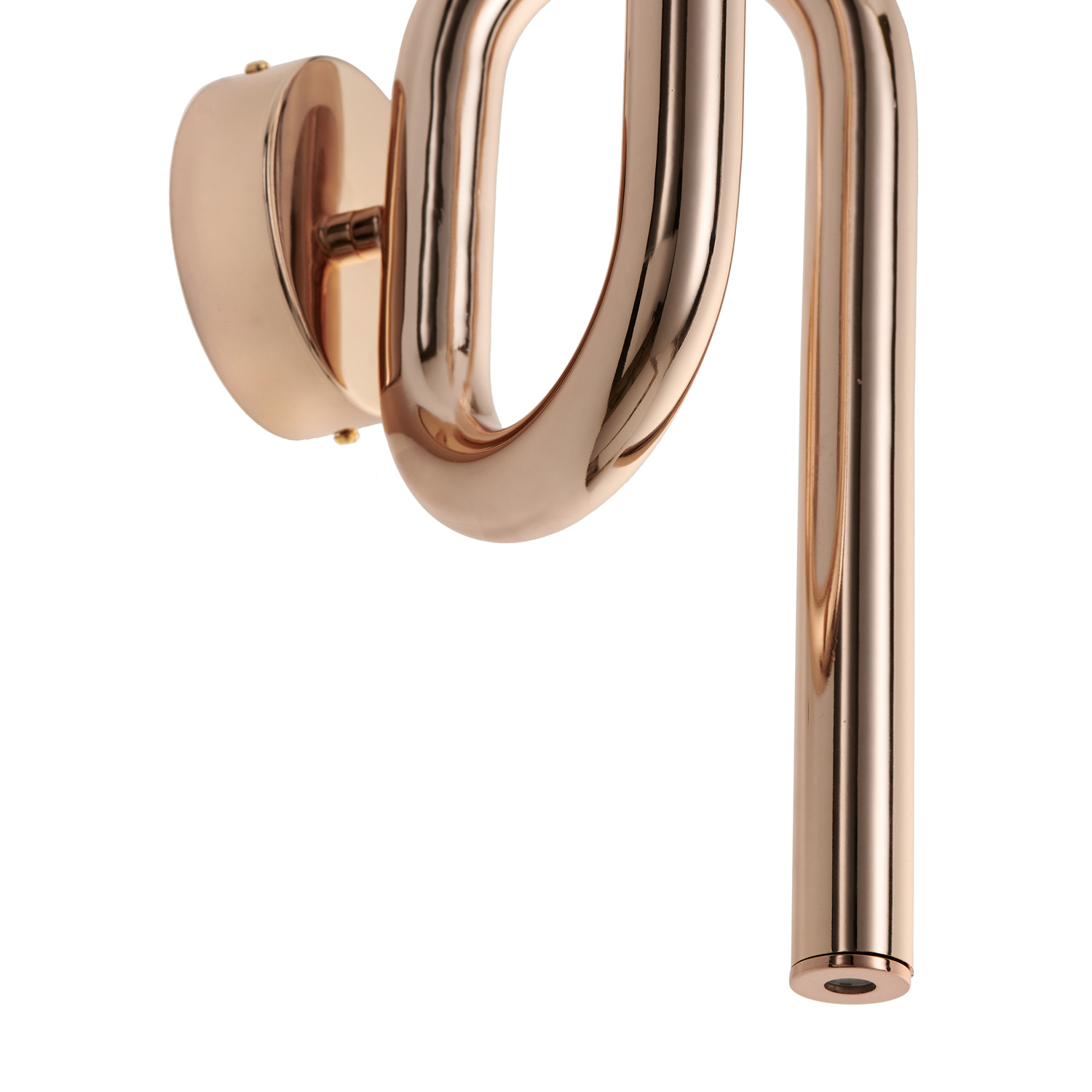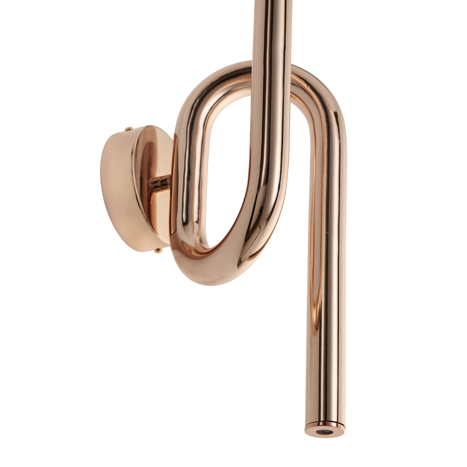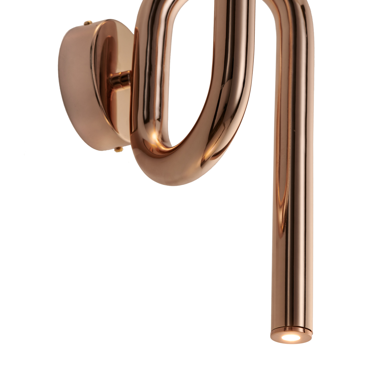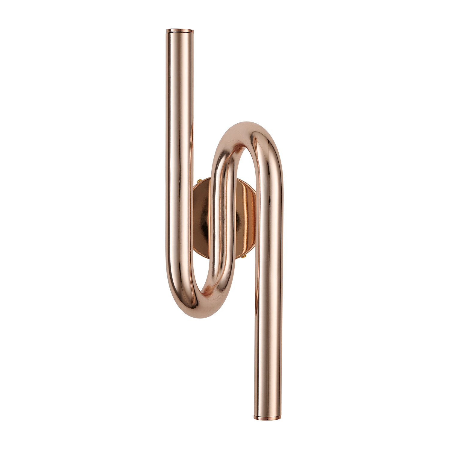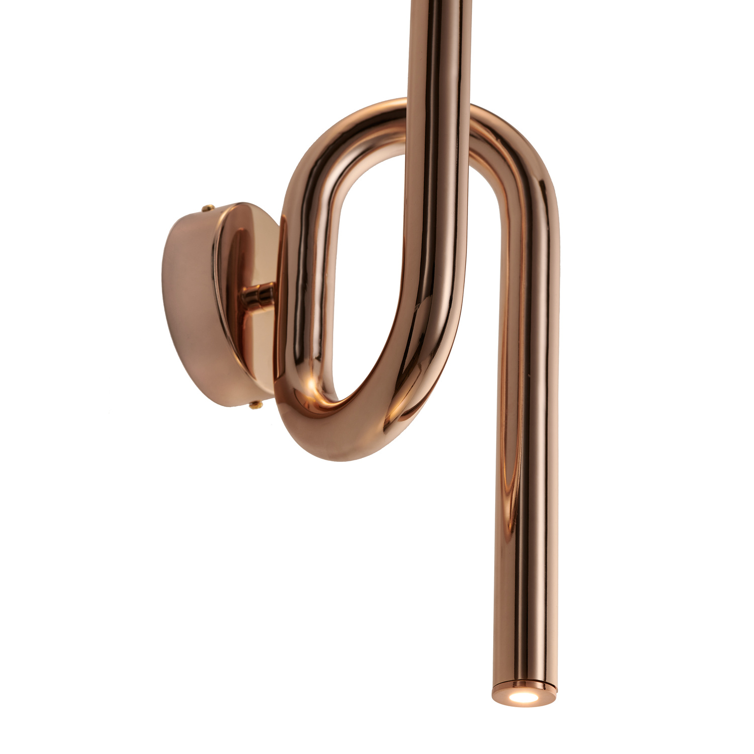 Lampa ścienna MYK o niezwykłej formie skręconej linii w kolorze polerowanej miedzi to prawdziwe dzieło sztuki użytkowej, która przyciąga wzrok i dodaje wnętrzu dynamiki.