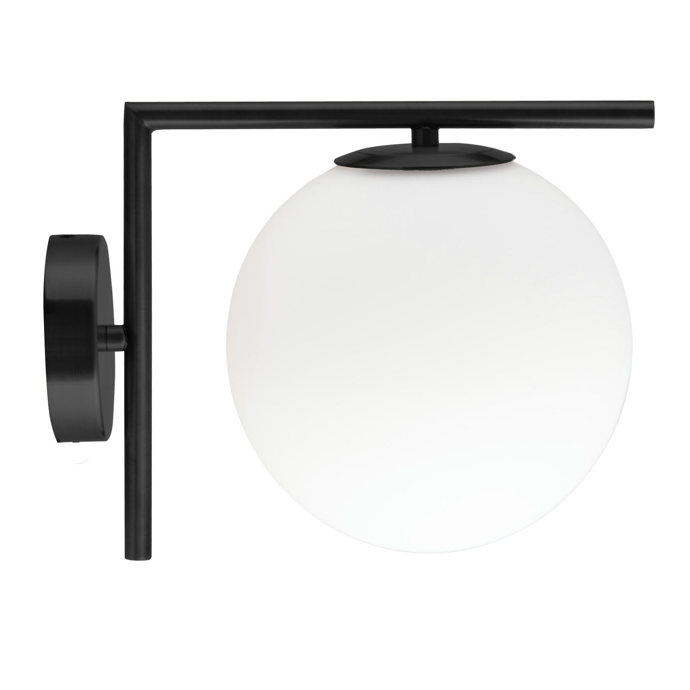 Klosz wykonany z satynowego mlecznego szkła zamontowanego na minimalistycznej konstrukcji w kolorze czarnym.