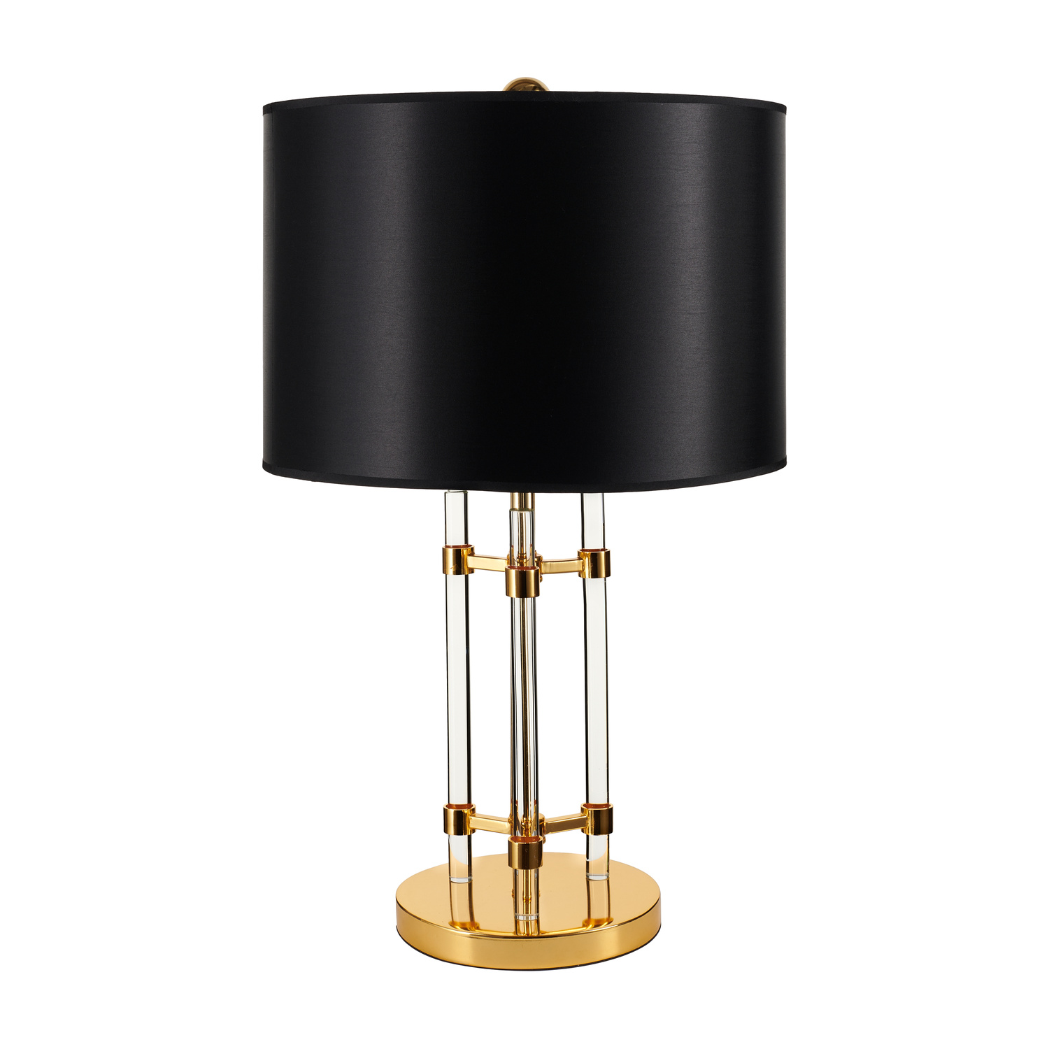 Klosz lampy, pokryty satynowym materiałem, nadaje wnętrzu miękkiego, rozproszonego światła. Jego elegancka, czarna barwa idealnie komponuje się z lustrzaną, złotą podstawą.