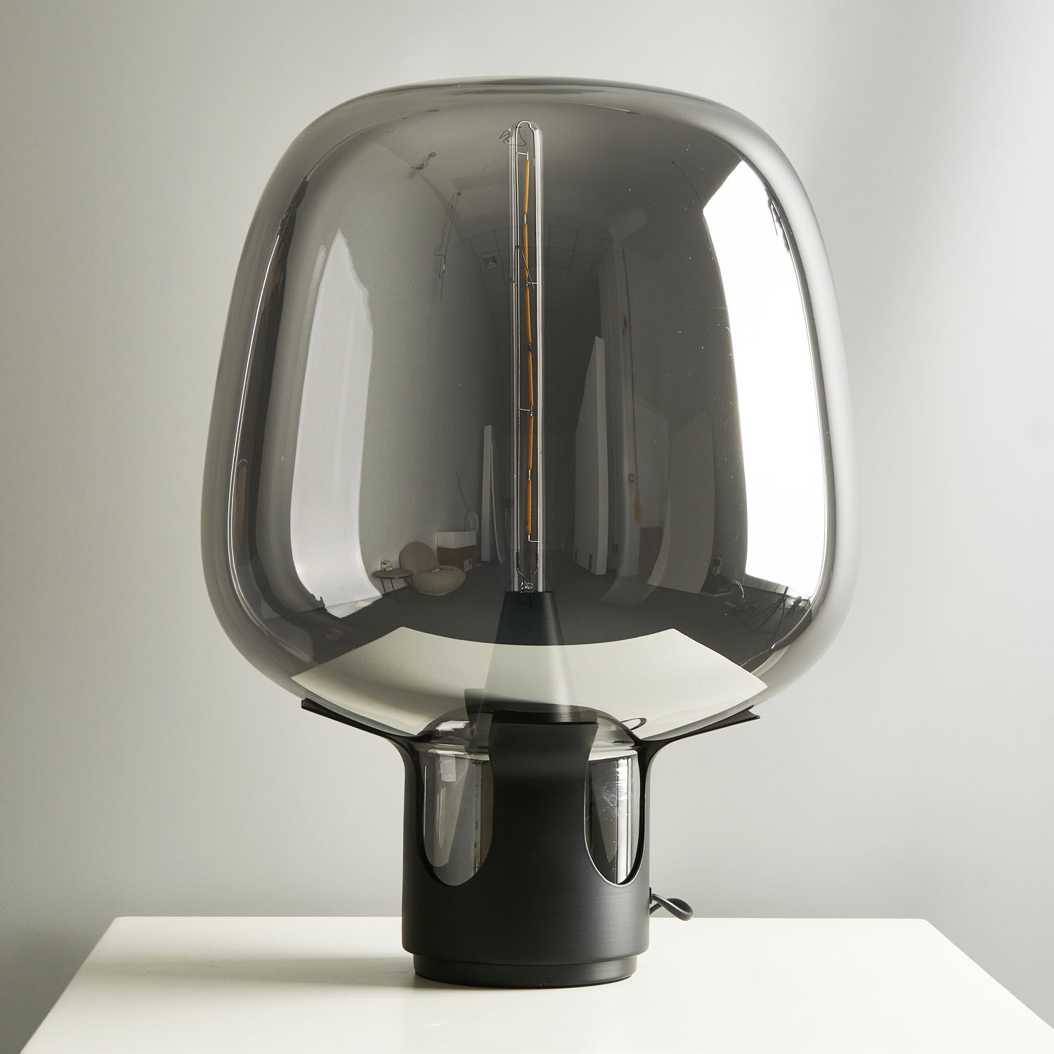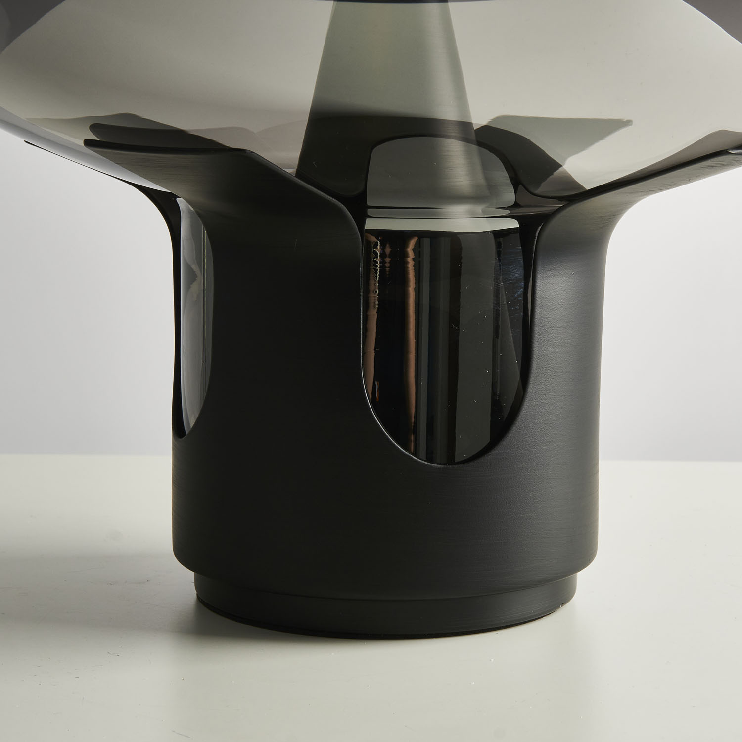 Lampa stołowa FATA z dużym kloszem z przydymionego szkła i metalową podstawą to elegancki i nowoczesny dodatek do każdego wnętrza. Jej unikalny design, łączący w sobie delikatność szkła z solidnością metalowej podstawy, nadaje pomieszczeniu subtelnego charakteru.