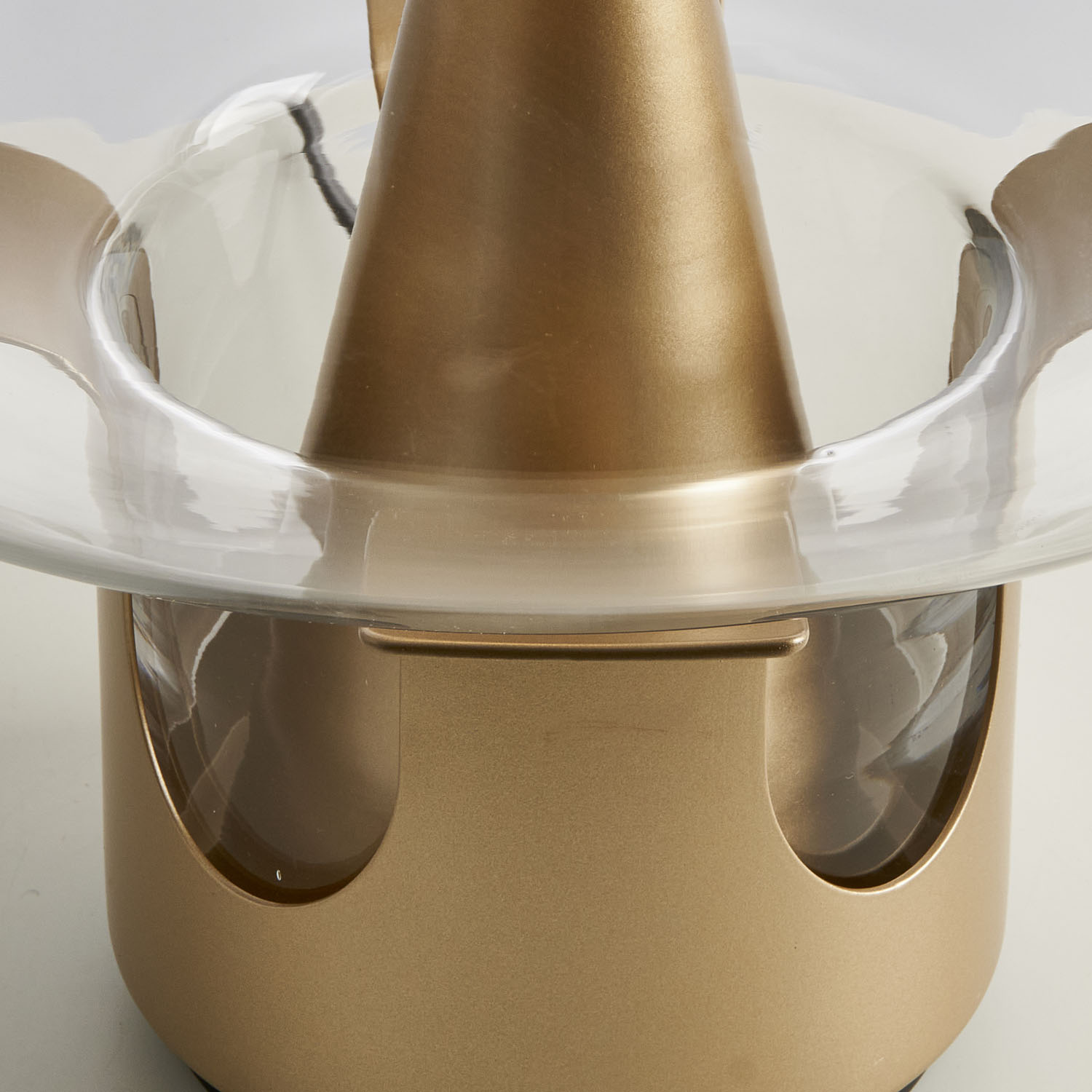 Poznaj lampę stołową FATA, która doda Twojemu wnętrzu niezwykłego charakteru. Połączenie dużego, eleganckiego szklanego klosza i złotej metalowej podstawy tworzy harmonijną kompozycję, która przyciąga wzrok.