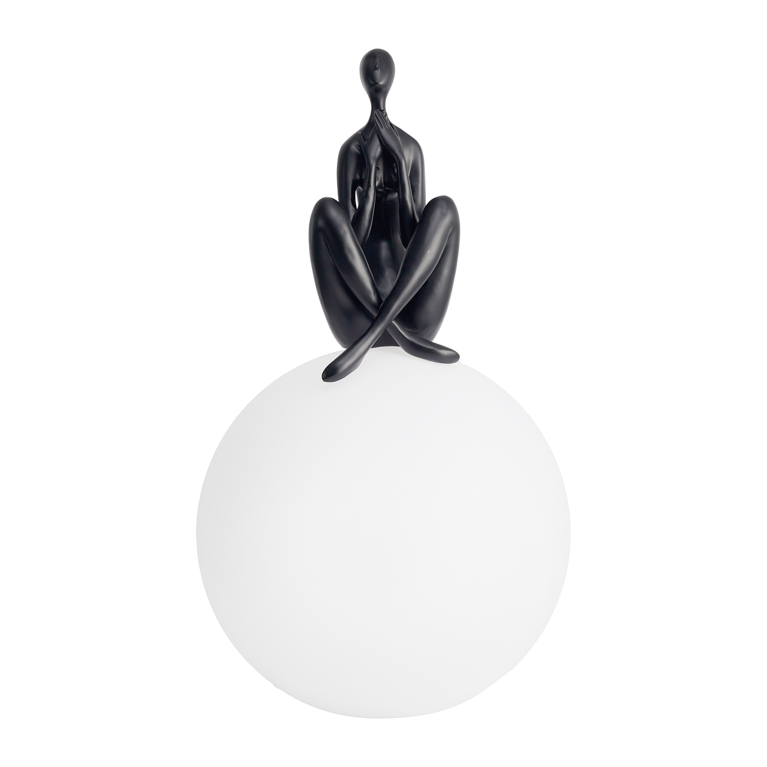 Lampa stołowa WOMAN-3 ma kulisty klosz wykonany z wysokogatunkowego tworzywa, na której spoczywa zadumana postać kobiety wykonana z włókna szklanego w kolorze czarnym.