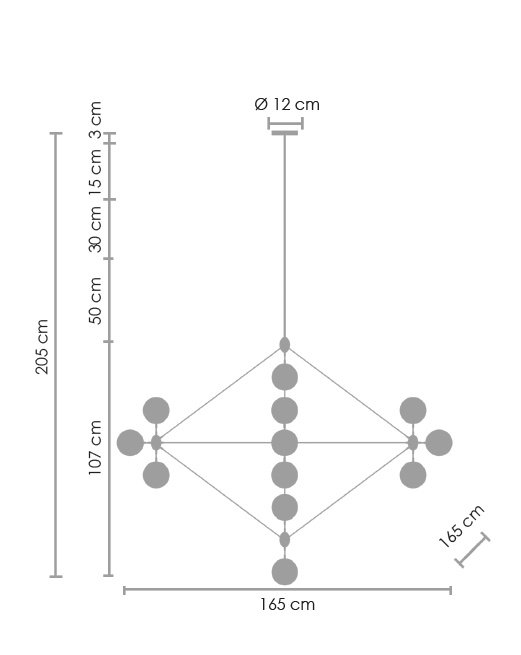 Konstrukcja jest na planie trójkąta, stelaż w kolorze czarnym matowym z okrągłymi, bursztynowymi kloszami.