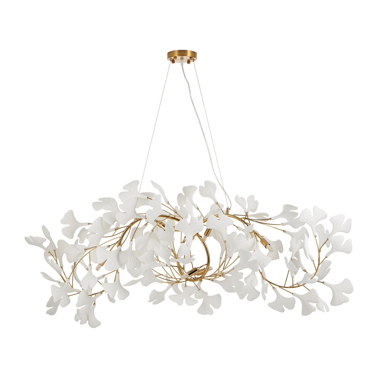 Lampa BOTANIKA WAVE ma metalowy stelaż w kolorze polerowanego złota oraz białe listki w stylu liści Ginkgo, które wykonano z białej ceramiki w matowym wykończeniu.