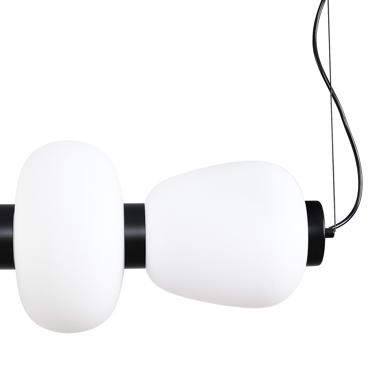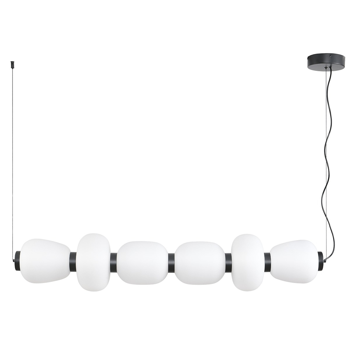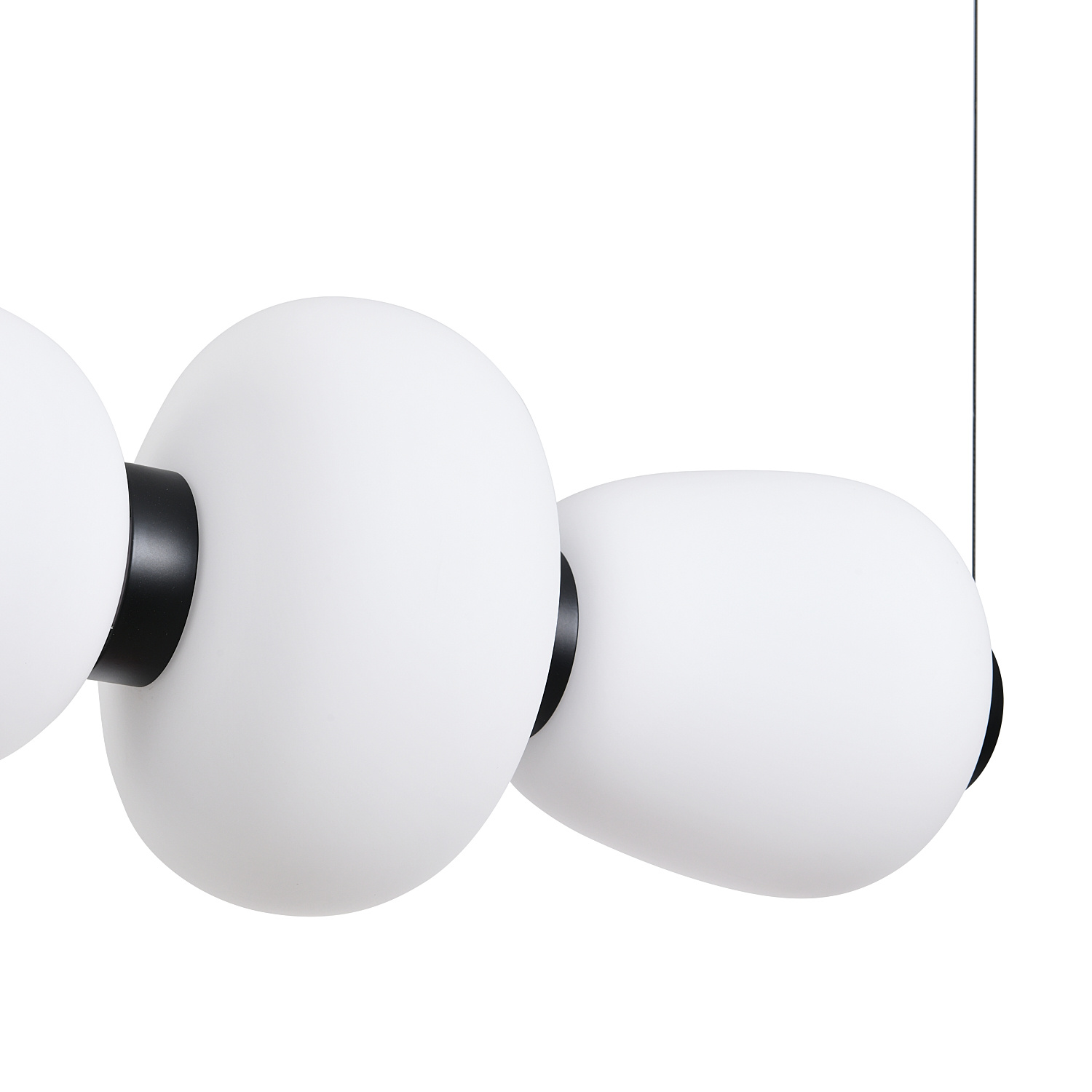 Nowoczesna i minimalistyczna lampa wisząca BRILLA o liniowej konstrukcji, składająca się z sześciu białych, kloszy kształtem przypominającym kamienie, połączonych czarnymi pierścieniami z metalu.