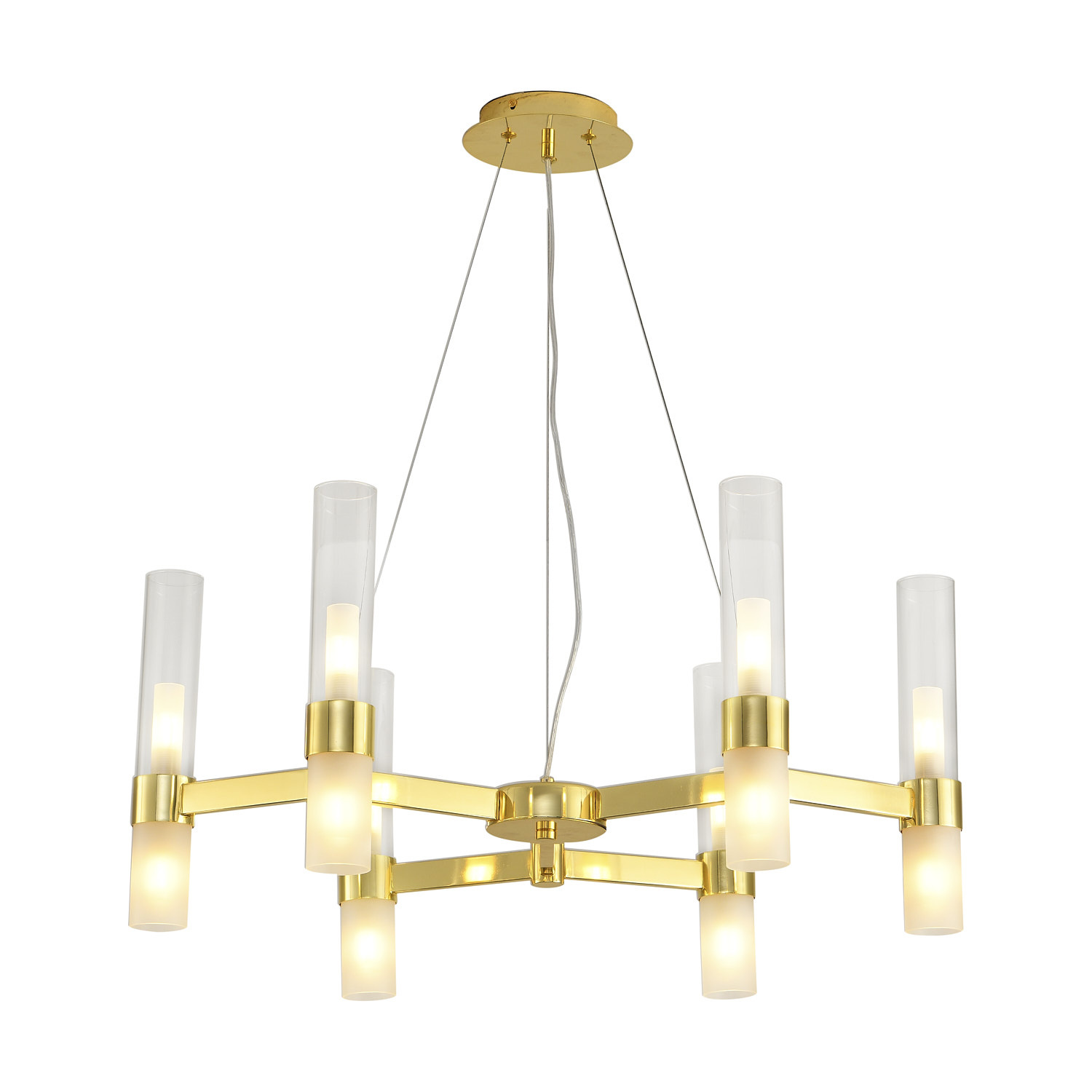Sześcioramienna, luksusowa lampa wisząca CANDELA-6 wykonana została z metalu w kolorze złotym oraz szklanych kloszy.