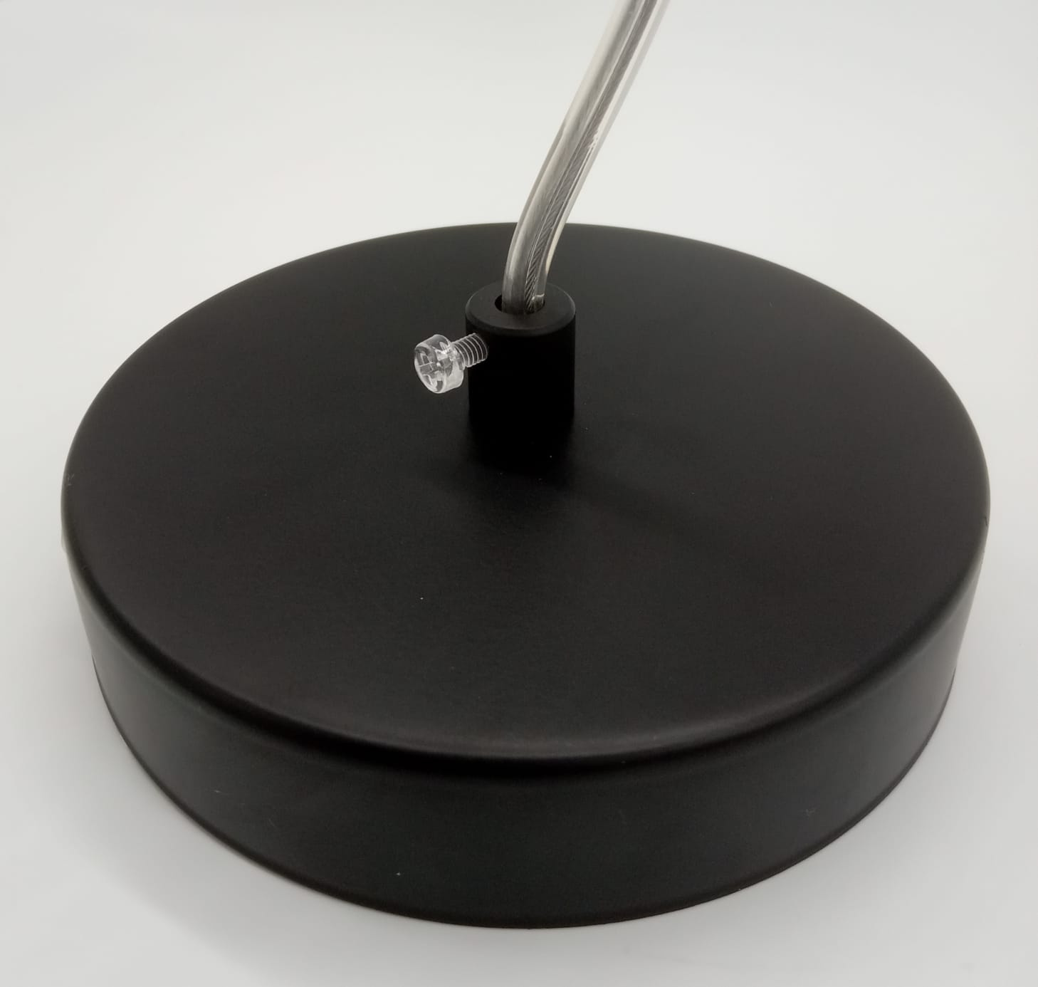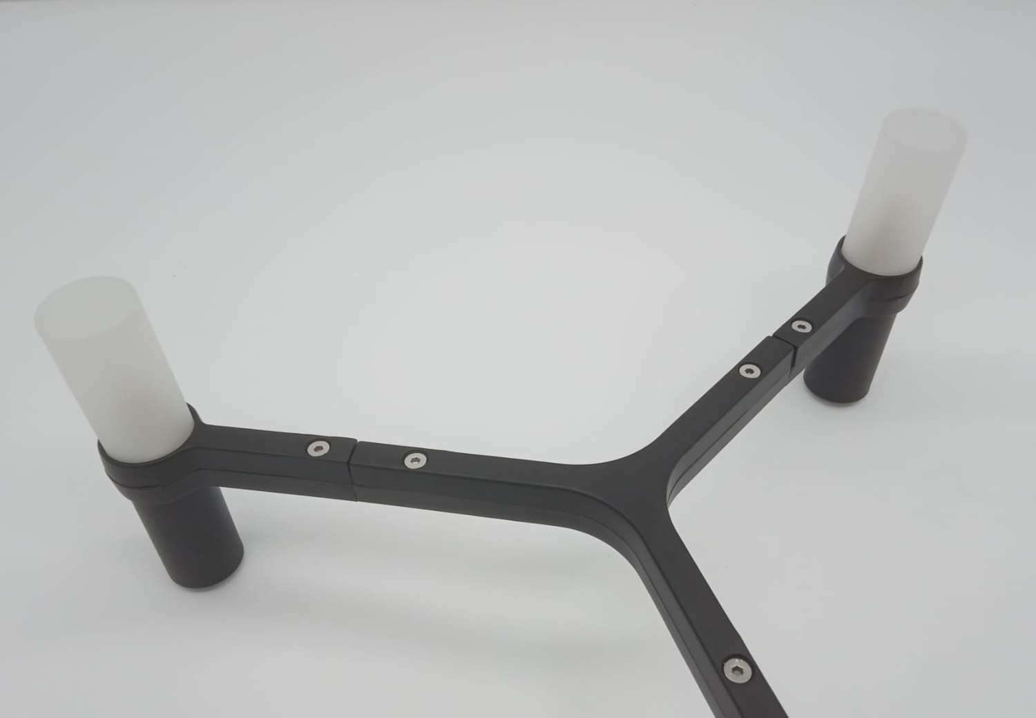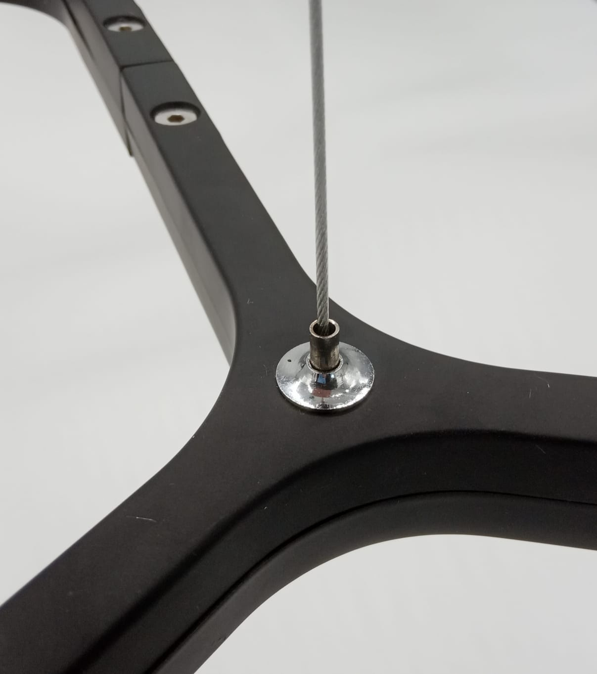 Lampa zawieszona jest na centralnie umieszczonej okrągłej podsufitce, dodatkowo po bokach wzmocniona stalowymi linkami, co zapewnia stabilność konstrukcji.