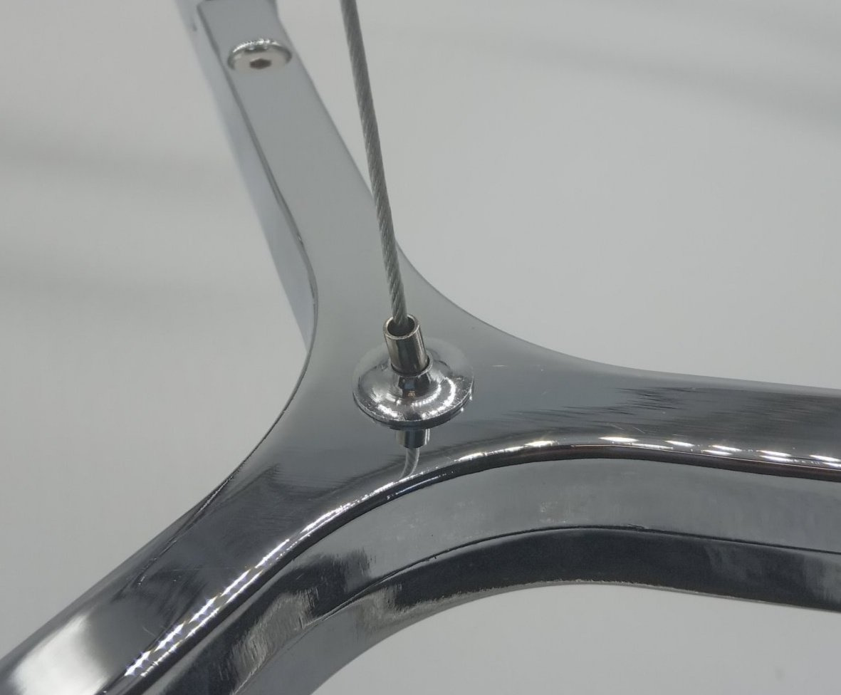 Lampa zawieszona jest na centralnie umieszczonej okrągłej podsufitce, dodatkowo po bokach wzmocniona stalowymi linkami, co zapewnia stabilność konstrukcji.