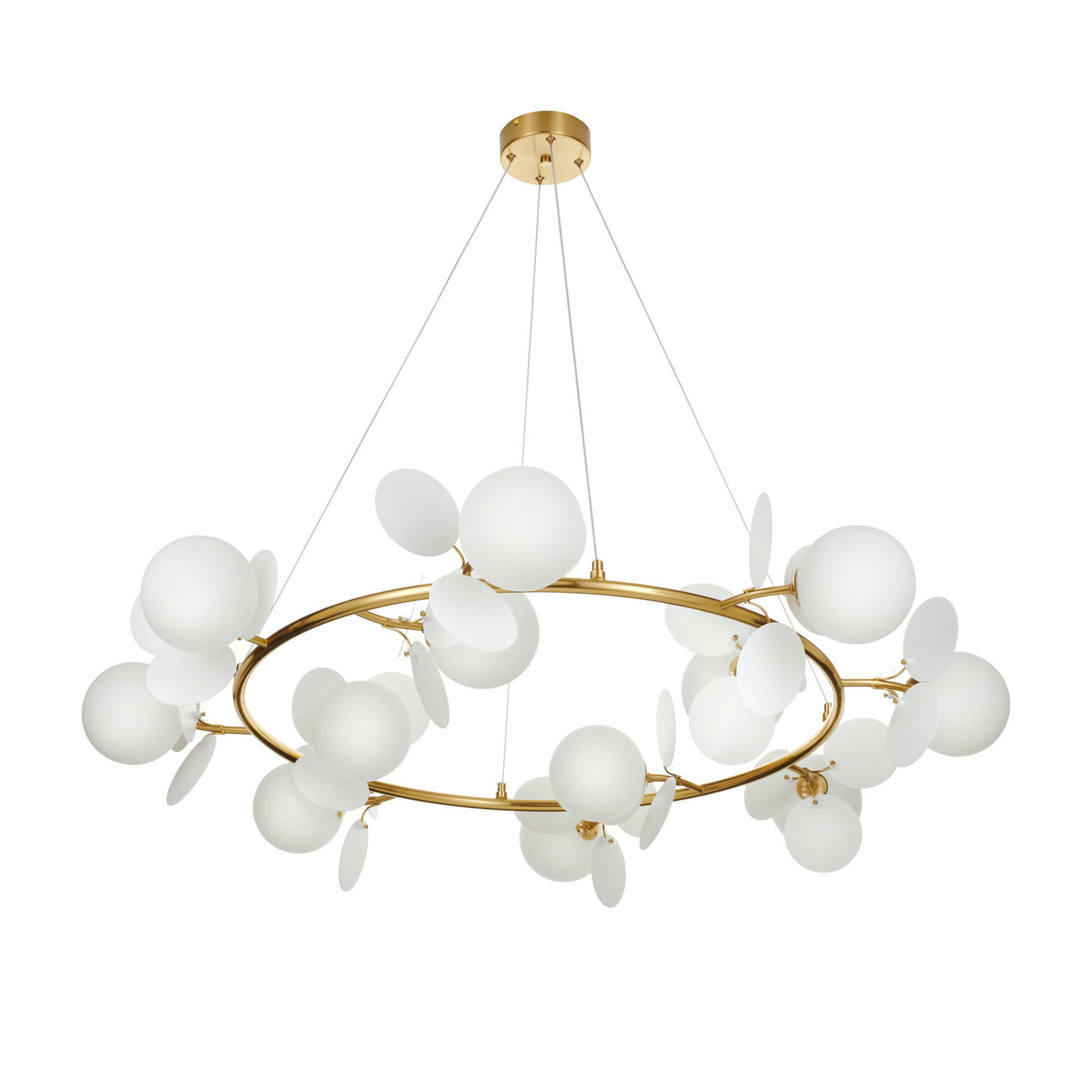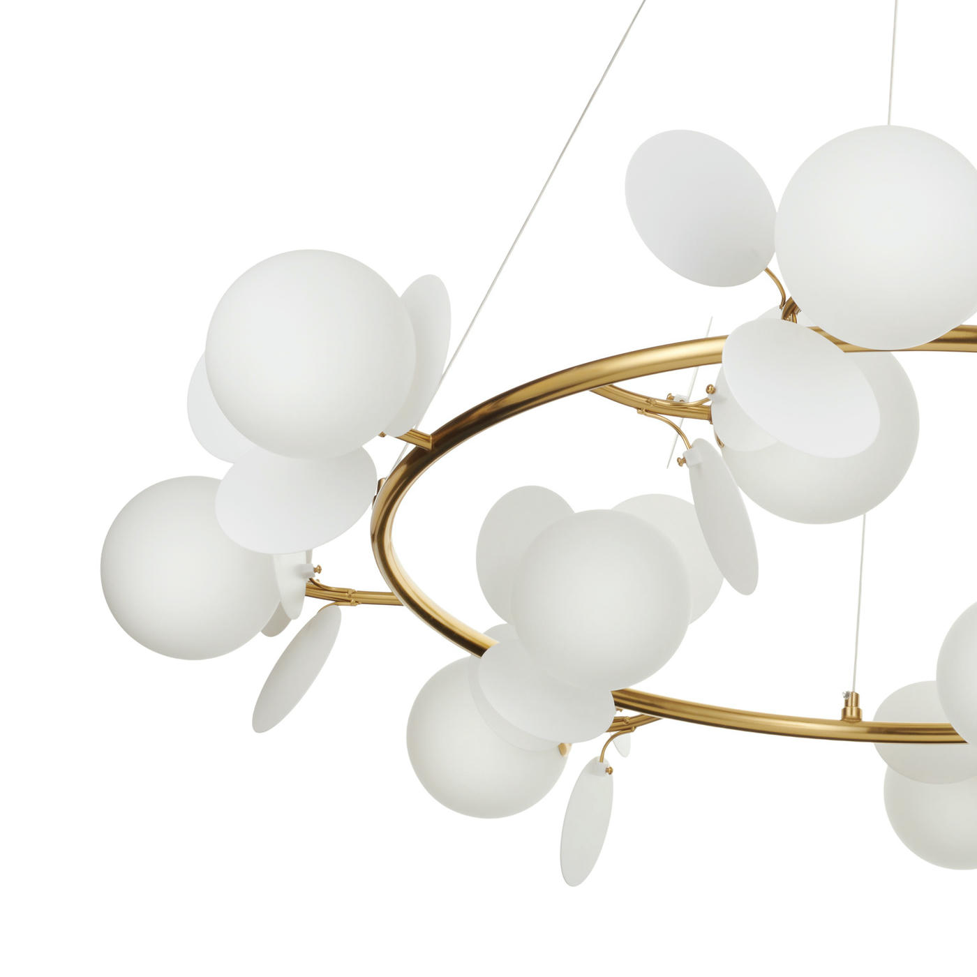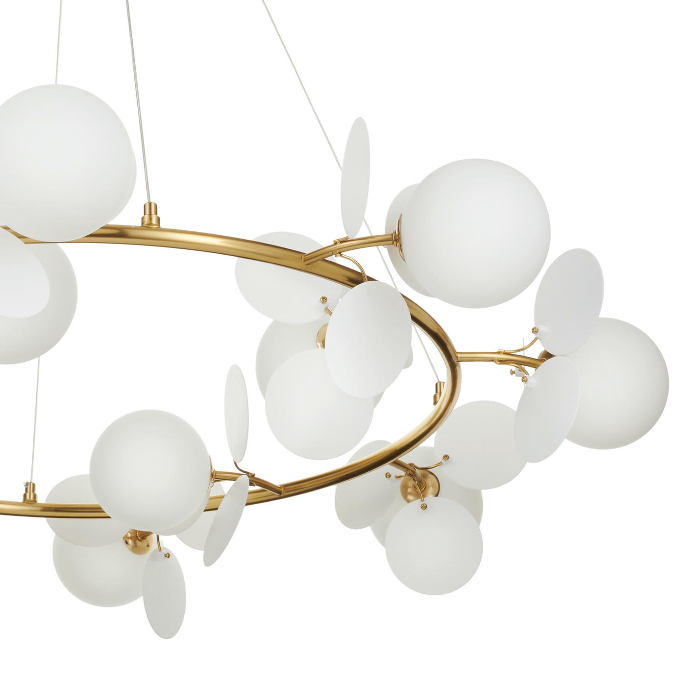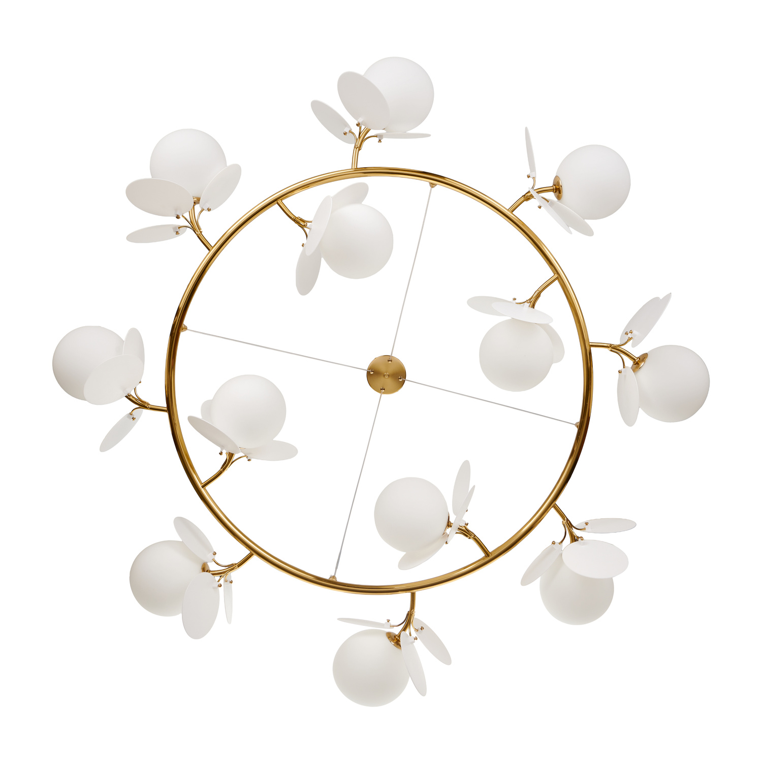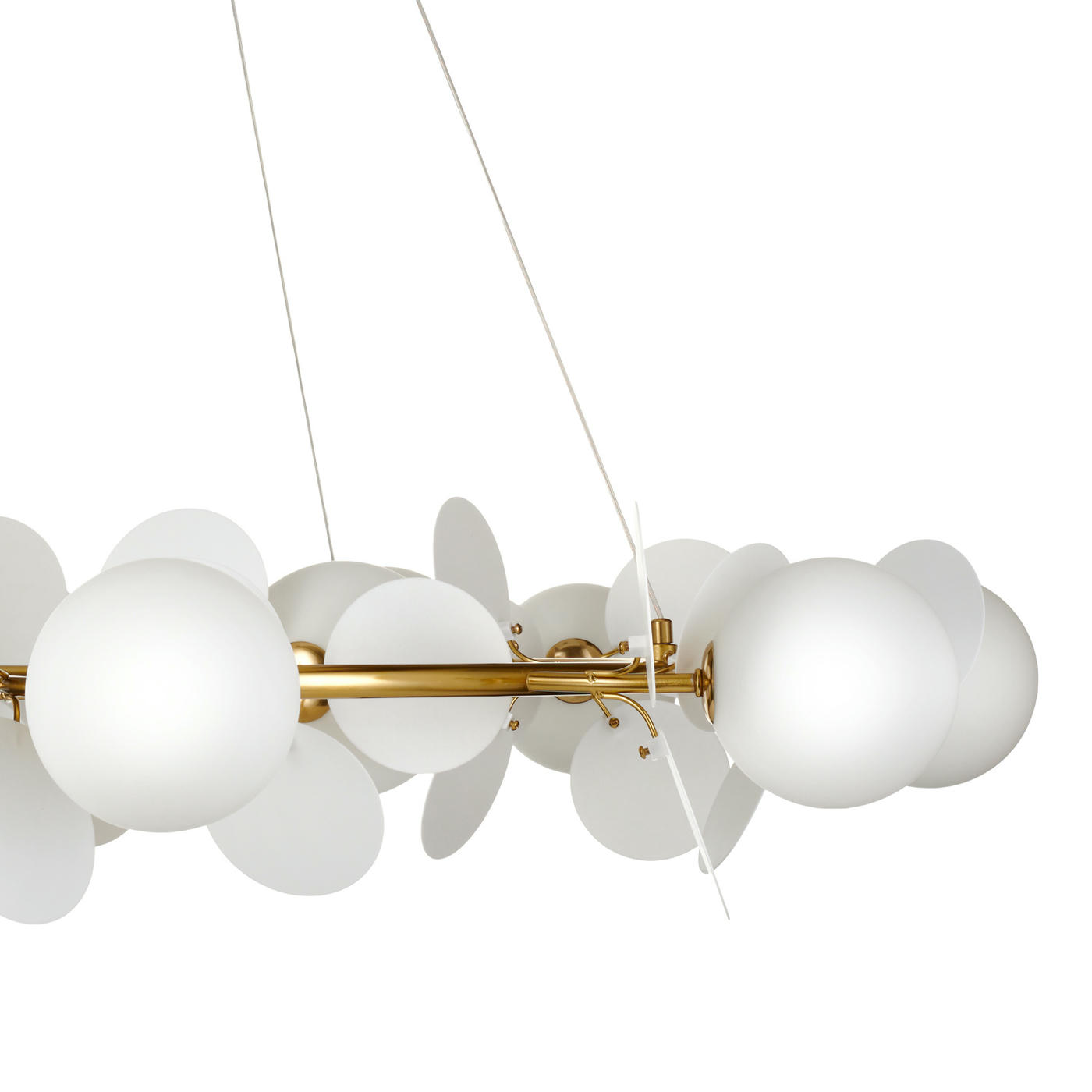 Dodatkowo, subtelne białe „płatki” przytwierdzone do obręczy i kloszy w nieregularny sposób nadają lampie lekkości, dynamiki i elegancji.