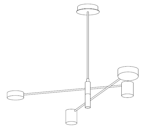 Na końcach niektórych ramion umieszczone są płaskie, okrągłe elementy oświetleniowe.