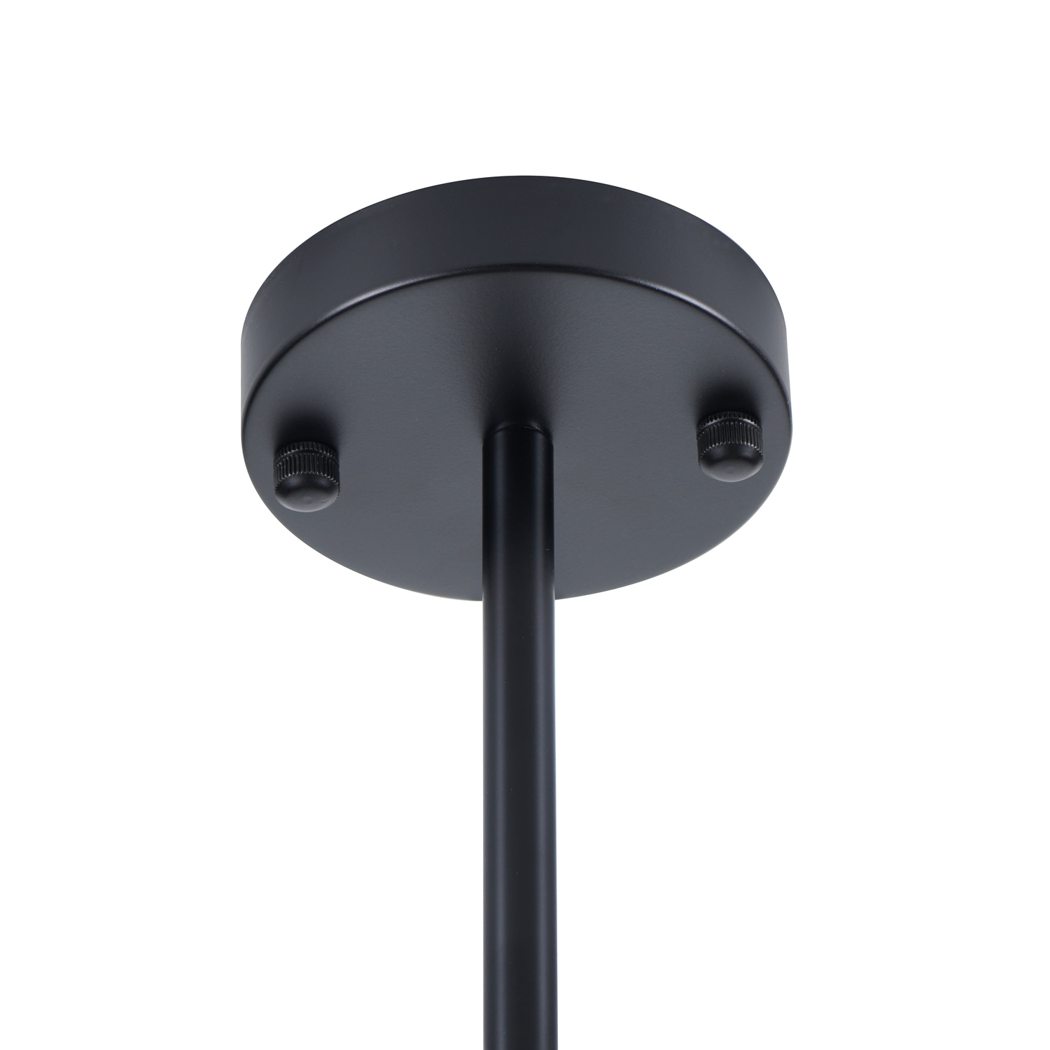 Lampa zawieszona jest na czarnej rurce, przymocowanej do okrągłej, czarnej podsufitki.