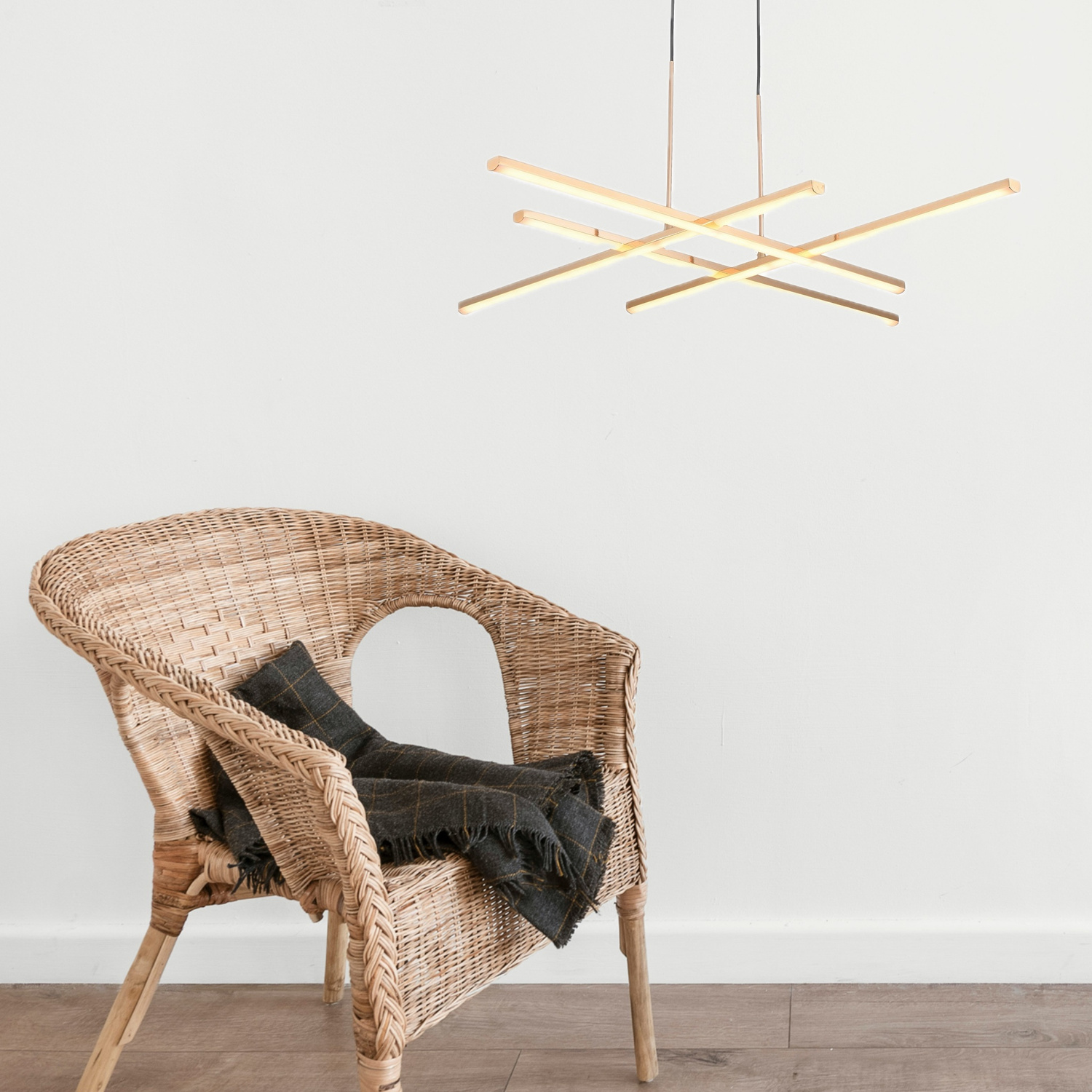 Jej minimalistyczna forma, składająca się z sześciu długich, prostych elementów świetlnych, ułożonych w nieregularny, intrygujący wzór, przypomina skrzyżowane linie, tworząc efektowną, geometryczną kompozycję kratownicy.
