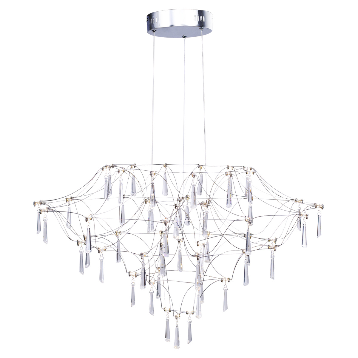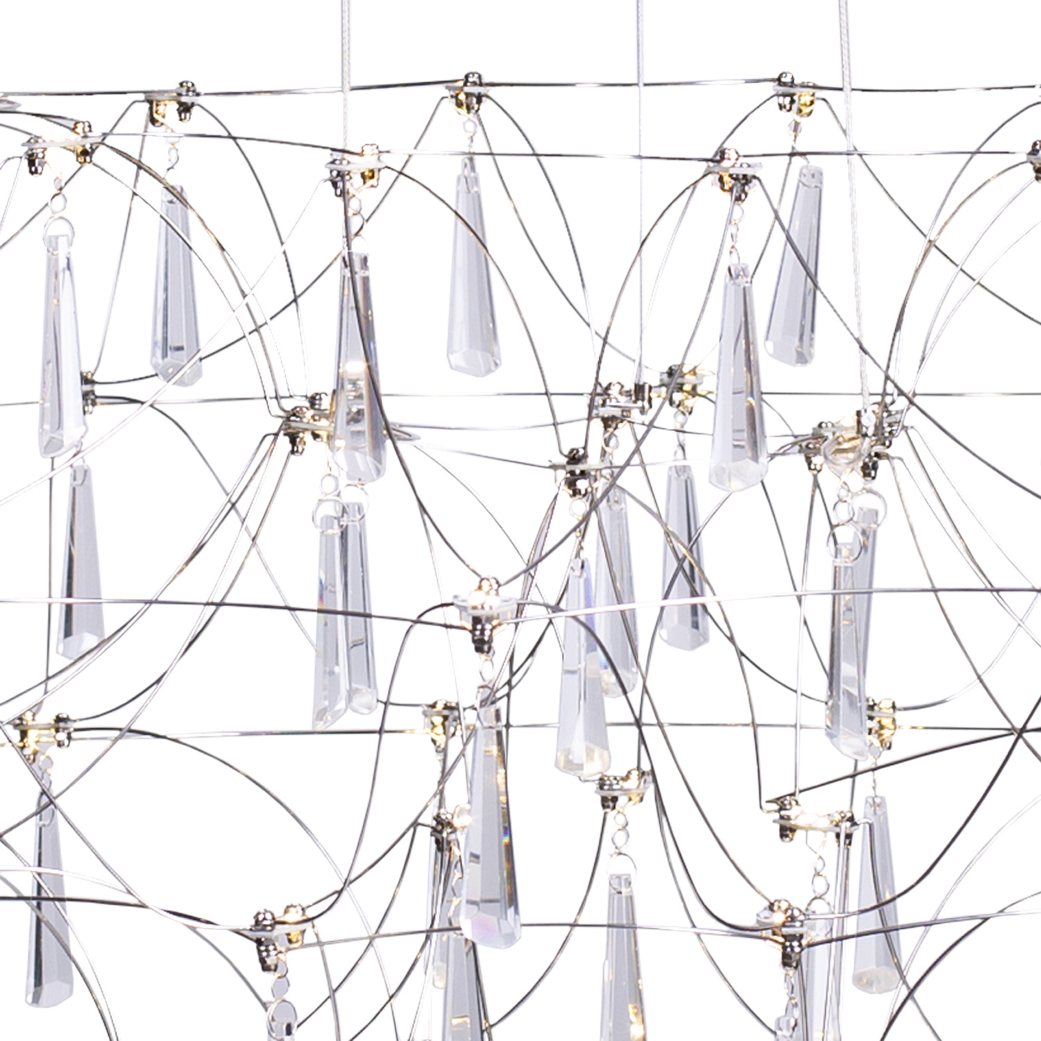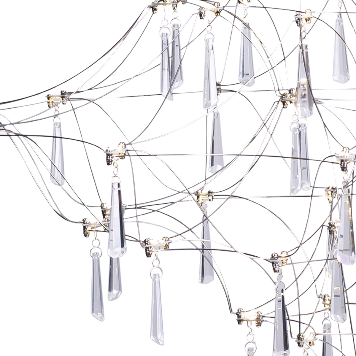 Przestrzenna i delikatna konstrukcja udekorowana jest szklanymi kryształkami odbijającymi refleksy światła. Efemeryczna pajęczynka ze stalowych, pięknie uformowanych prętów stanowi kaskadową , lekką konstrukcję dla najwyższej jakości kryształów szklanych o przeźroczystości K9.