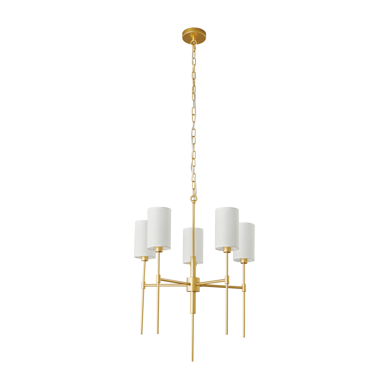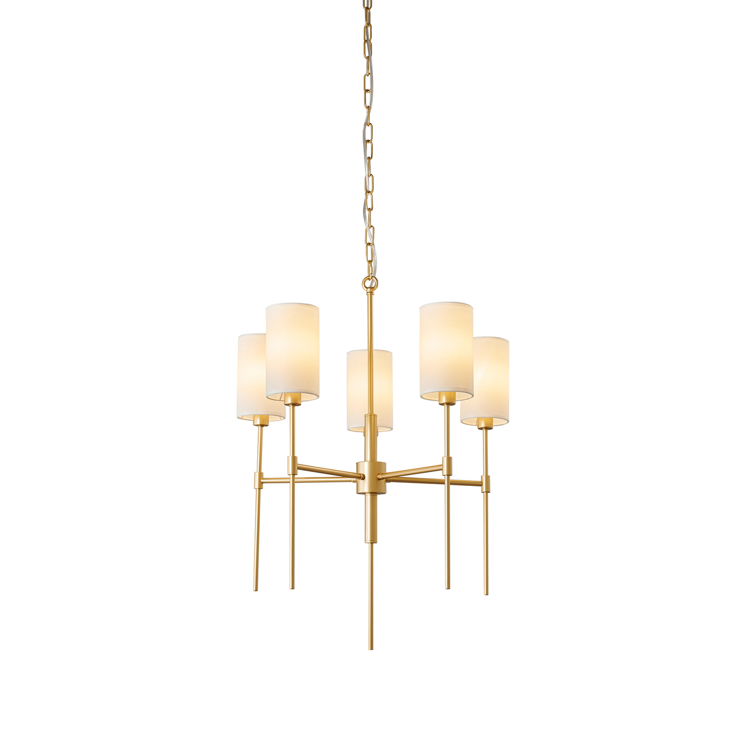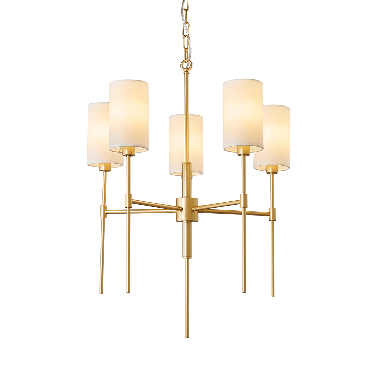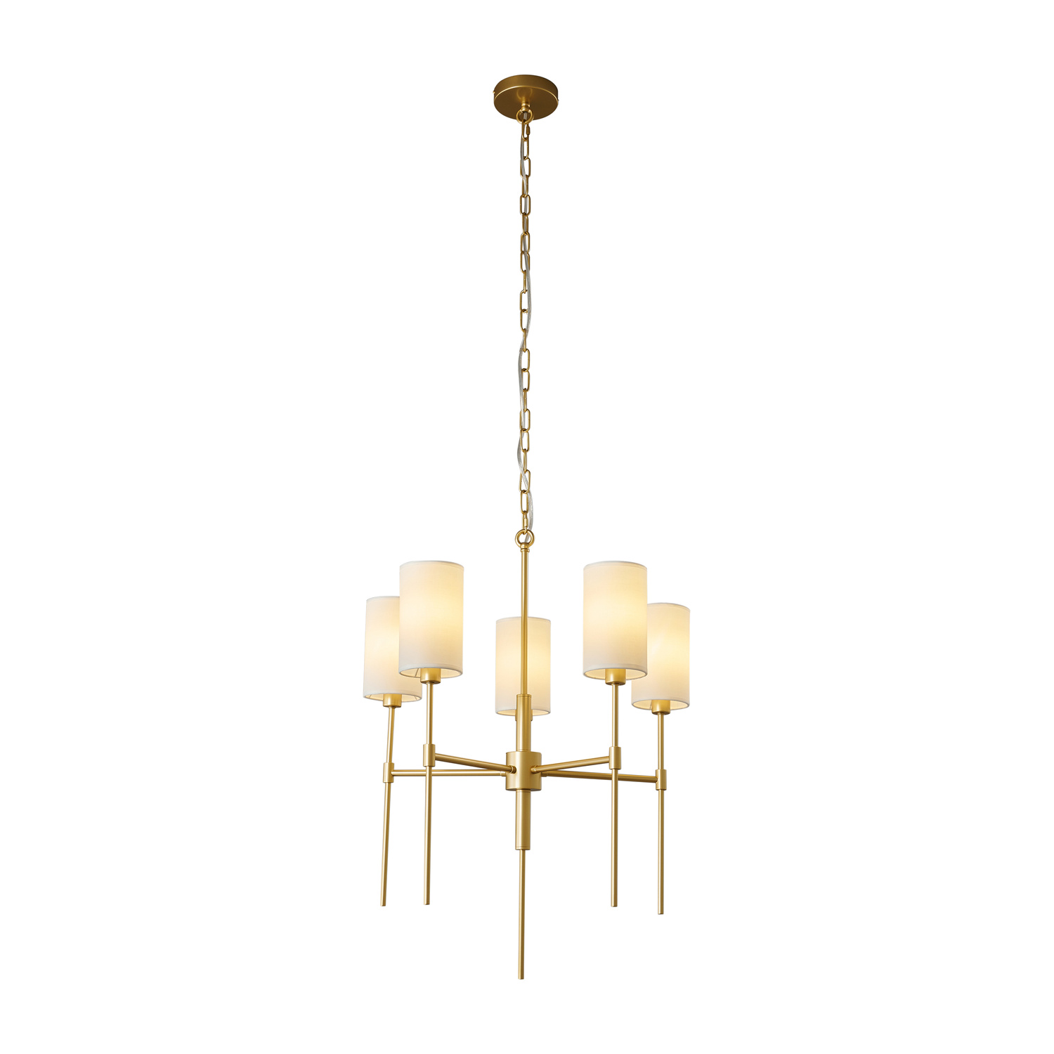 Dzięki połączeniu złotego stelaża i białych kloszy, lampa tworzy bardzo ciekawy efekt wizualny.