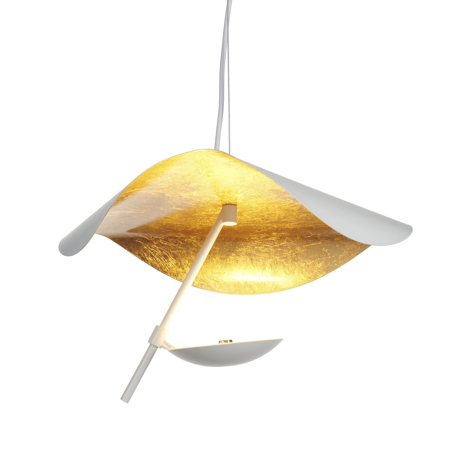Klosz ledowej lampy ENIGMA na zewnątrz pokryty jest białym matowym kolorem, a wnętrze wypełnia złota powłoka, która nadaje lampie wysublimowanego charakteru.