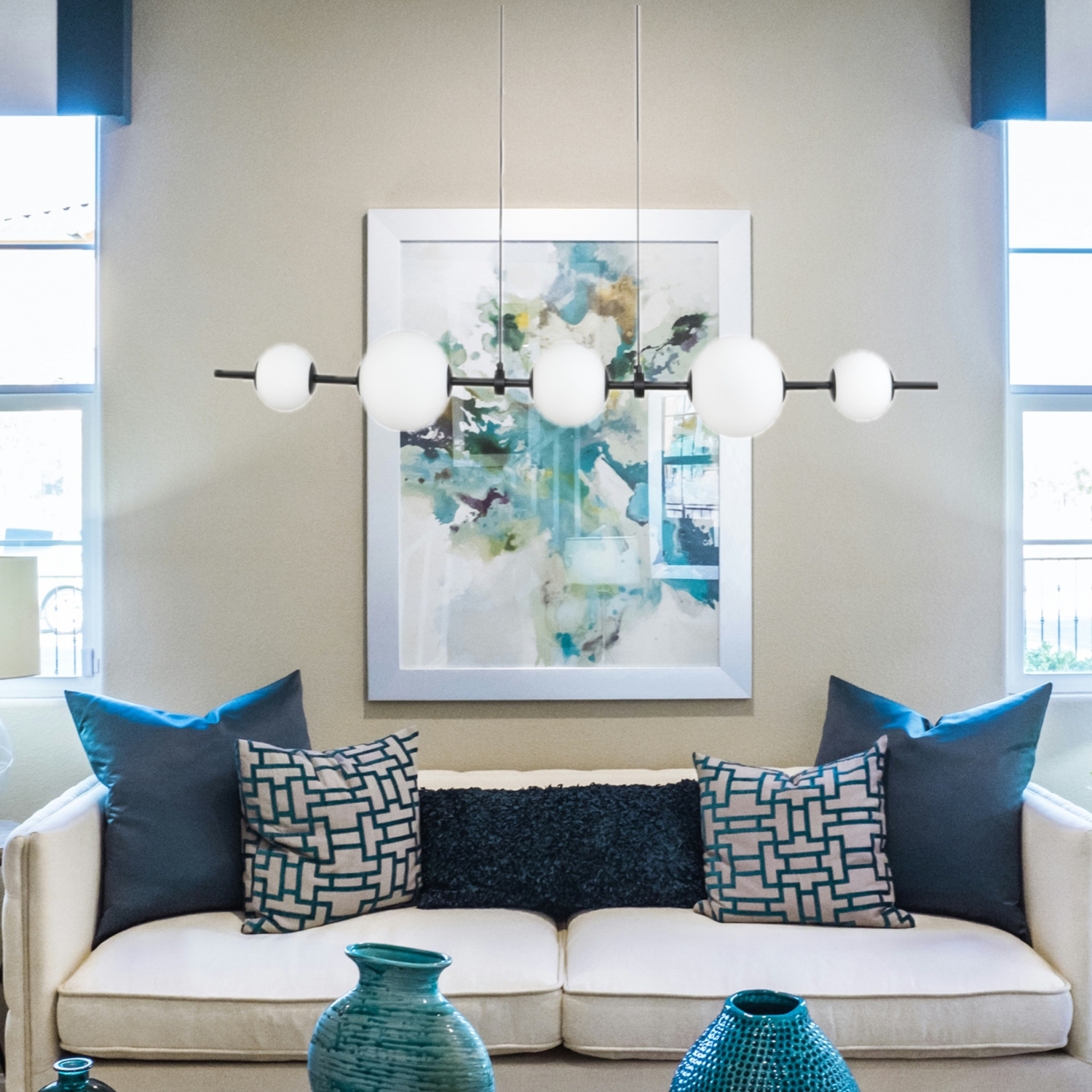 Lampa wisząca MILA z pięcioma białymi kulami będzie doskonałym uzupełnieniem nowoczesnego salonu.