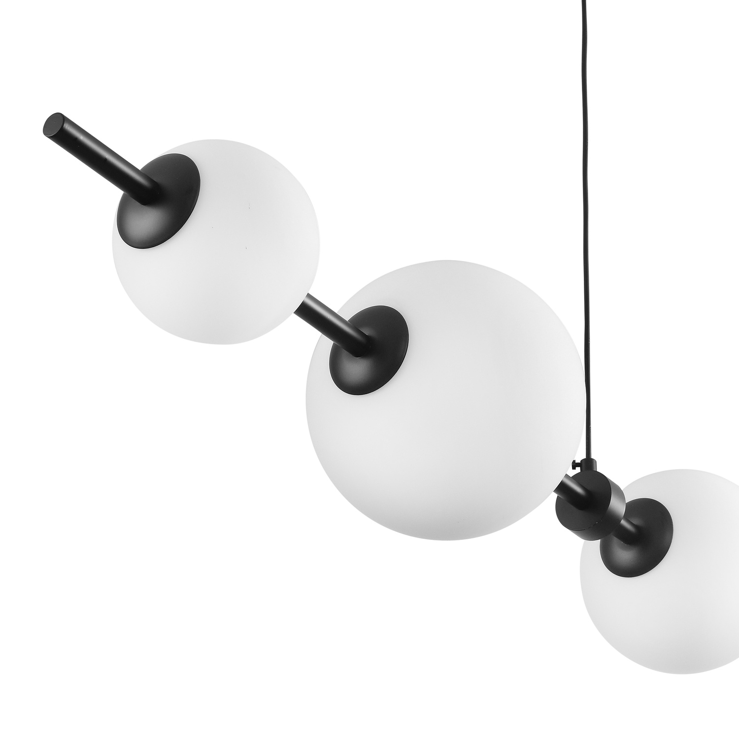 Prosta forma lampy-białe kule na czarnej listwie dodają pomieszczeniu subtelności i elegancji, jednocześnie tworząc przytulną atmosferę.